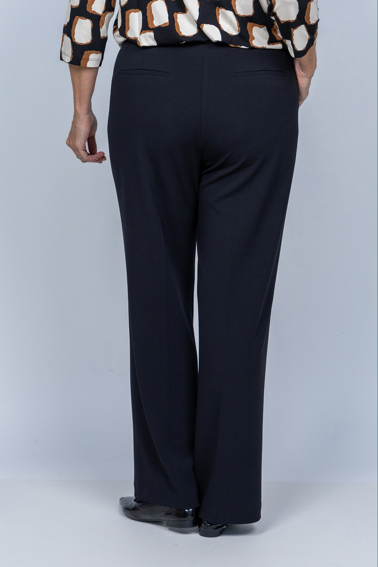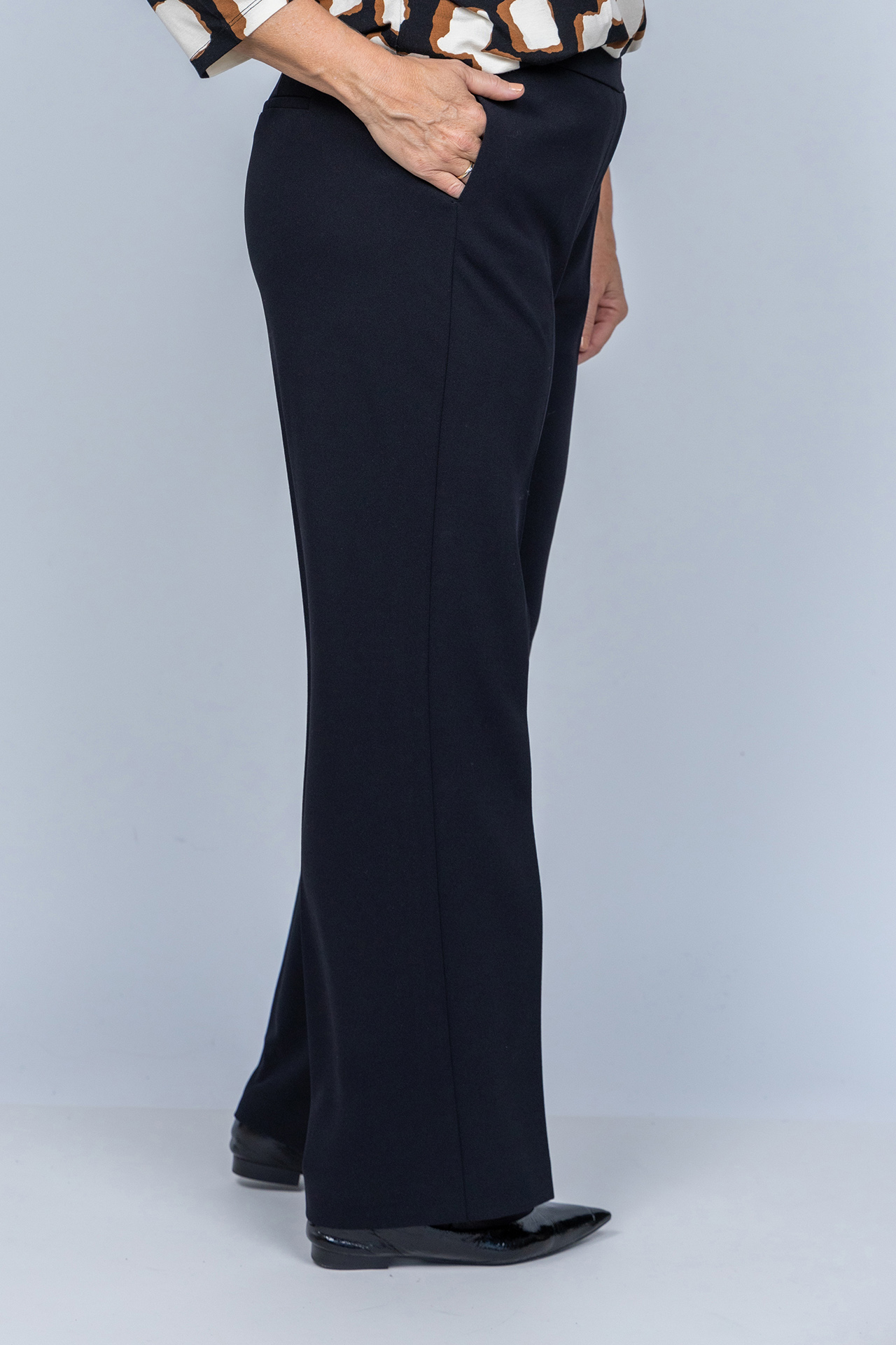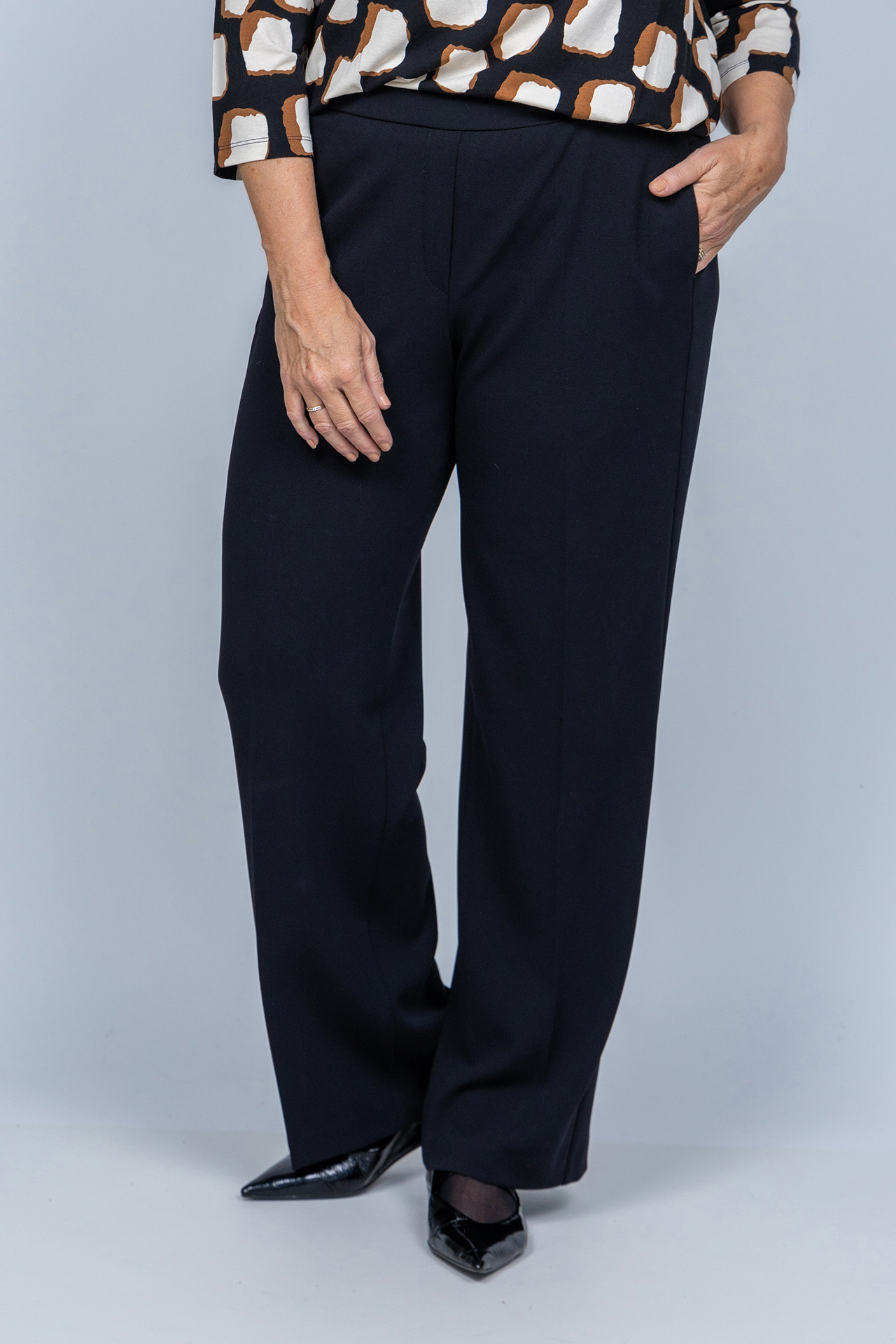 Pantalon met een elastische band in de taille, steekzakken aan de voorkant, fake zakken aan de achterkant en stretch in de stof waardoor hij comfortabel draagt
