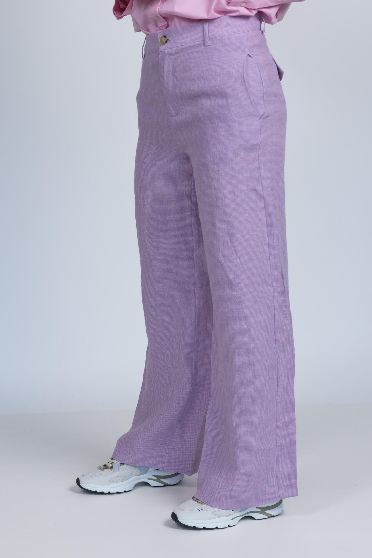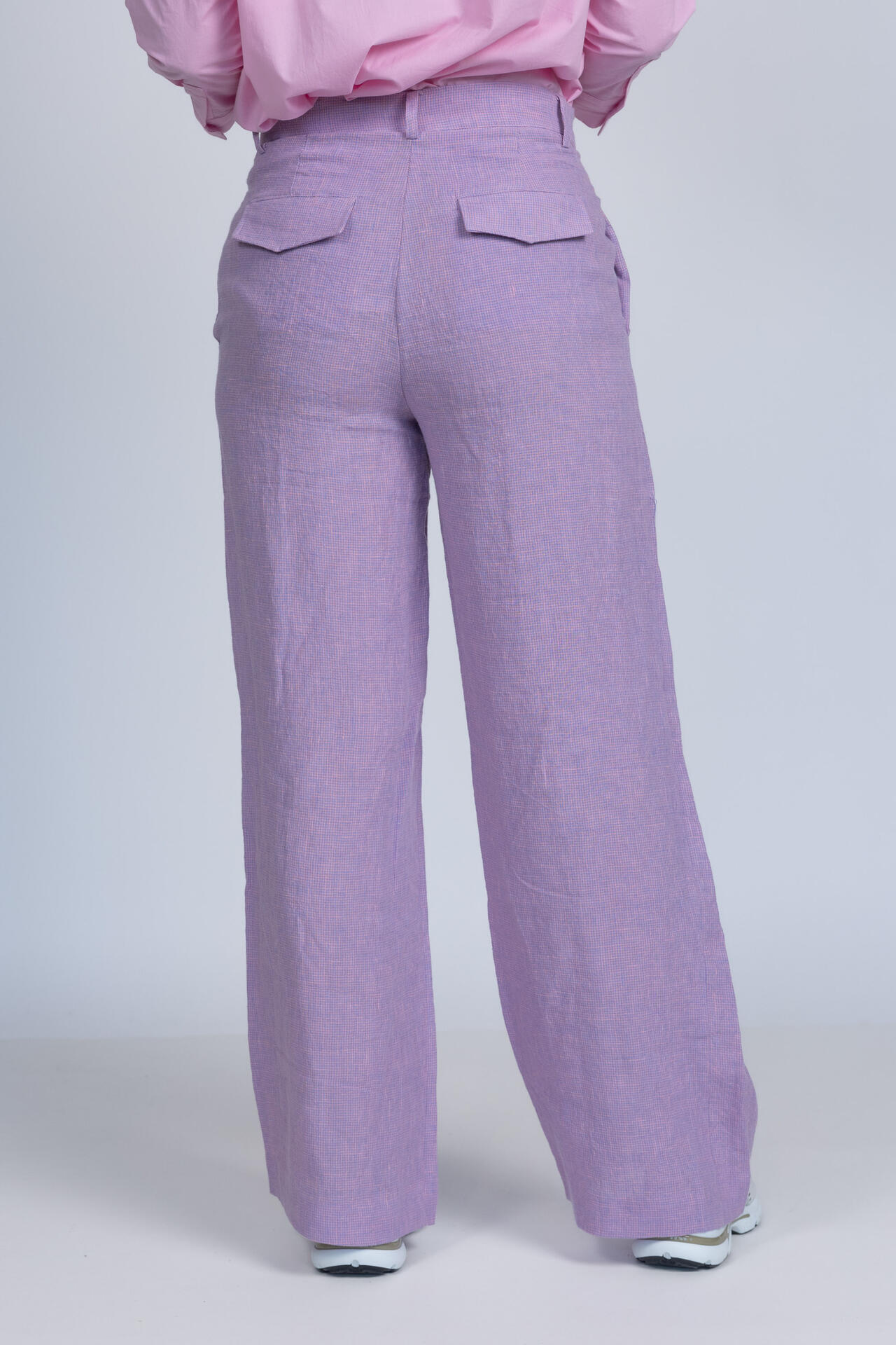 Linnen broek met een fijn ruitdessin in rose/lila. Hij heeft een knoop- en ritssluiting, lusjes in de band voor een ceintuur, steekzakken aan de voorkant en klepzakken aan de achterkant