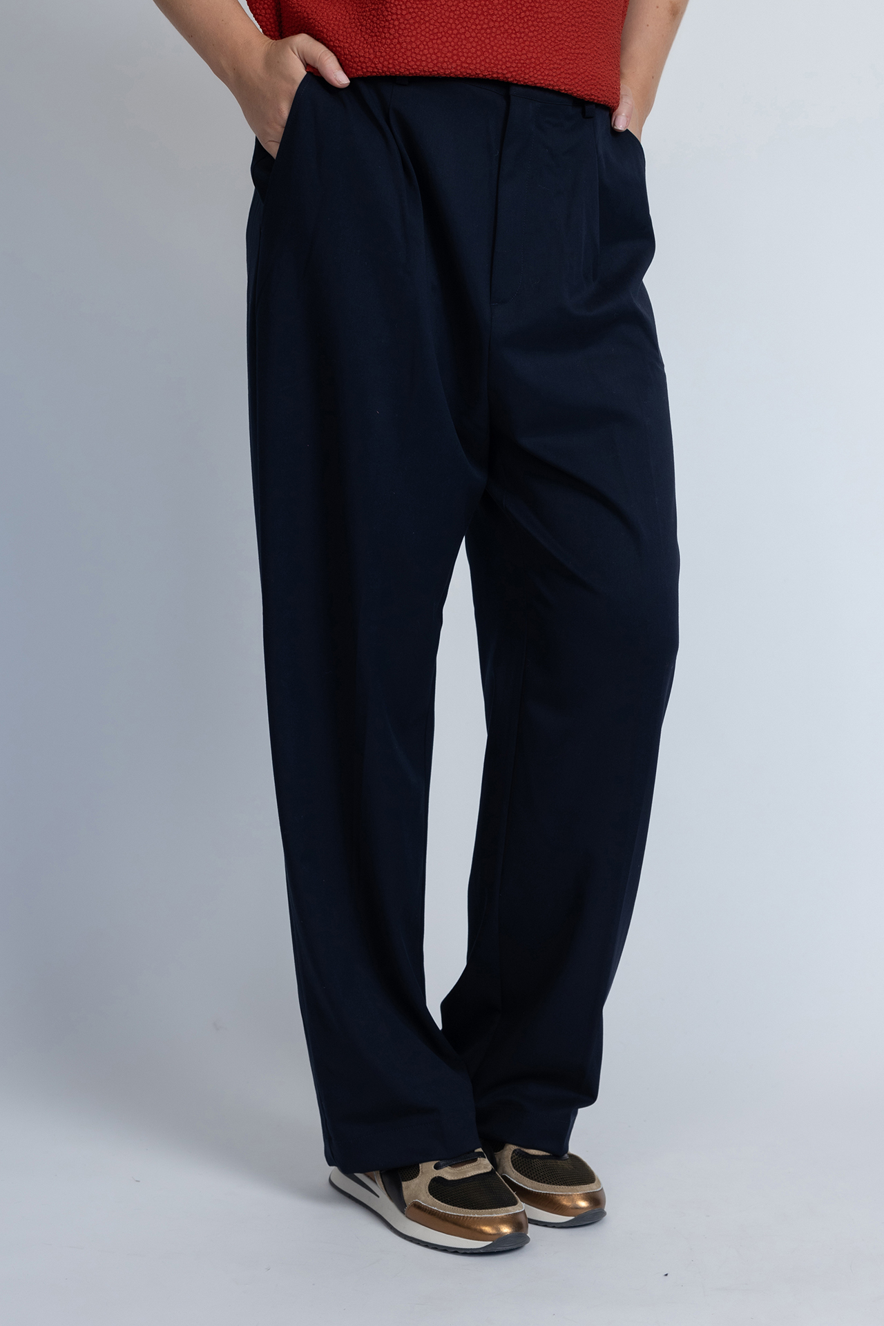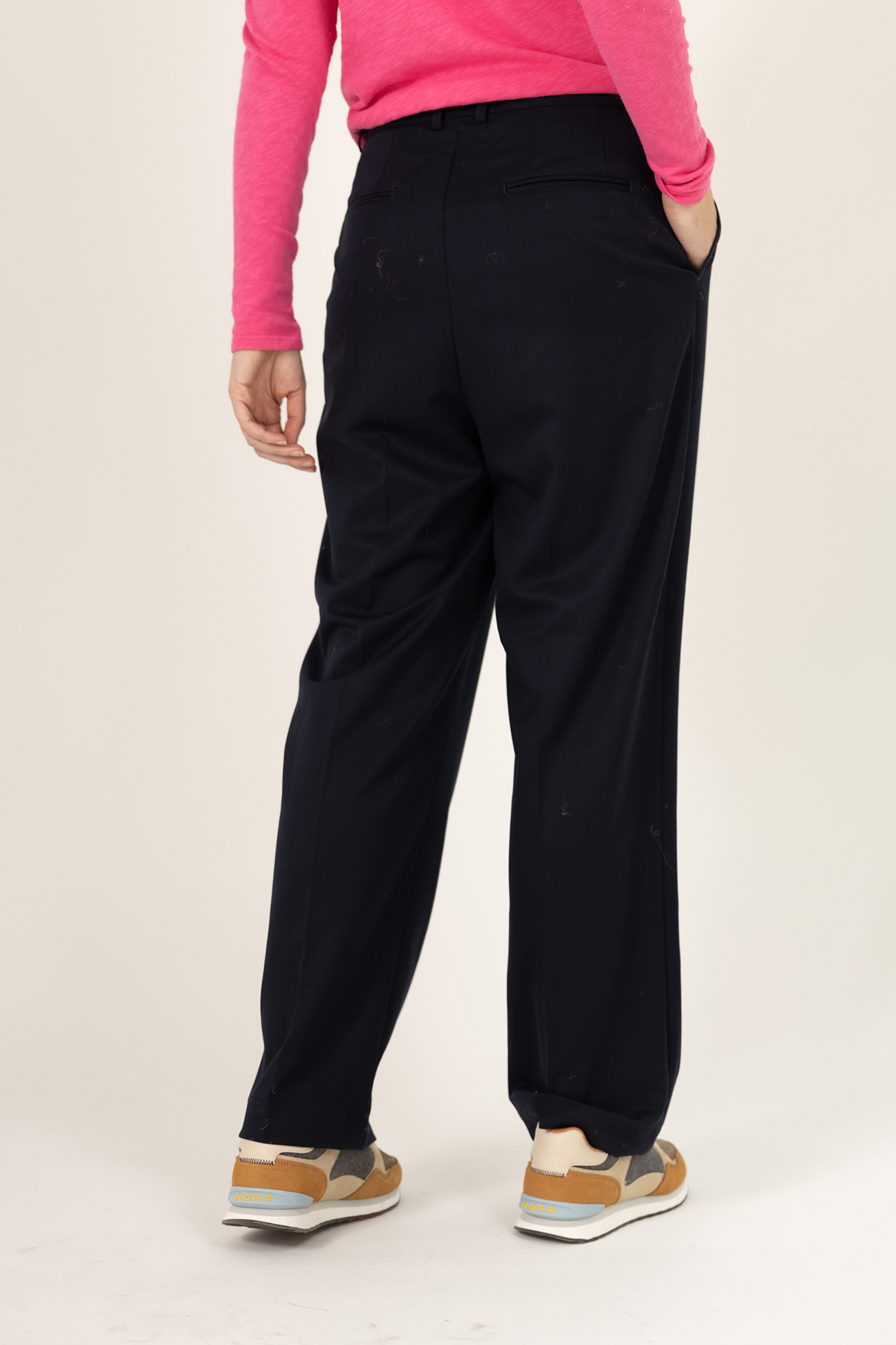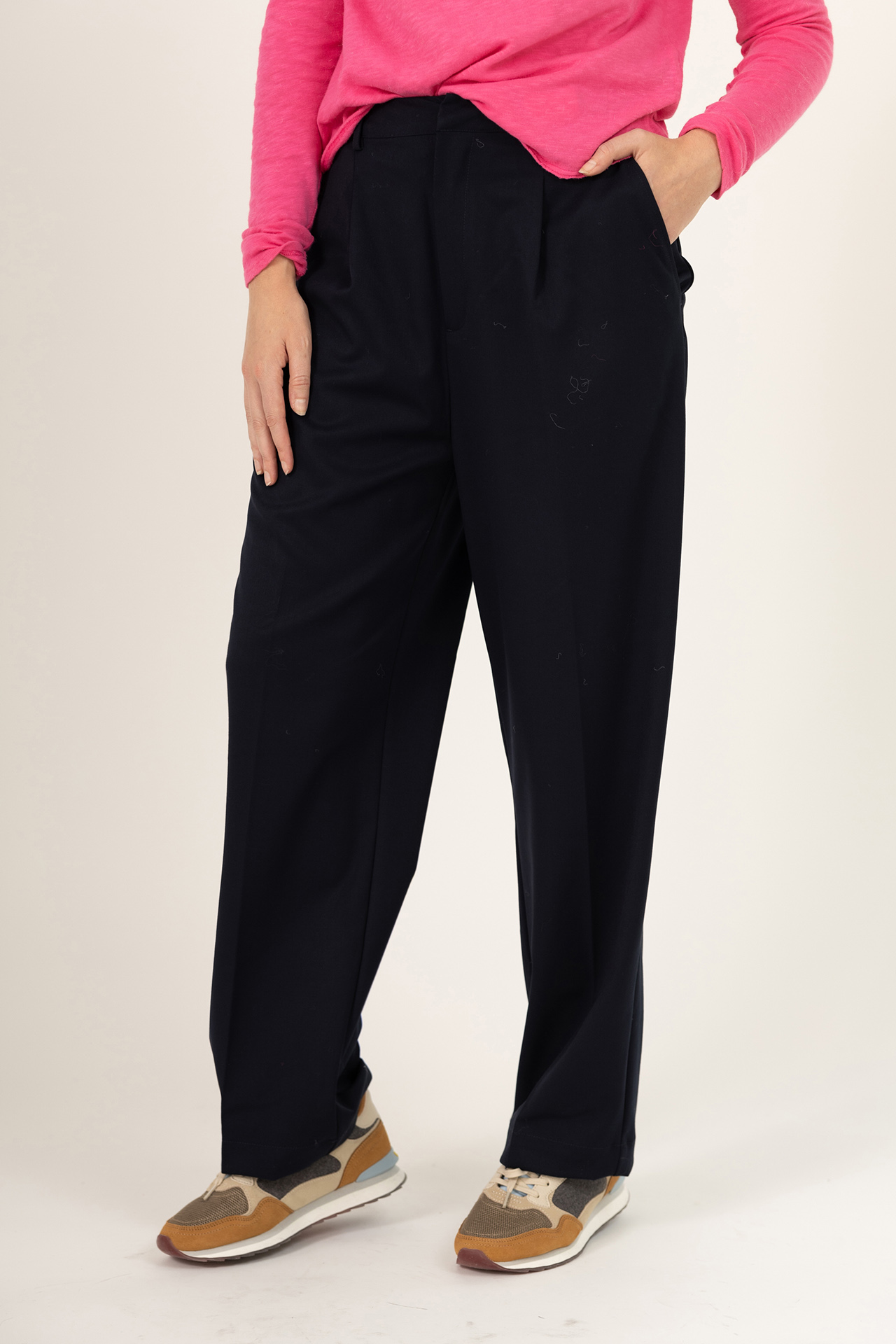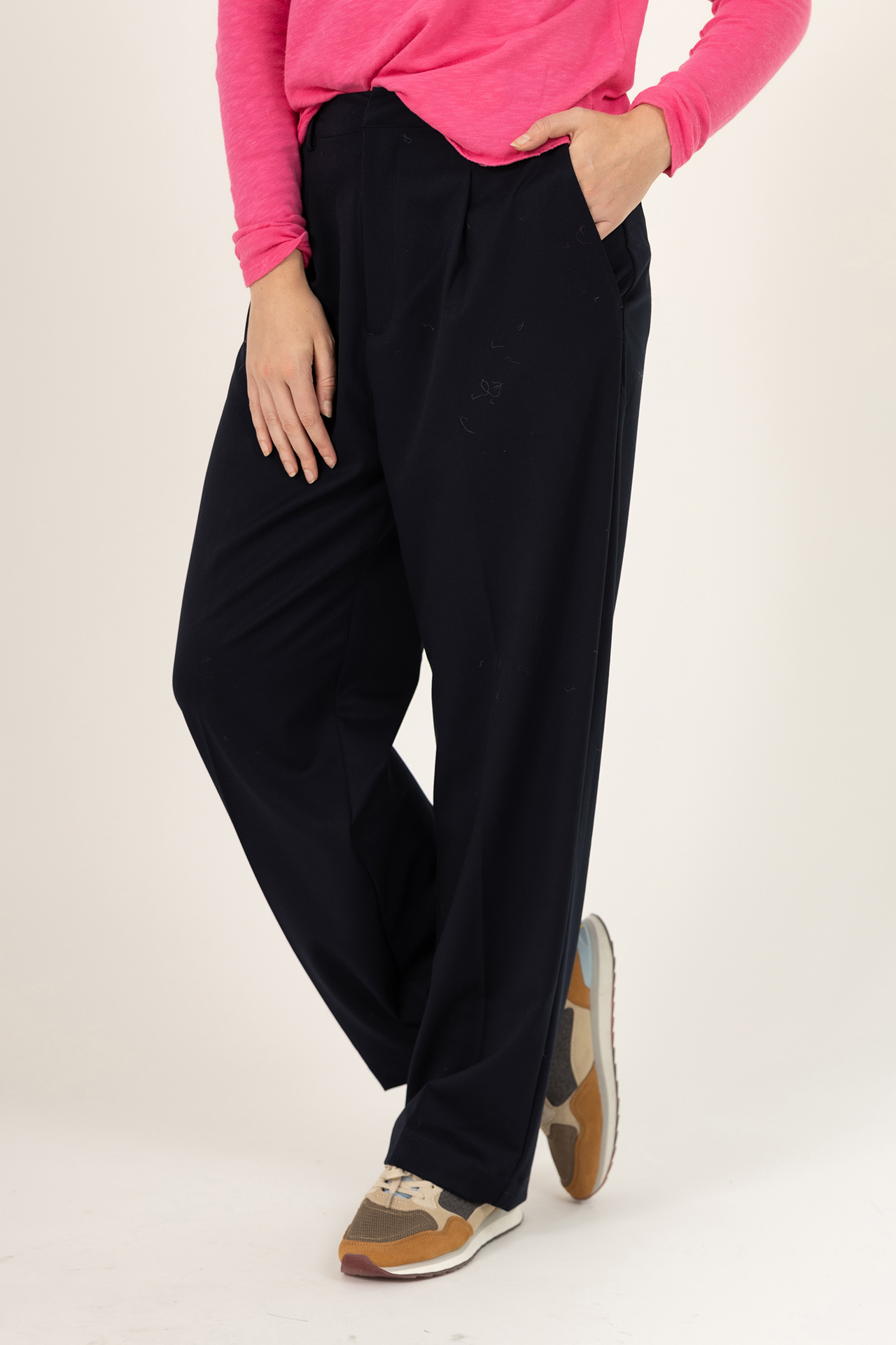 Soepel vallende pantalon met een haak- en ritssluiting, lusjes in de band voor een ceintuur en er zit een klein beetje stretch in waardoor hij heerlijk zit en mooi valt