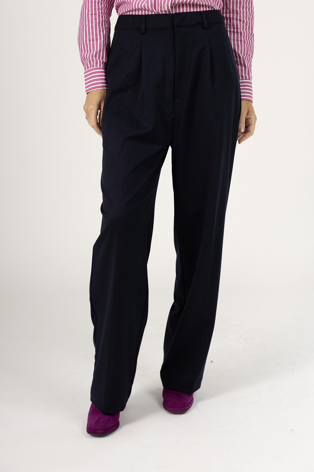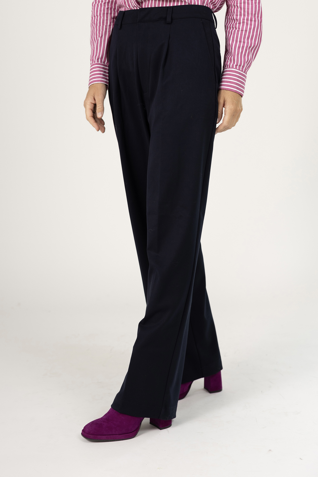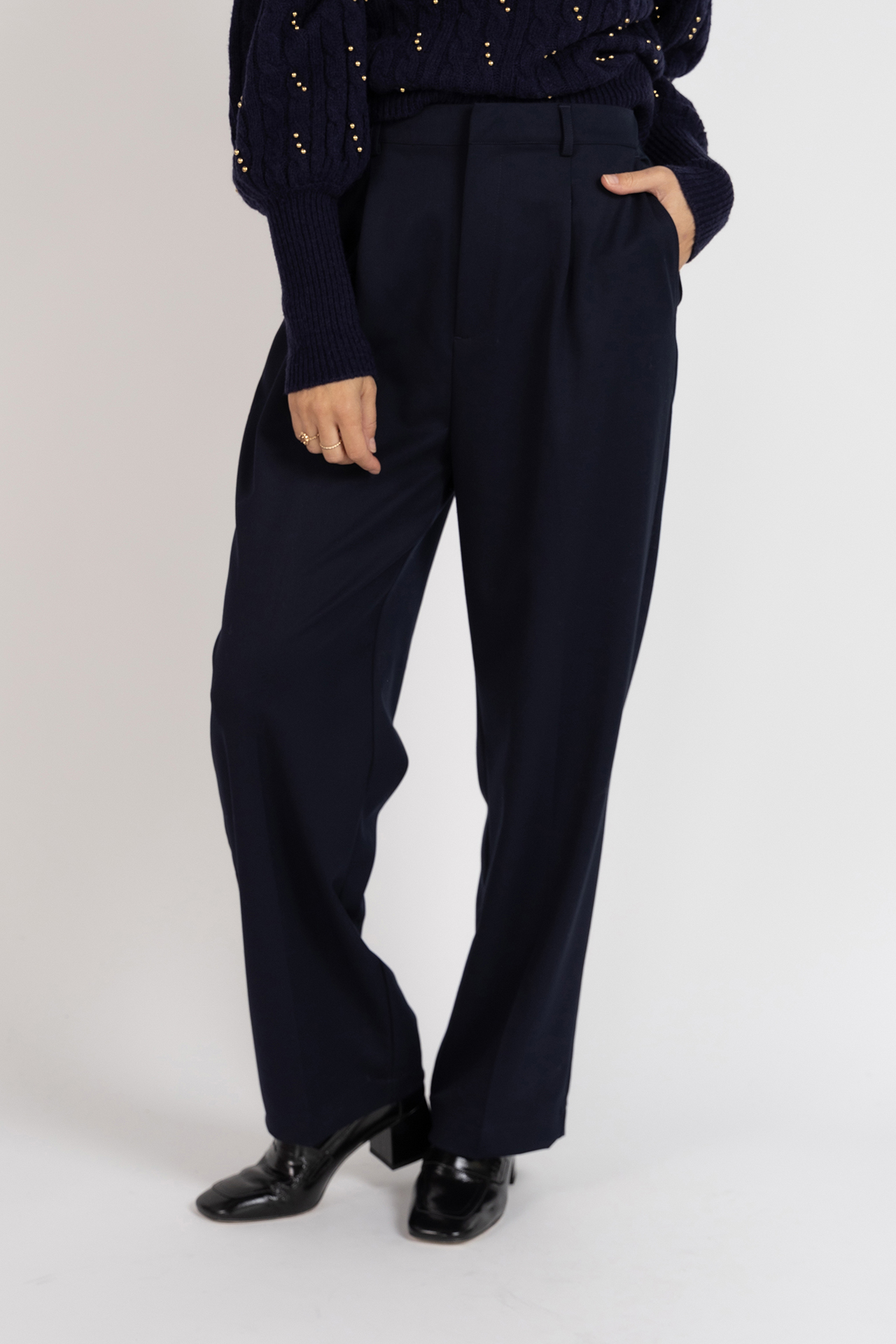 Soepel vallende pantalon met een haak- en ritssluiting, lusjes in de band voor een ceintuur en er zit een klein beetje stretch in waardoor hij heerlijk zit en mooi valt
