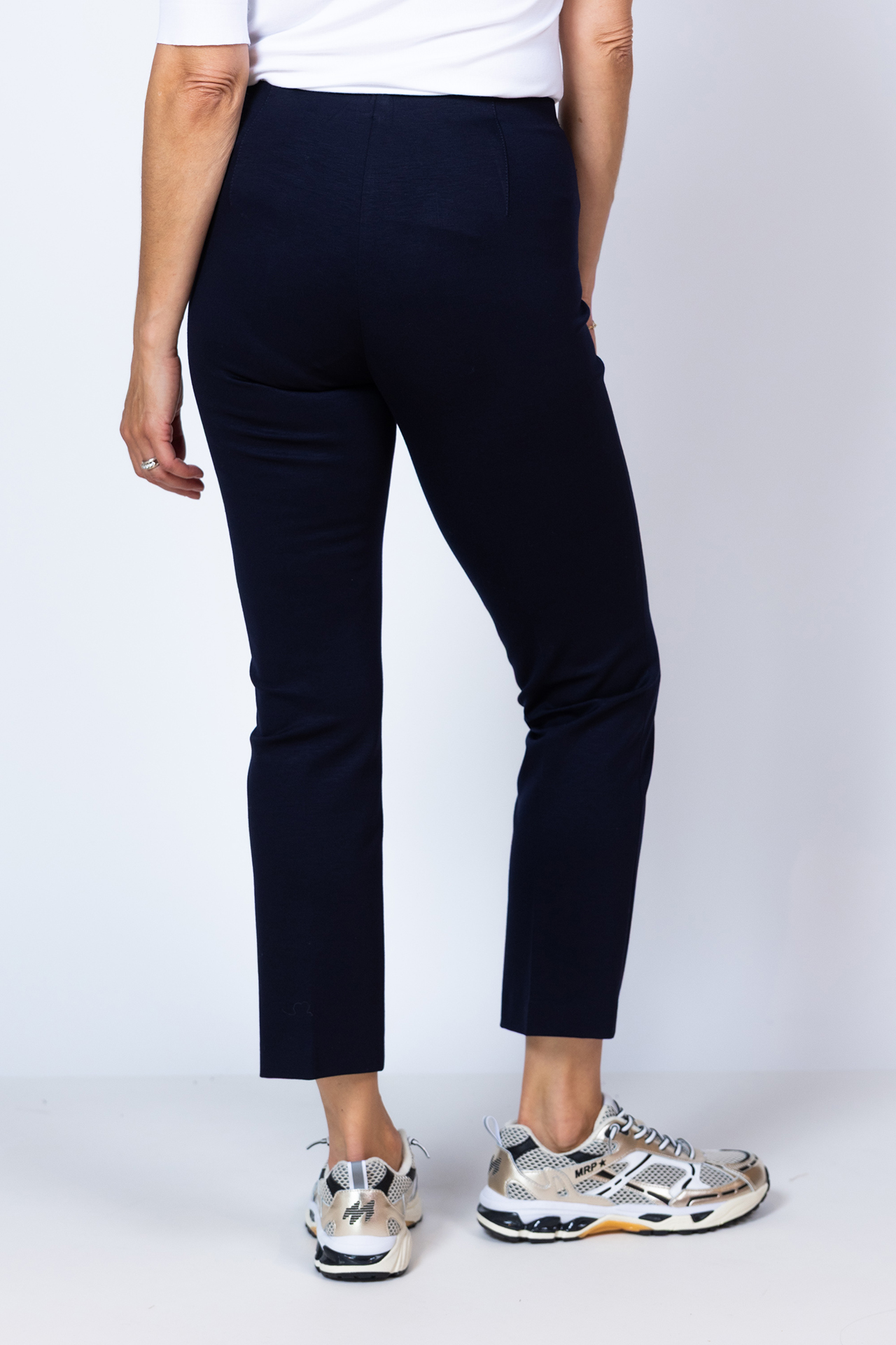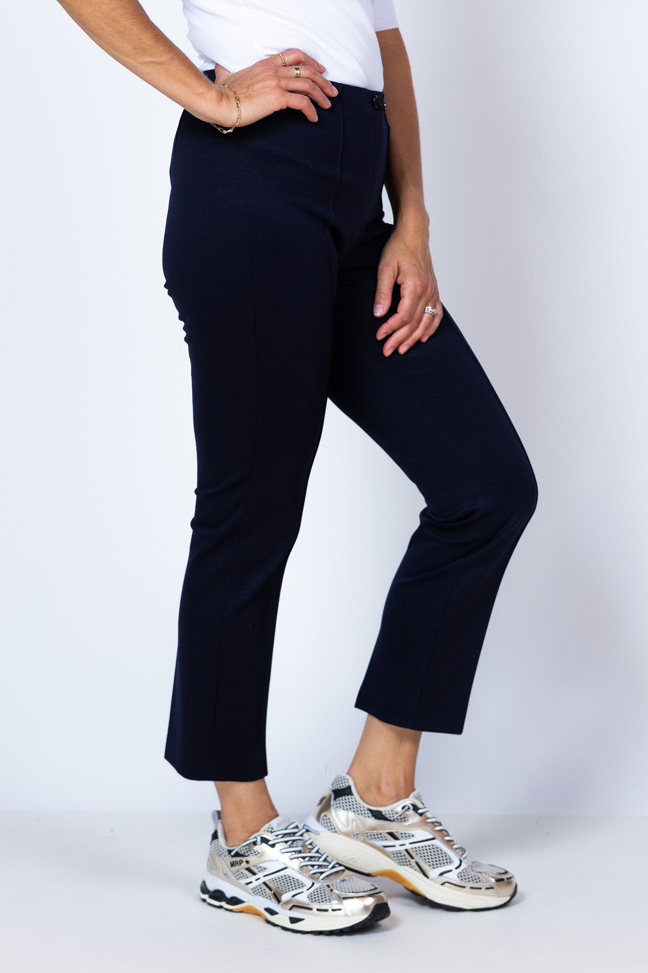 Slimfit pantalon met een knoop- en ritssluiting en stretch in de tailleband. Hij heeft een doorgestikte naad aan de voorkant en stretch in de stof waardoor hij comfortabel draagt
