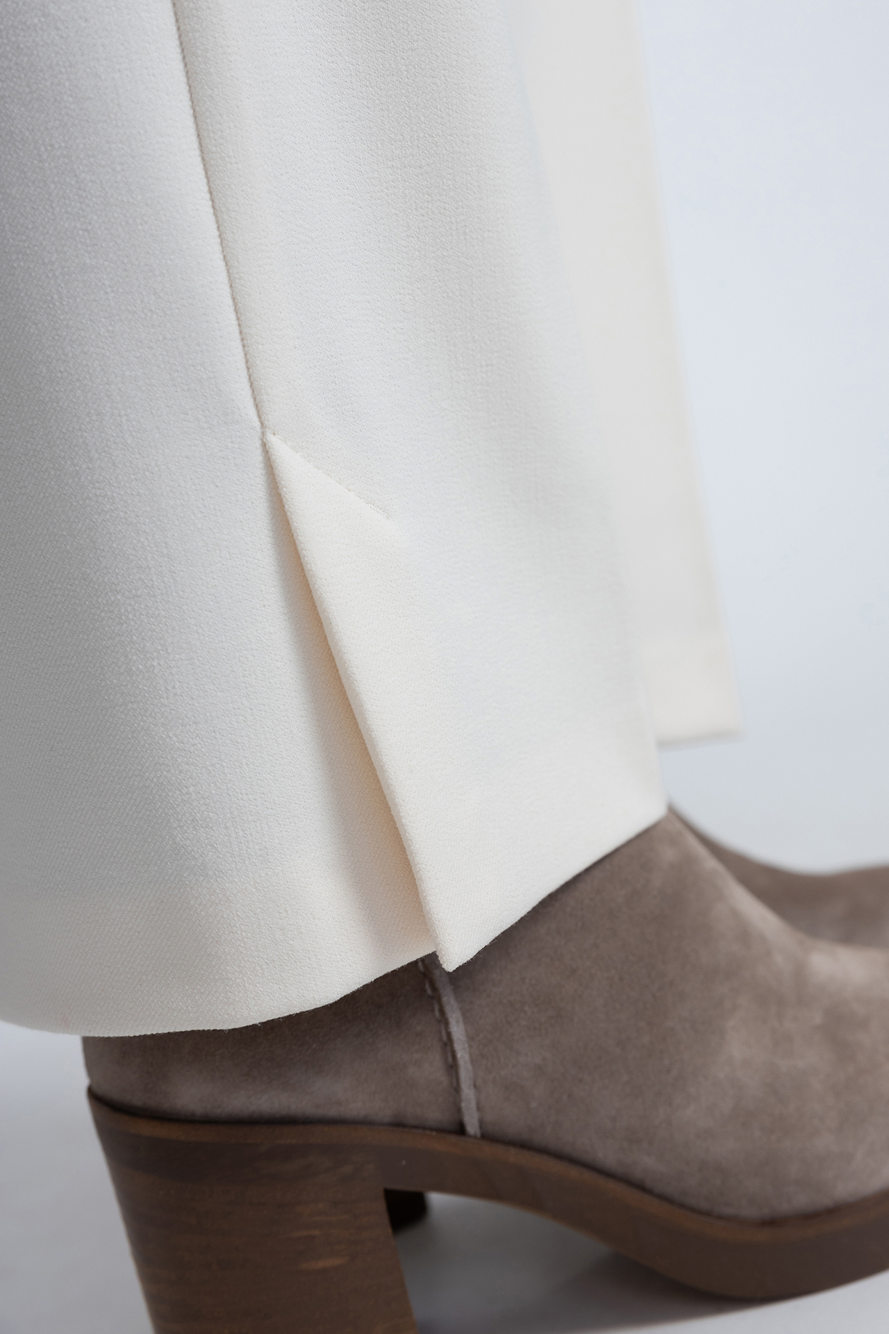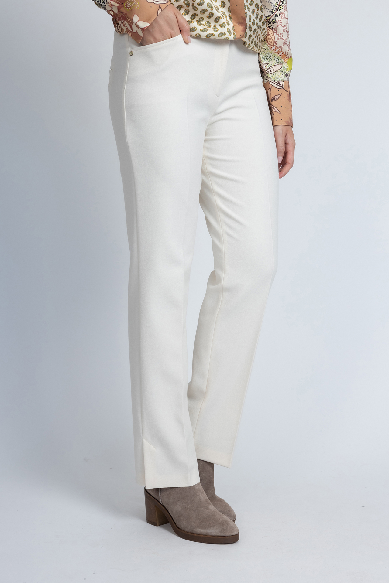 Pantalon met een haak- en ritssluiting, steekzakken aan de voorkant, fake zakken aan de achterkant, er zit stretch in waardoor hij comfortabel draagt en hij heeft splitten