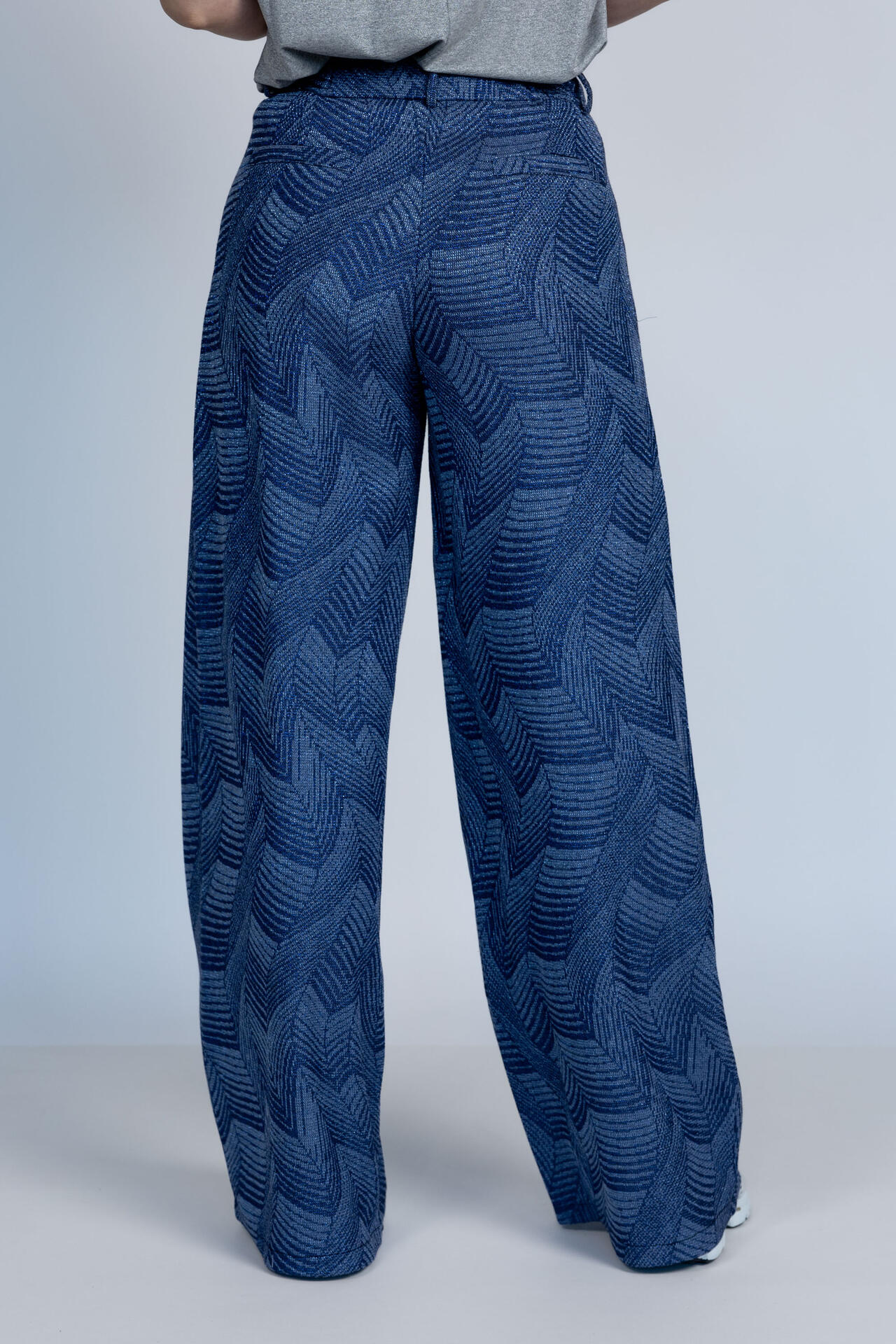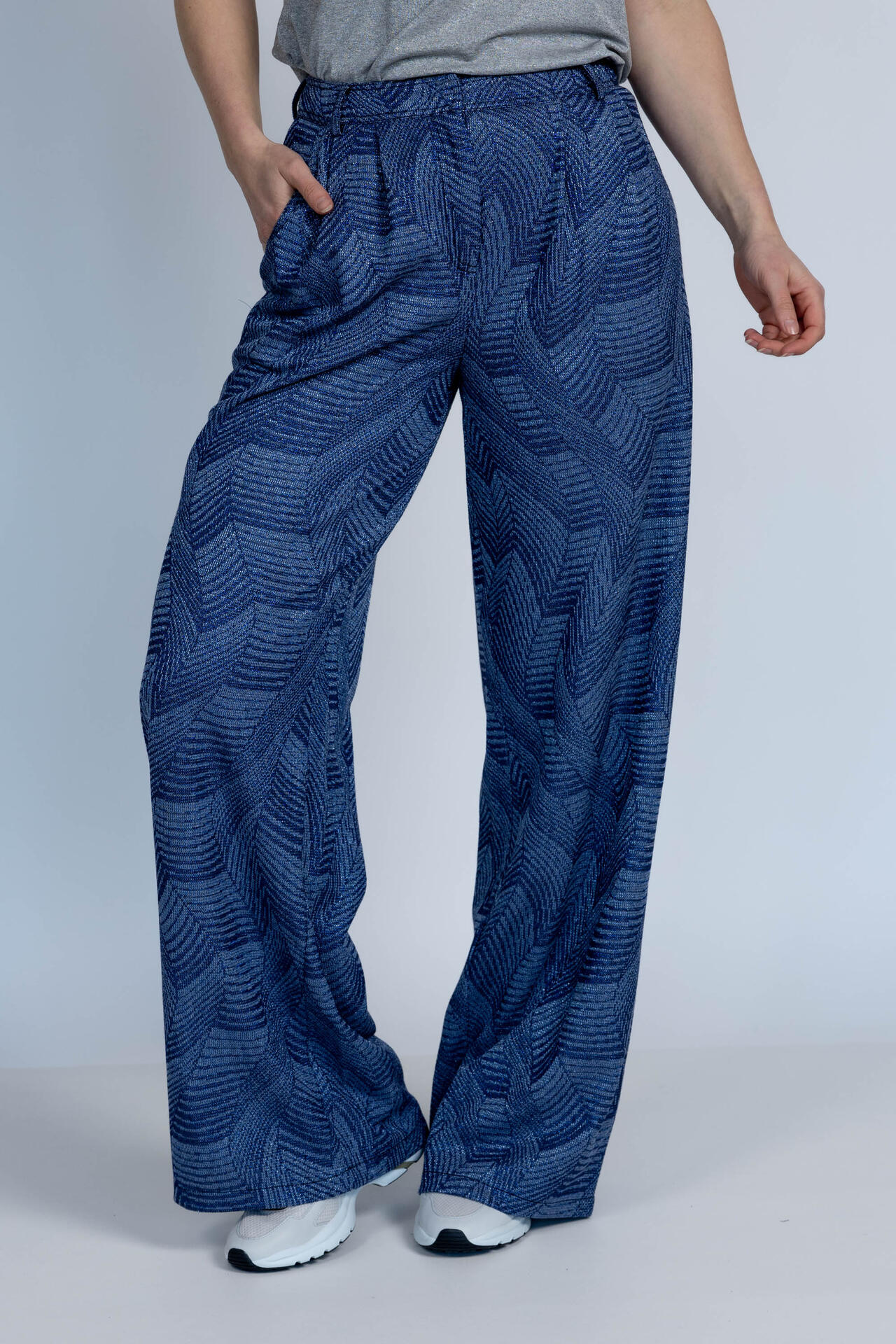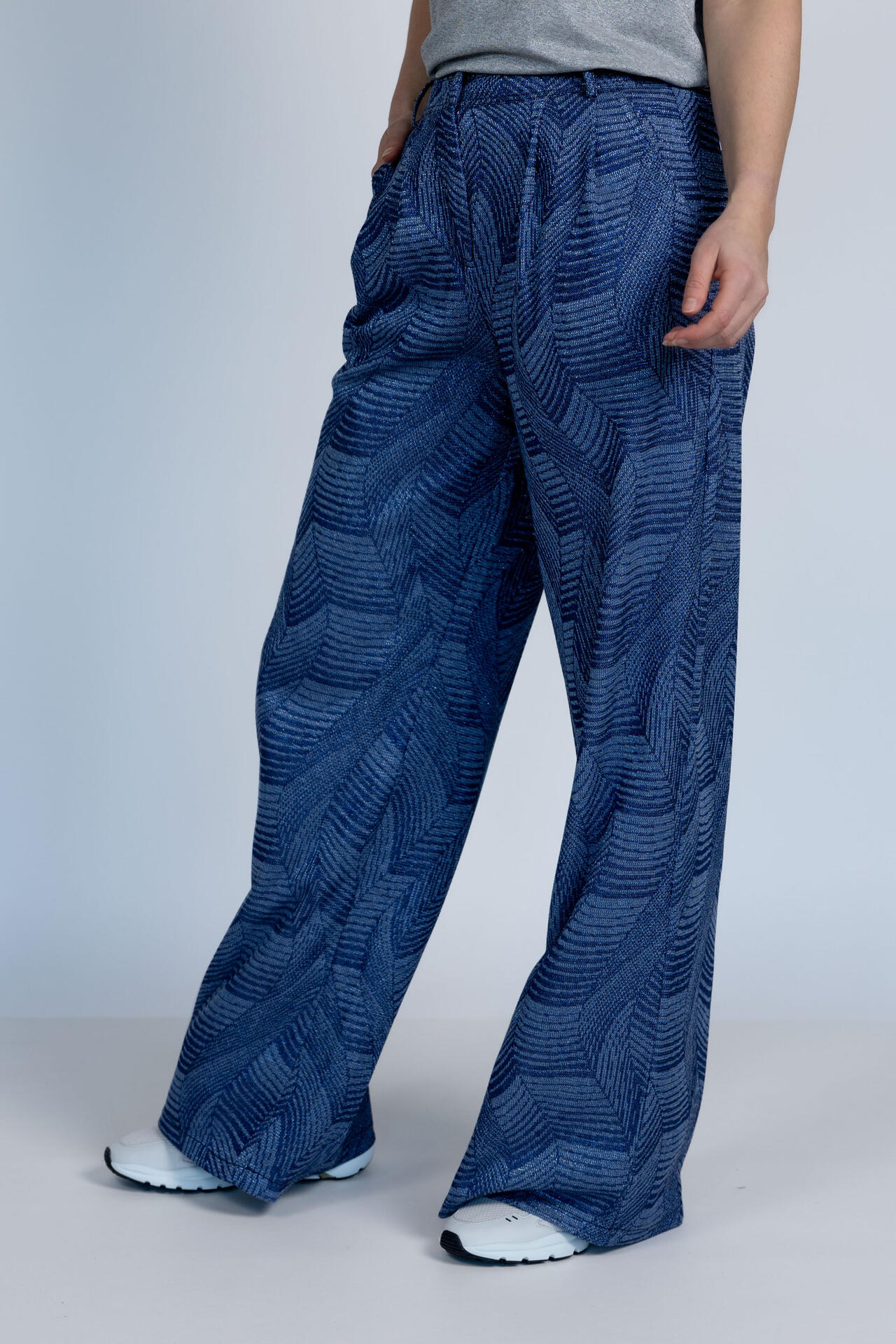 Pantalon met wijde pijpen en een haak- en ritssluiting. Hij heeft een all-over dessin met glitters, bandplooi en steekzakken aan de voorkant en fake zakken aan de achterkant