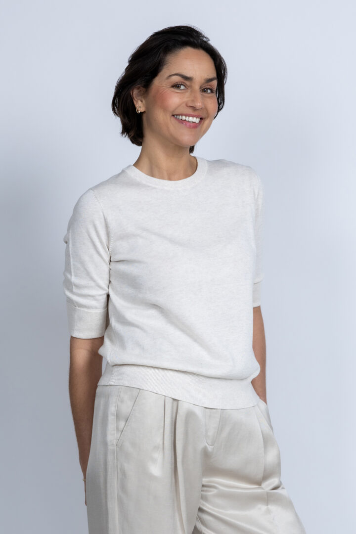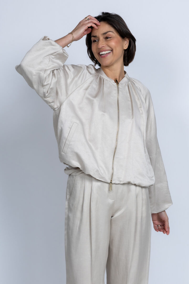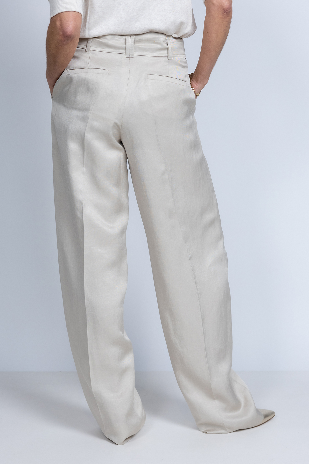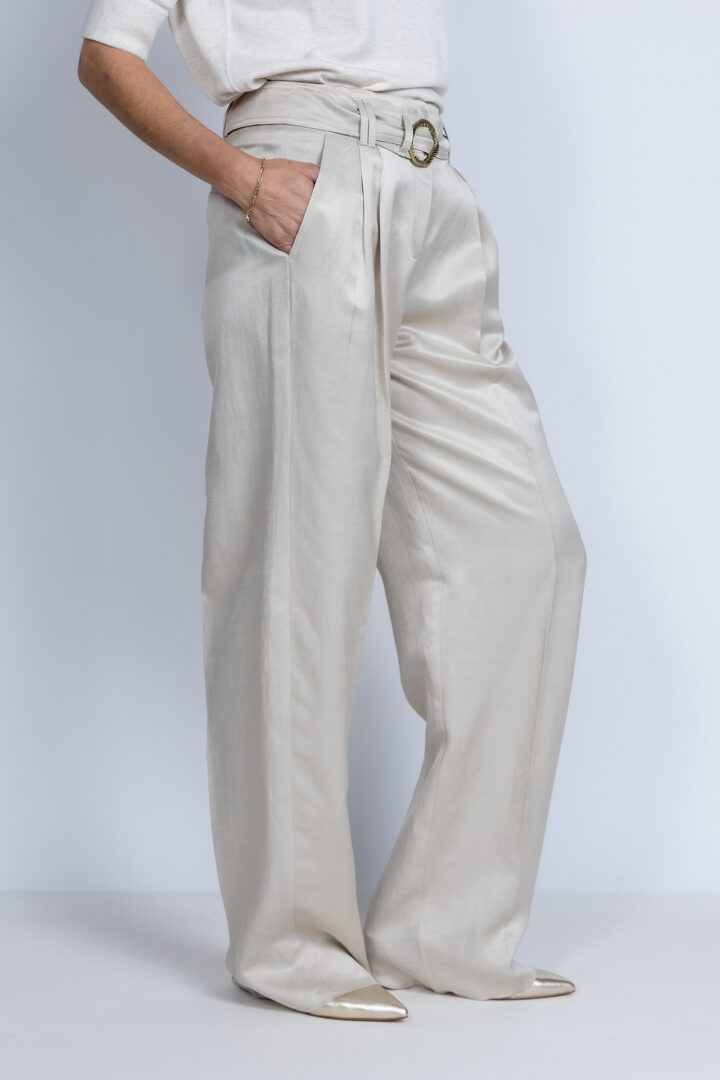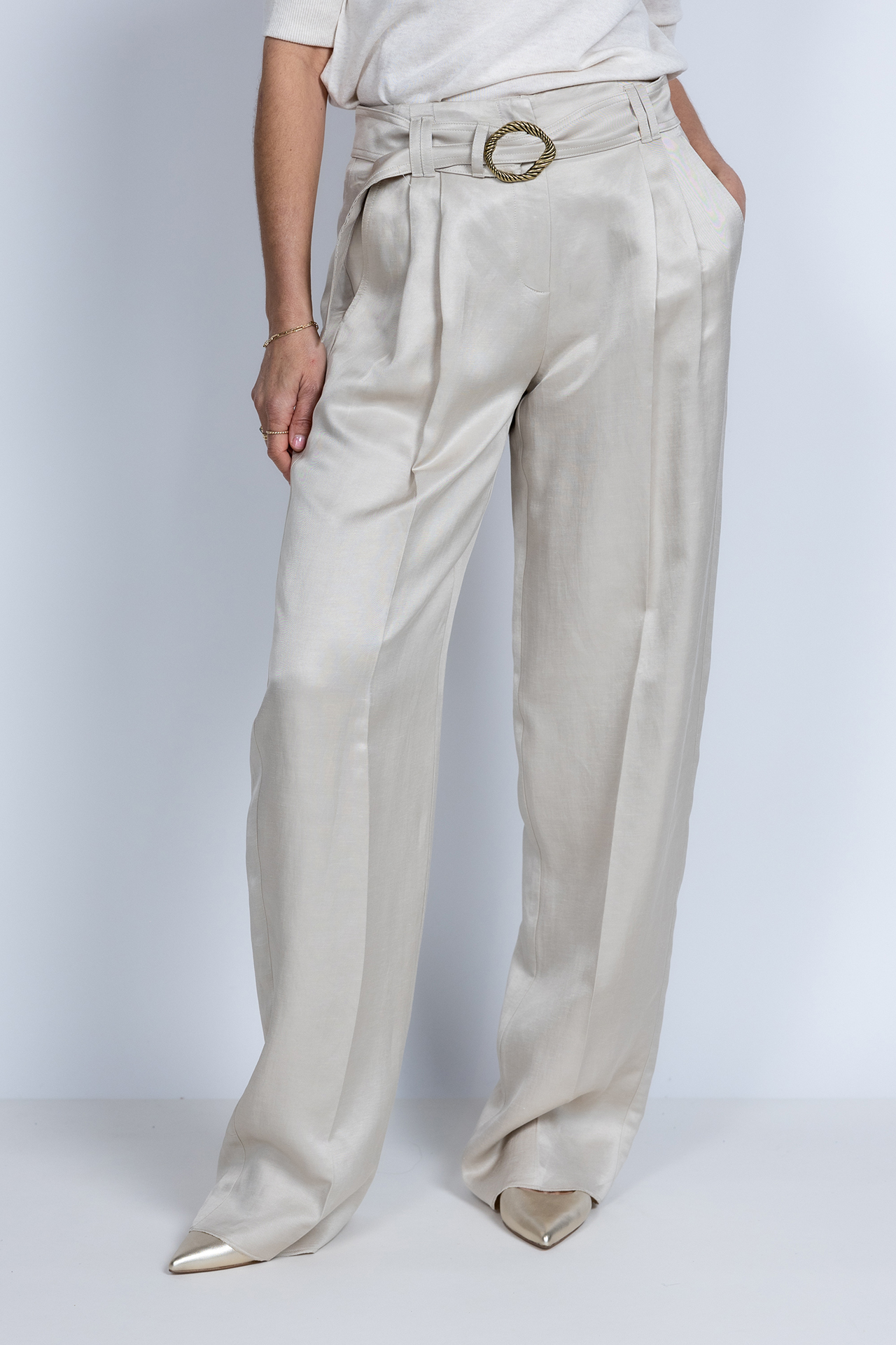 Pantalon met een haak- en ritssluiting, lusjes en een ceintuur in de band. Hij heeft bandplooi, steekzakken aan de voorkant, fake zakken aan de achterkant en een subtiele glans in de stof wat de pantalon een chique uitstraling geeft