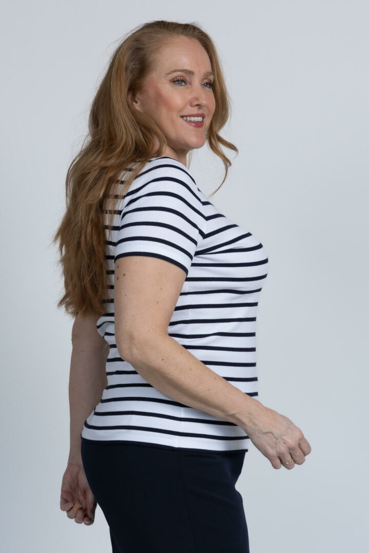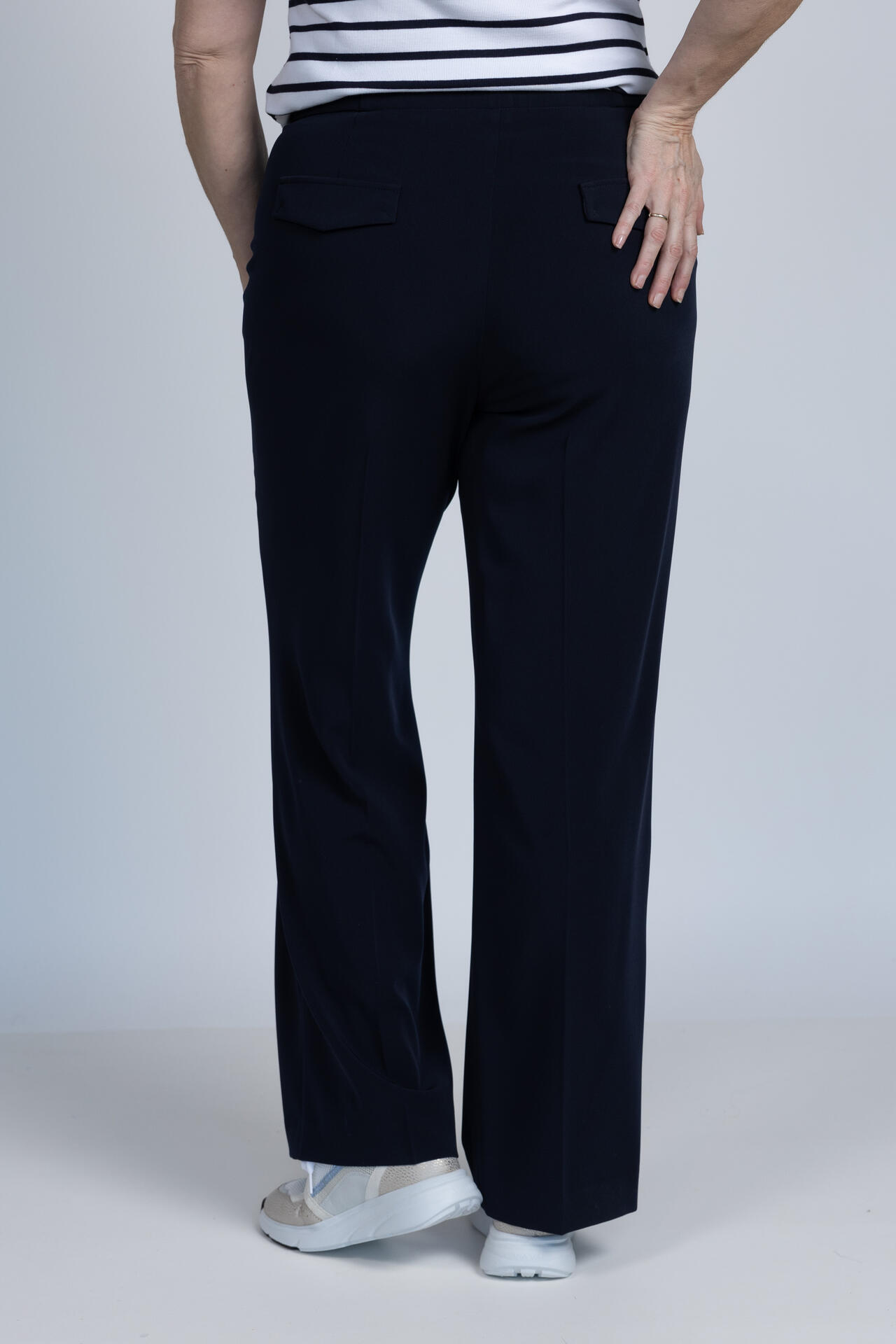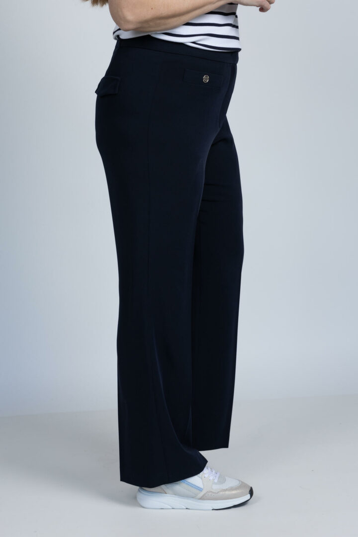 Pantalon met gouden knopen aan de voorkant, klepzakken aan de achterkant en stretch in de stof waardoor hij comfortabel draagt