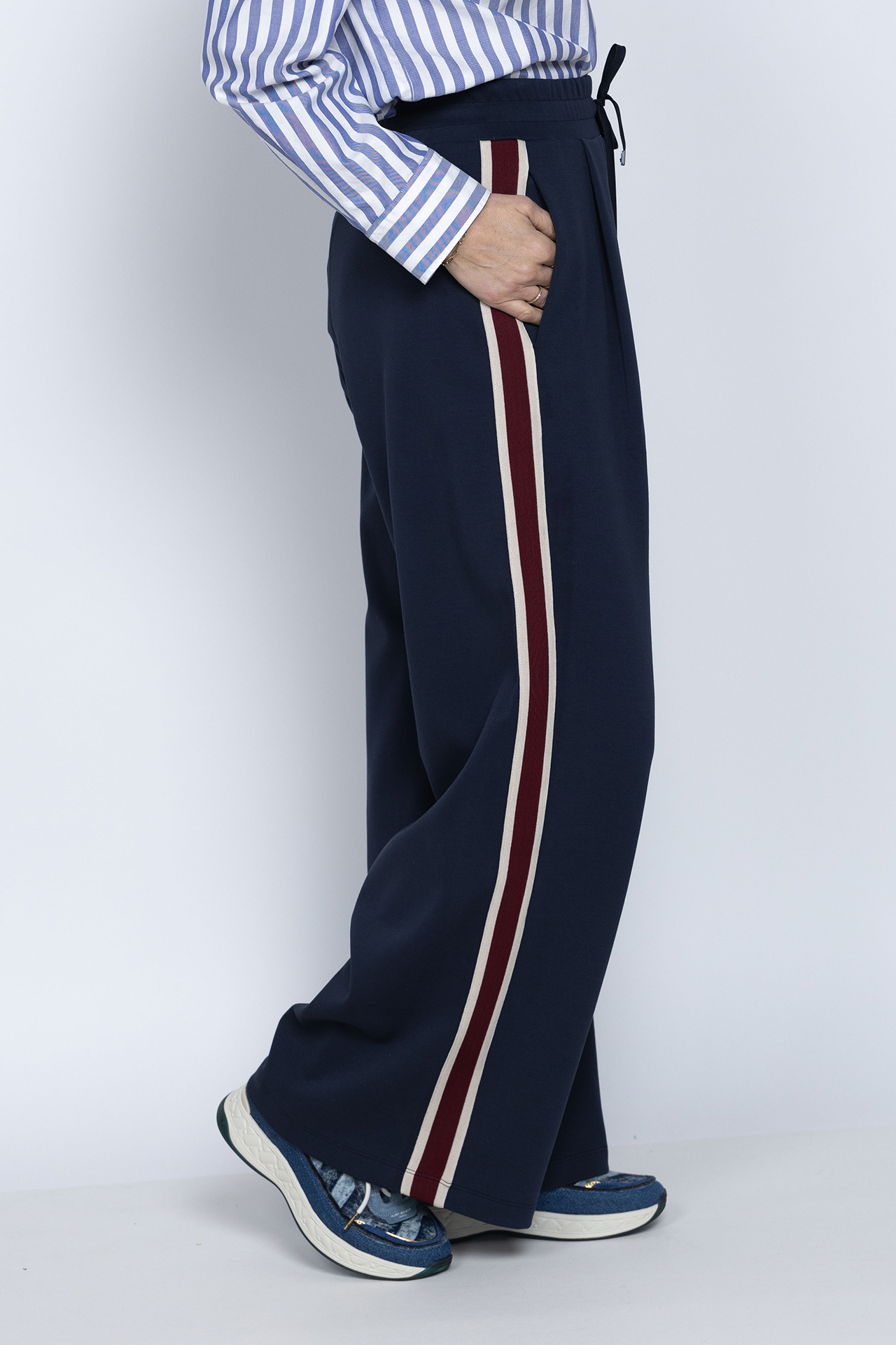 Pantalon met een elastische band met koordje in de taille. Hij heeft steekzakken en bandplooi aan de voorkant en een bies aan de zijkant