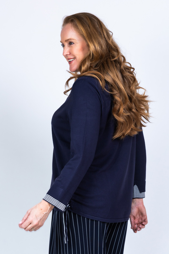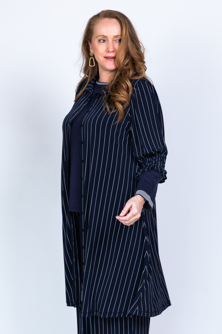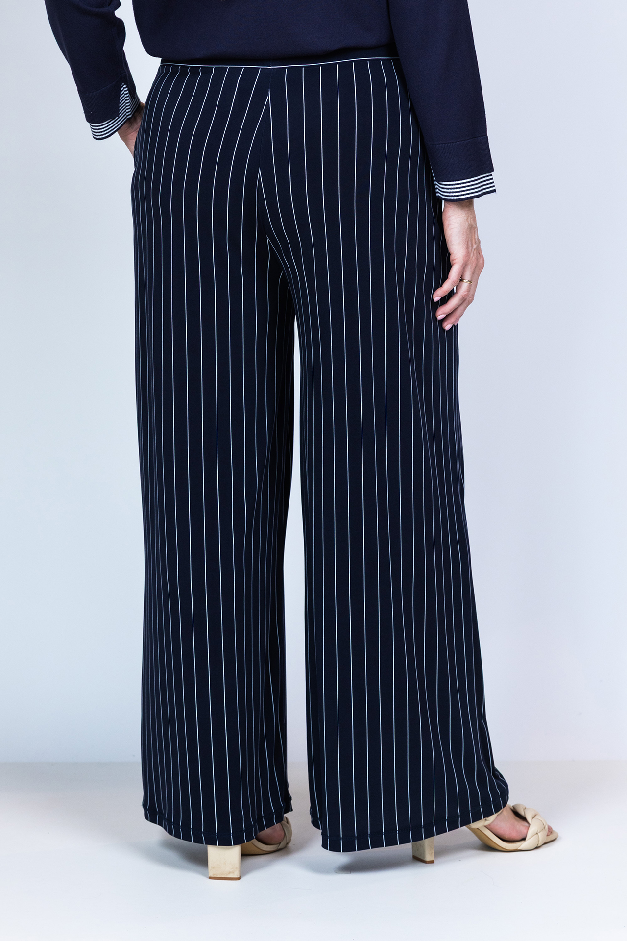 Pantalon met wijde pijpen en een elastische band in de taille. Hij heeft steekzakken aan de voorkant, een krijtstreep en stretch in de stof waardoor hij comfortabel draagt