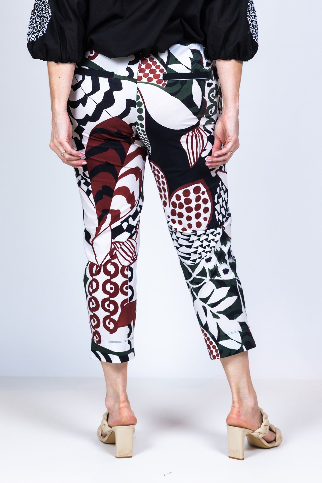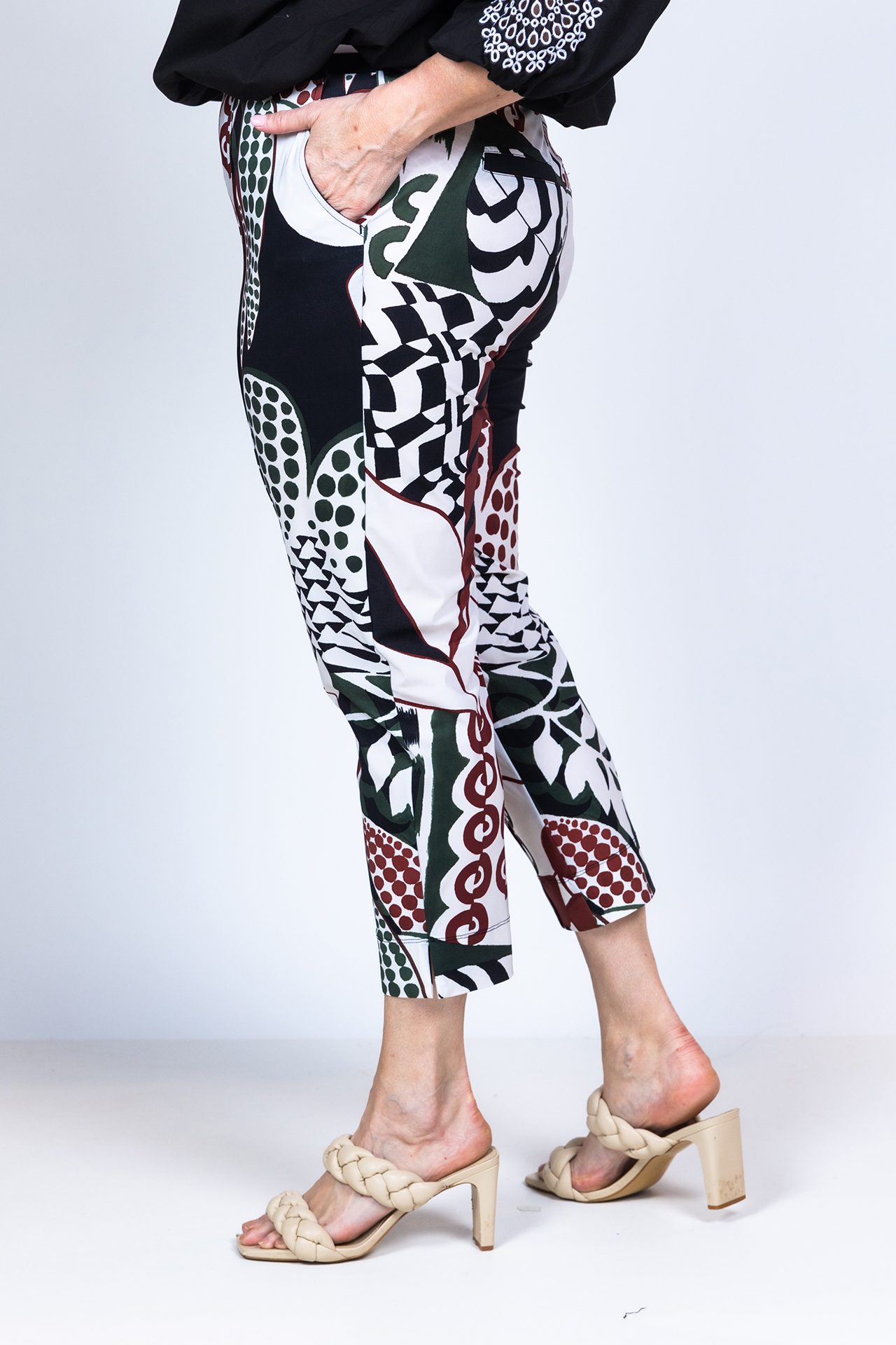 Broek met een elastische band in de taille, steekzakken aan de voorkant en fake zakken aan de achterkant. Hij heeft een all-over dessin en stretch in de stof waardoor hij heerlijk zit