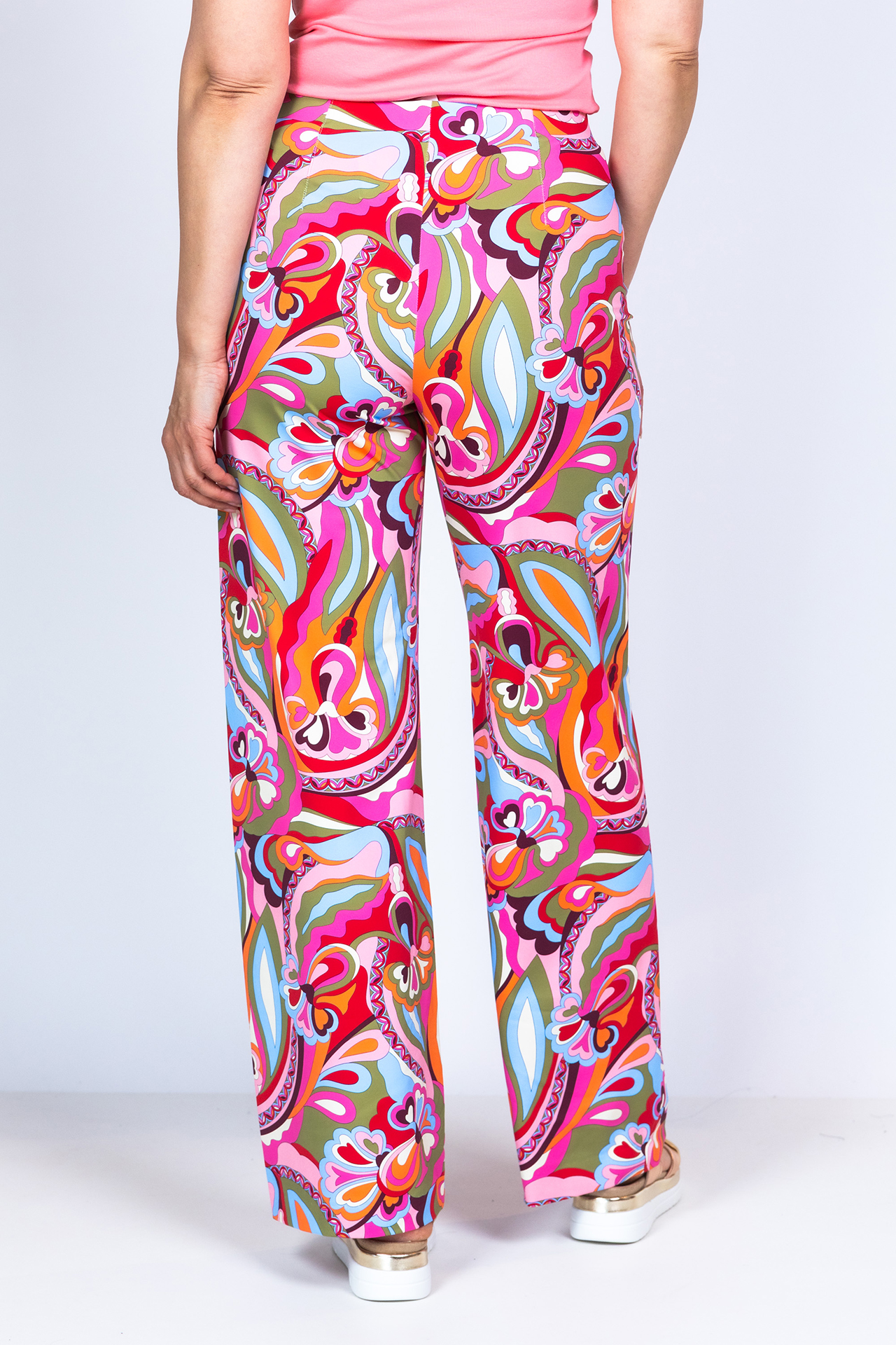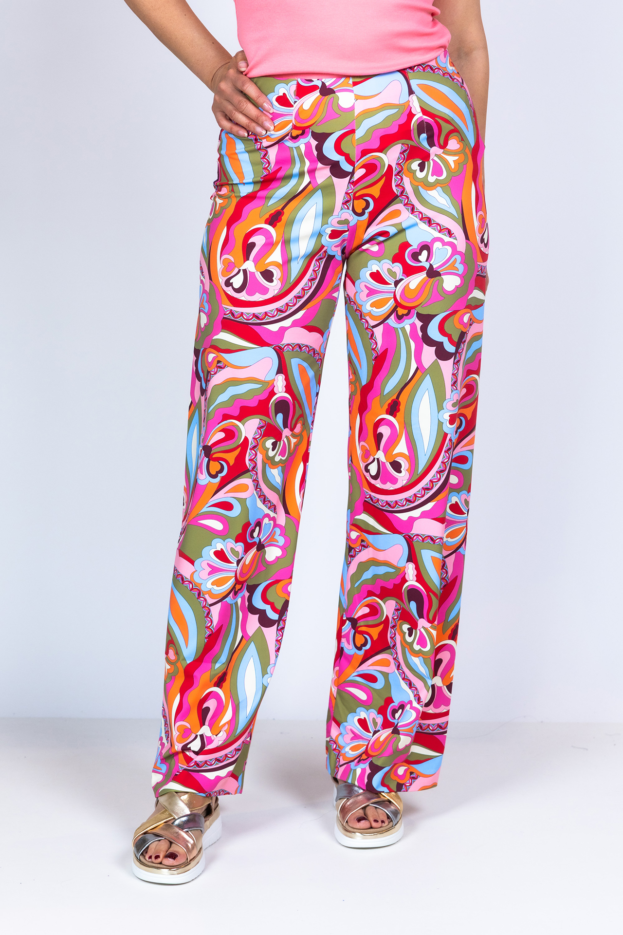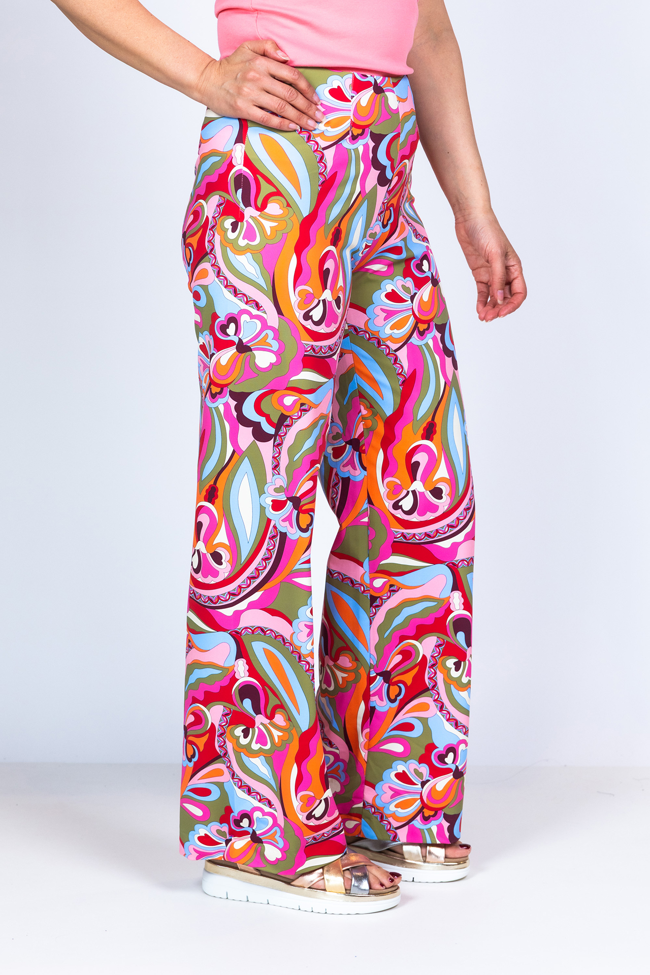 Broek met een elastische band in de taille, een drukke multicolour print en veel stretch in de stof waardoor hij super fijn draagt