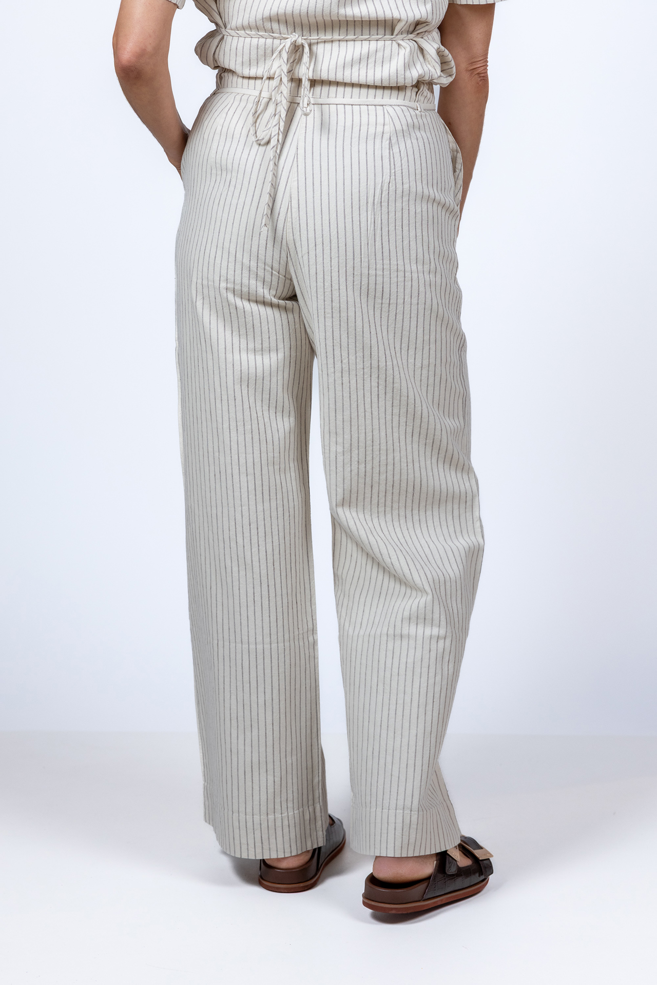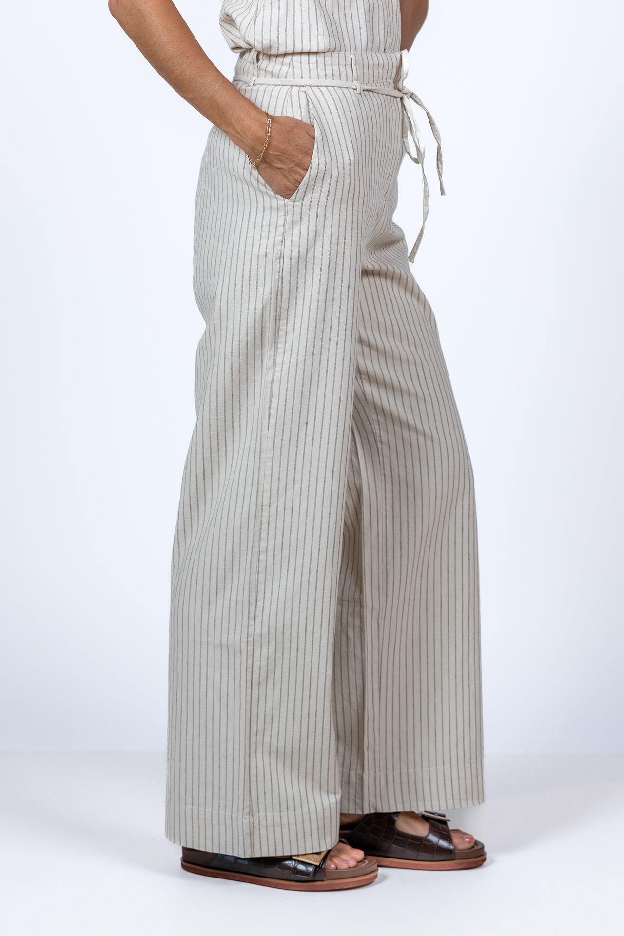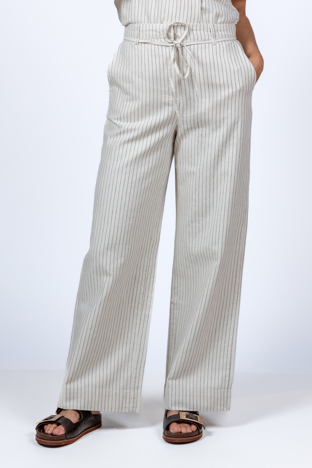 Krijtstreep pantalon met wijde pijpen, steekzakken aan de voorkant en een strikkoordje in de taille