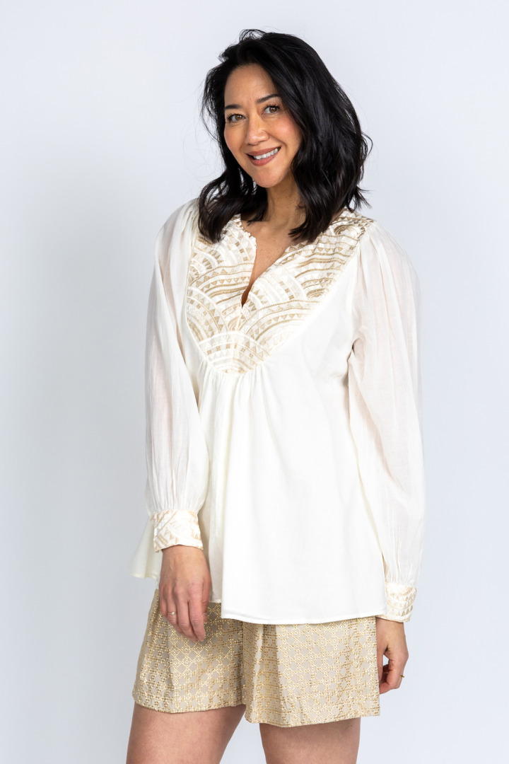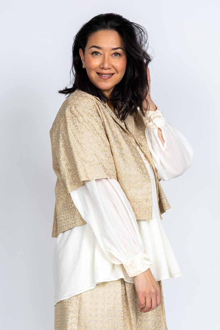 Short met een knoop- en ritssluiting, bandplooi, steekzakken aan de voorkant en all-over gouden borduursels