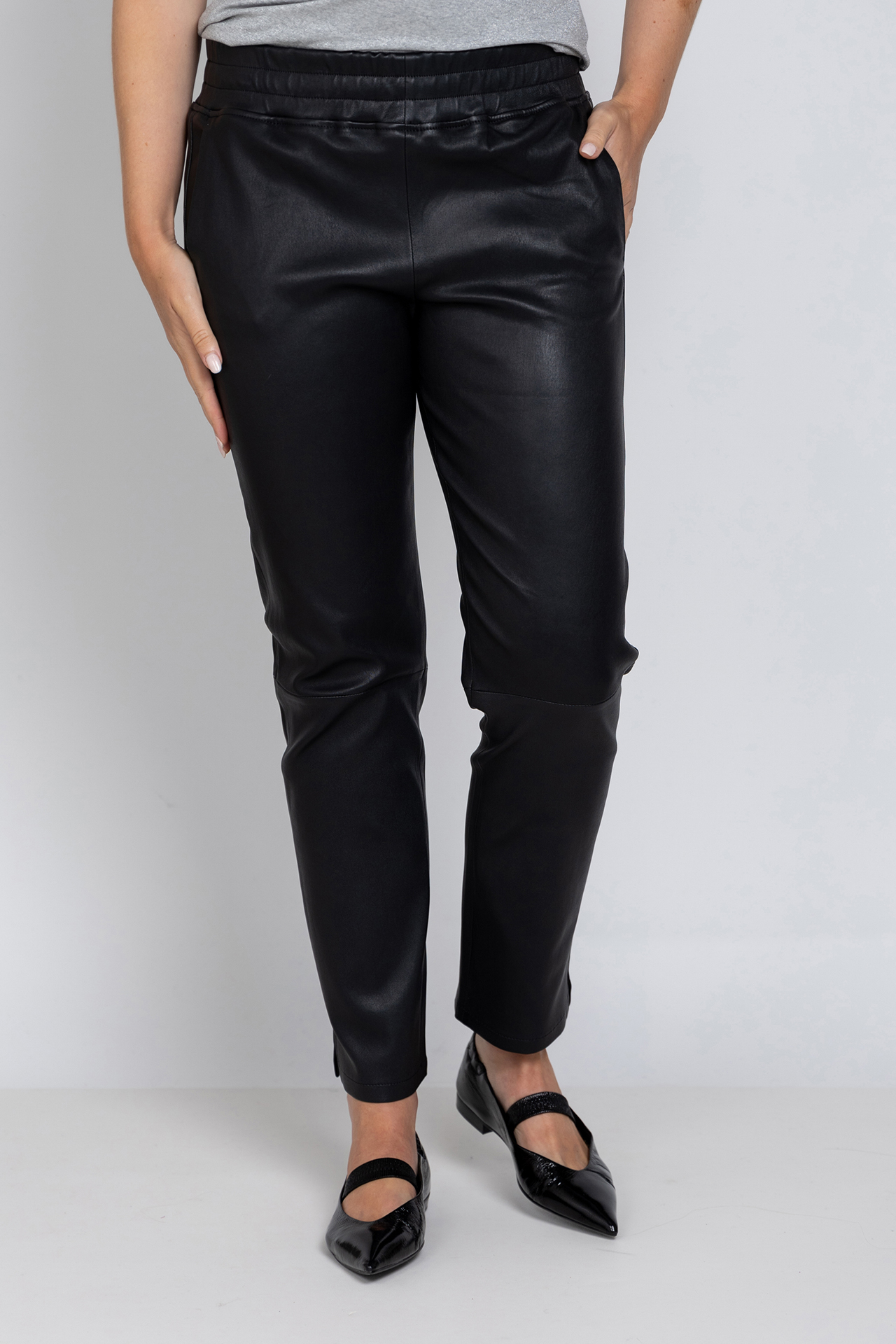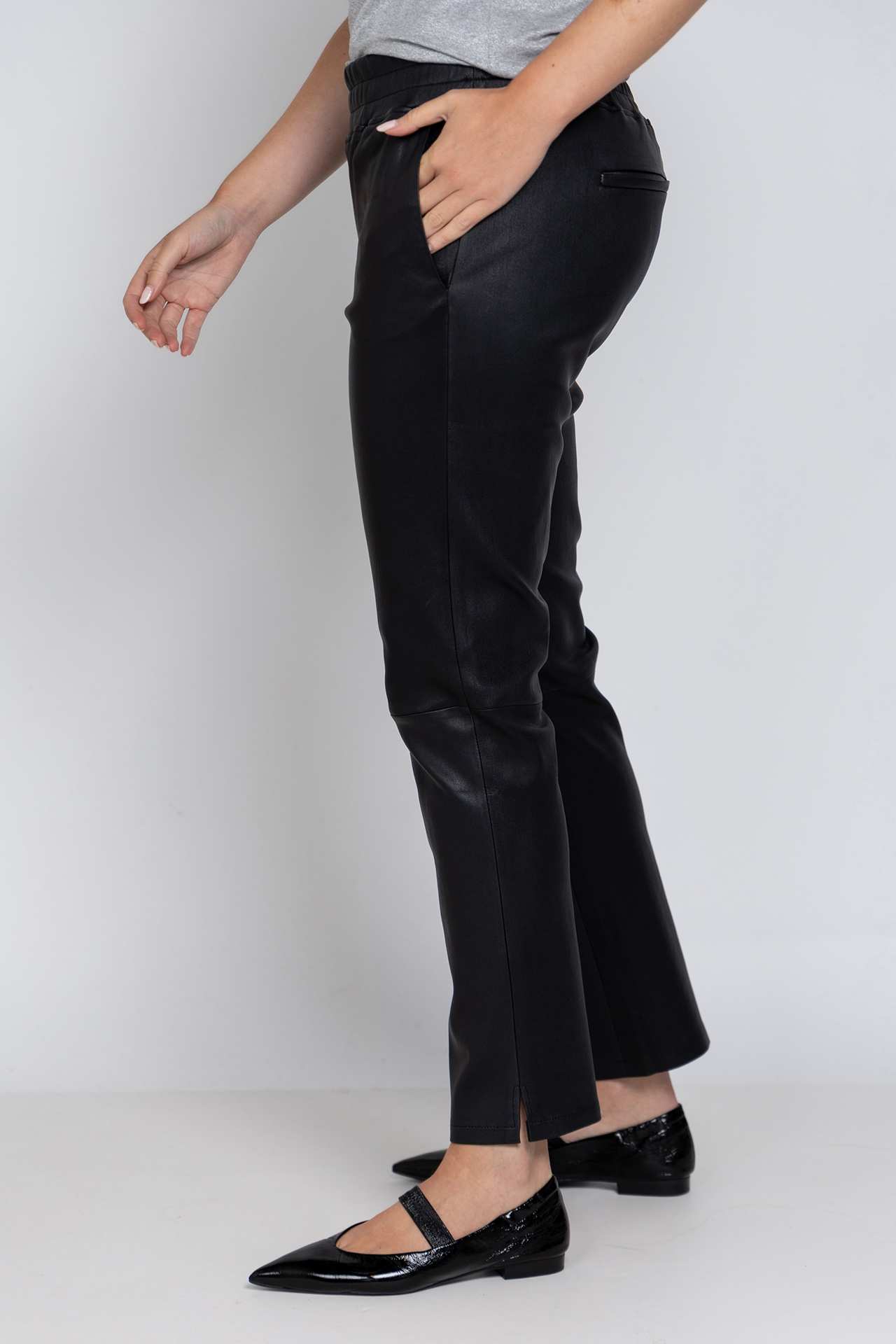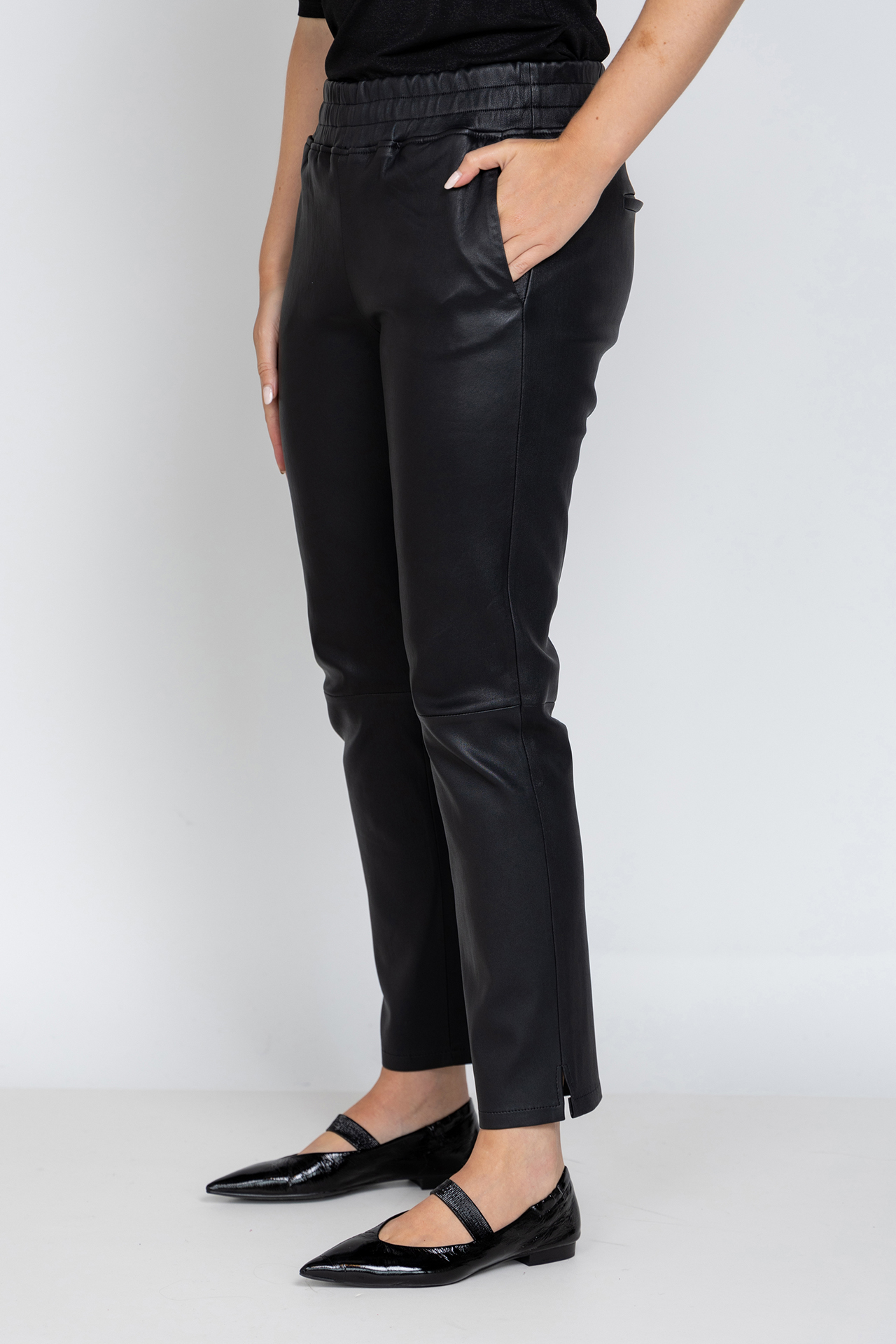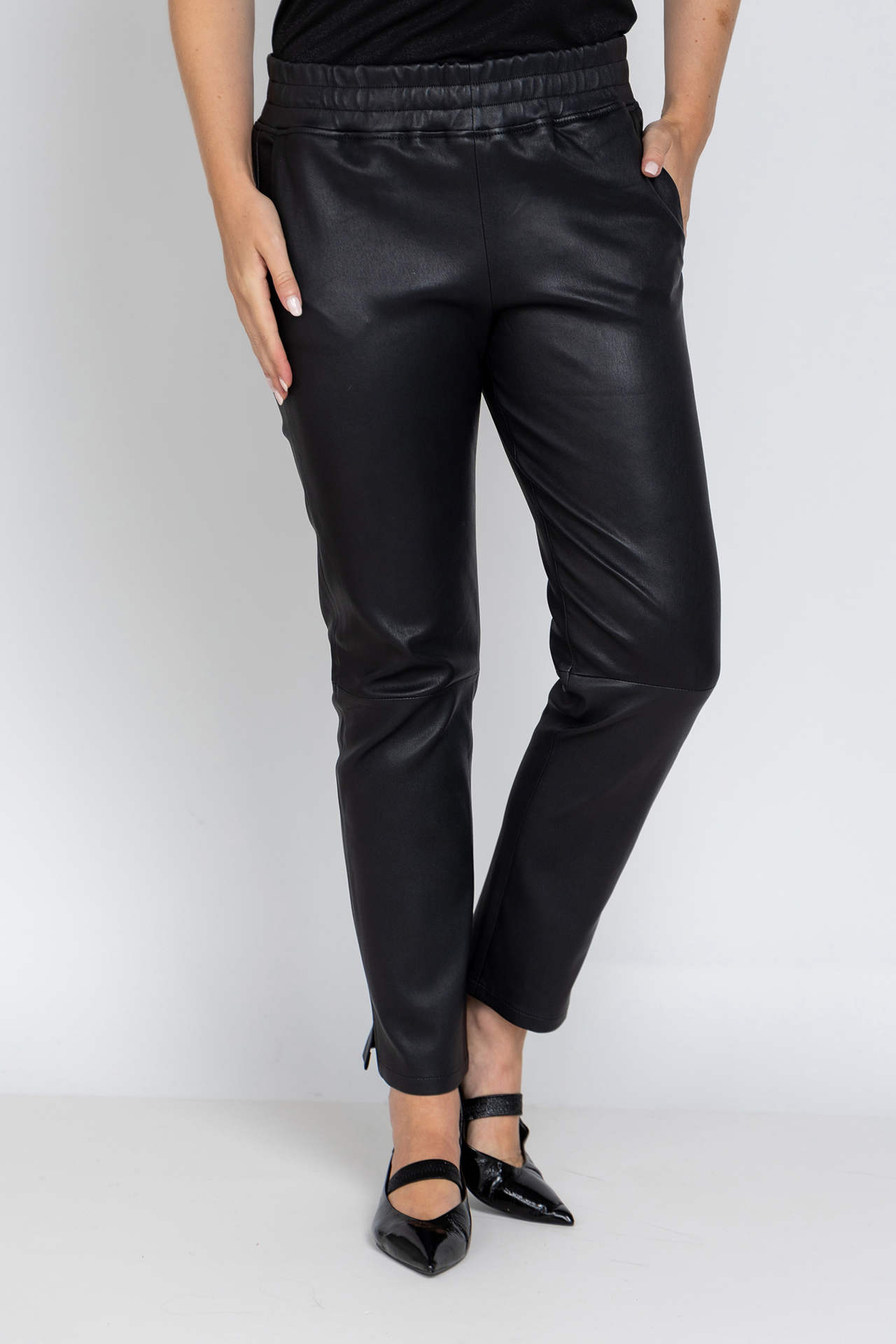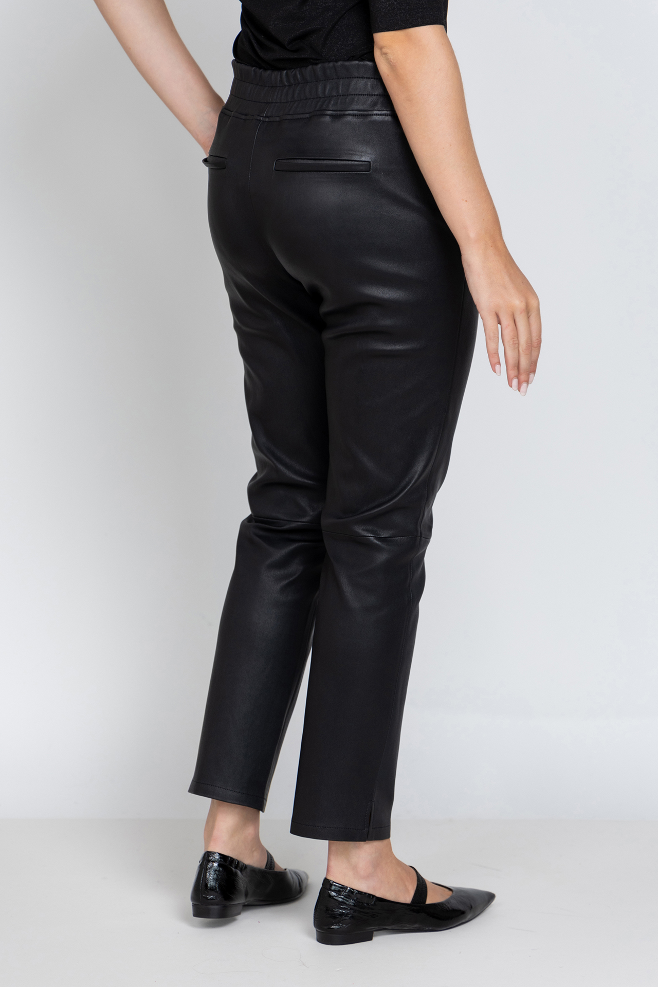 Leren broek met een elastische band in de taille, steekzakken aan de voorkant, fake zakken aan de achterkant en splitjes aan de zijkant