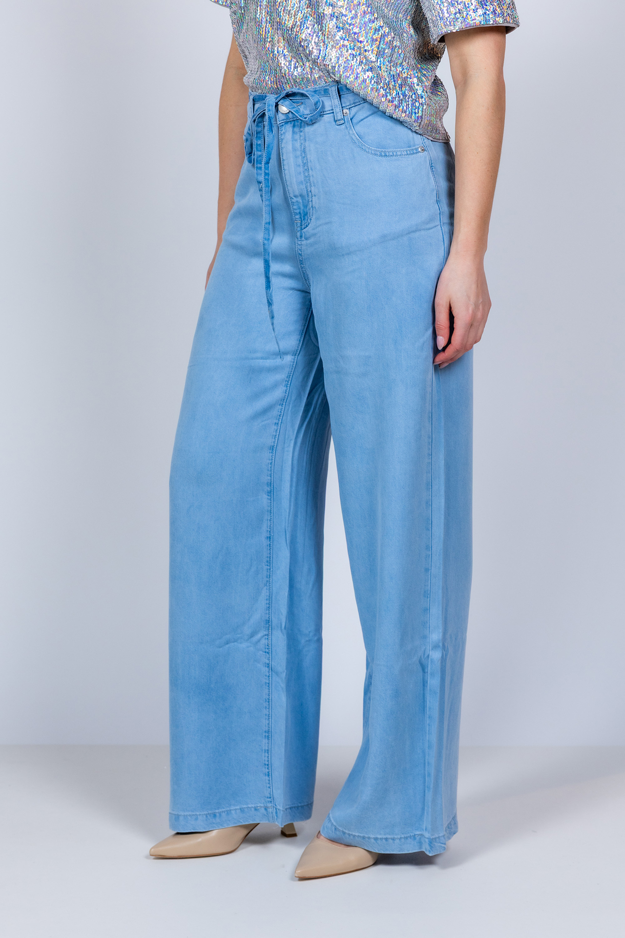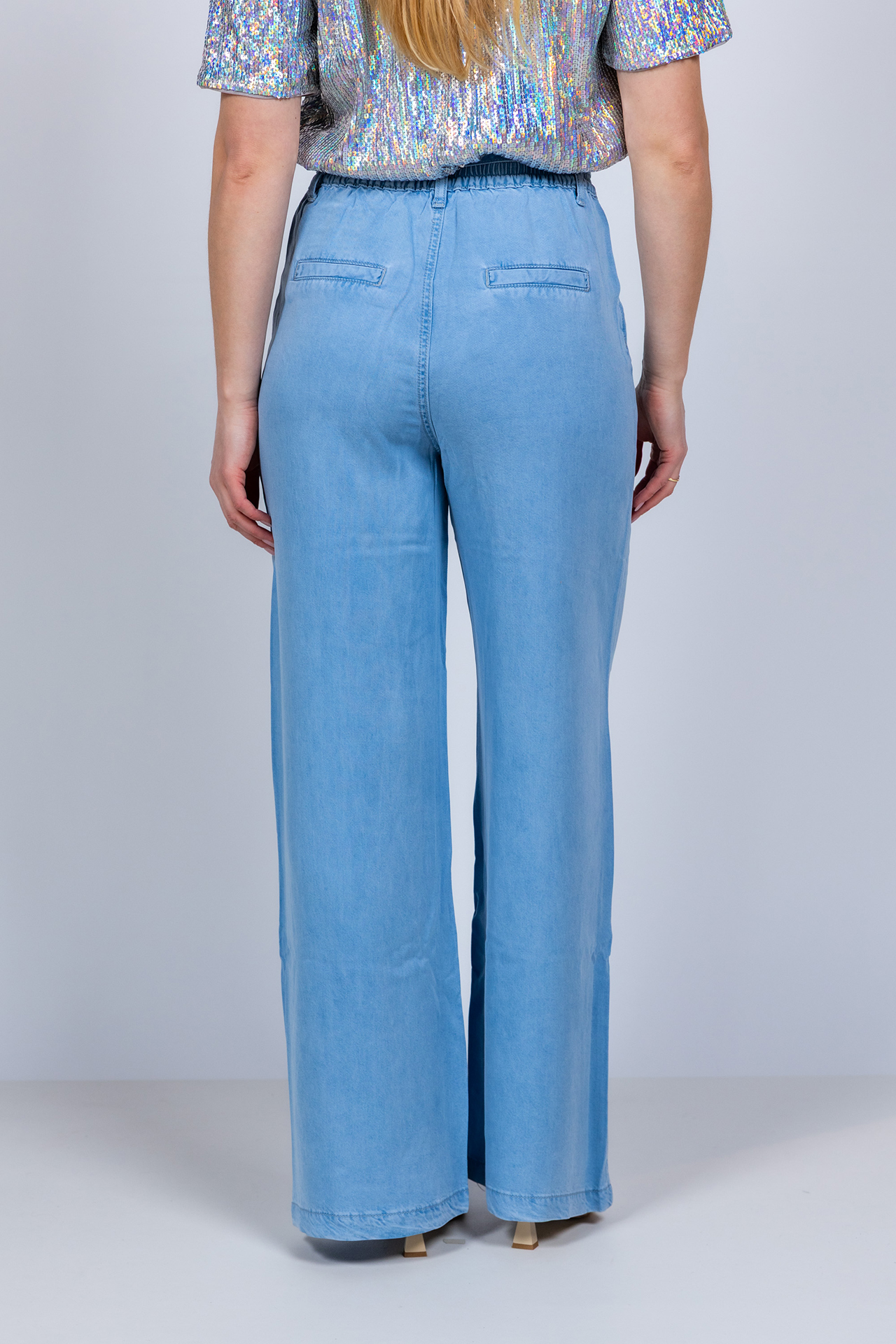 Dunne jeans met wijde pijpen, een knoop- en ritssluiting, lusjes en elastiek in de band. Hij heeft steekzakken aan de voorkant en fake zakken aan de achterkant