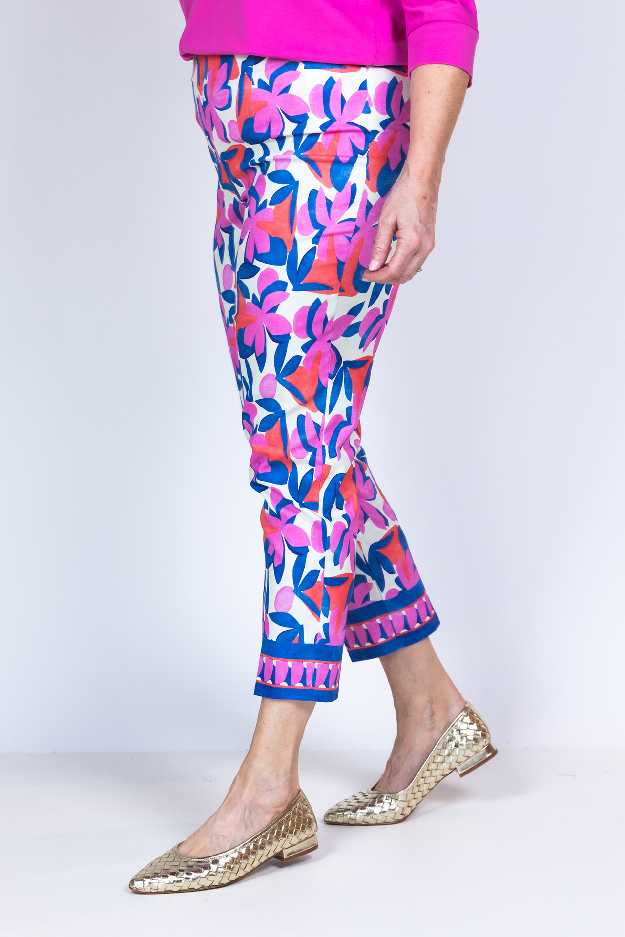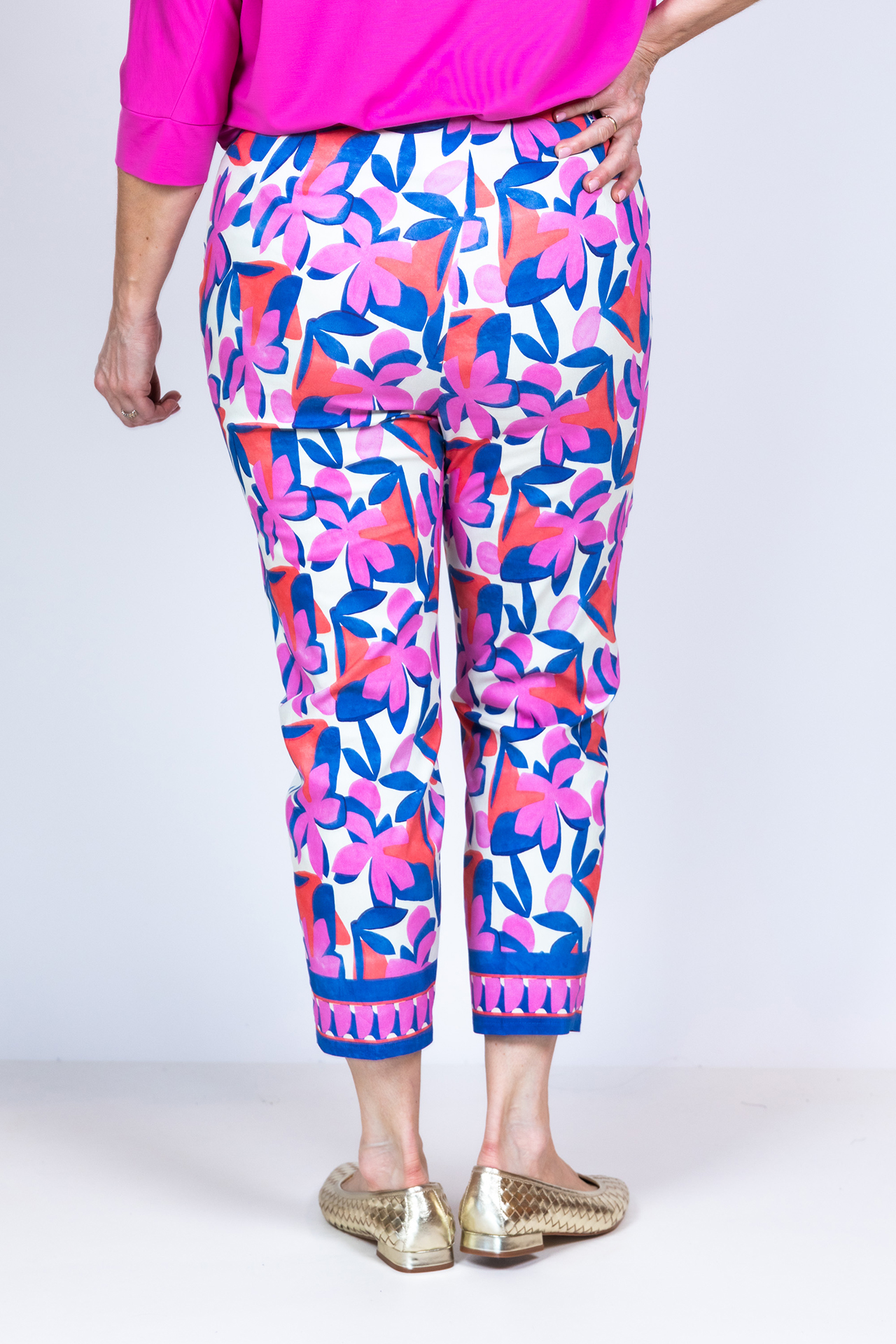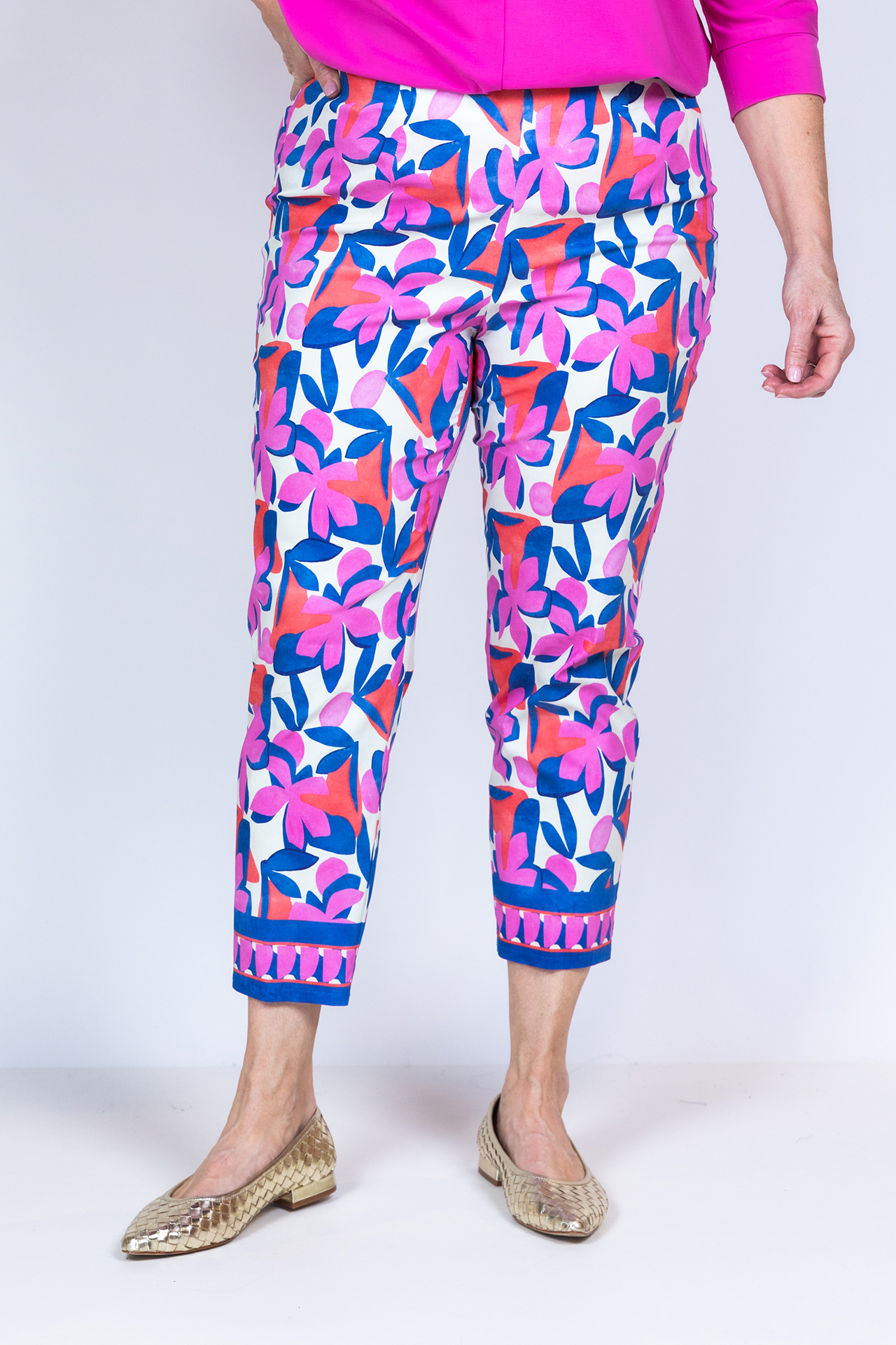 Broek met een elastische band in de taille, een all-over gekleurd bloemdessin en stretch in de stof waardoor hij comfortabel draagt