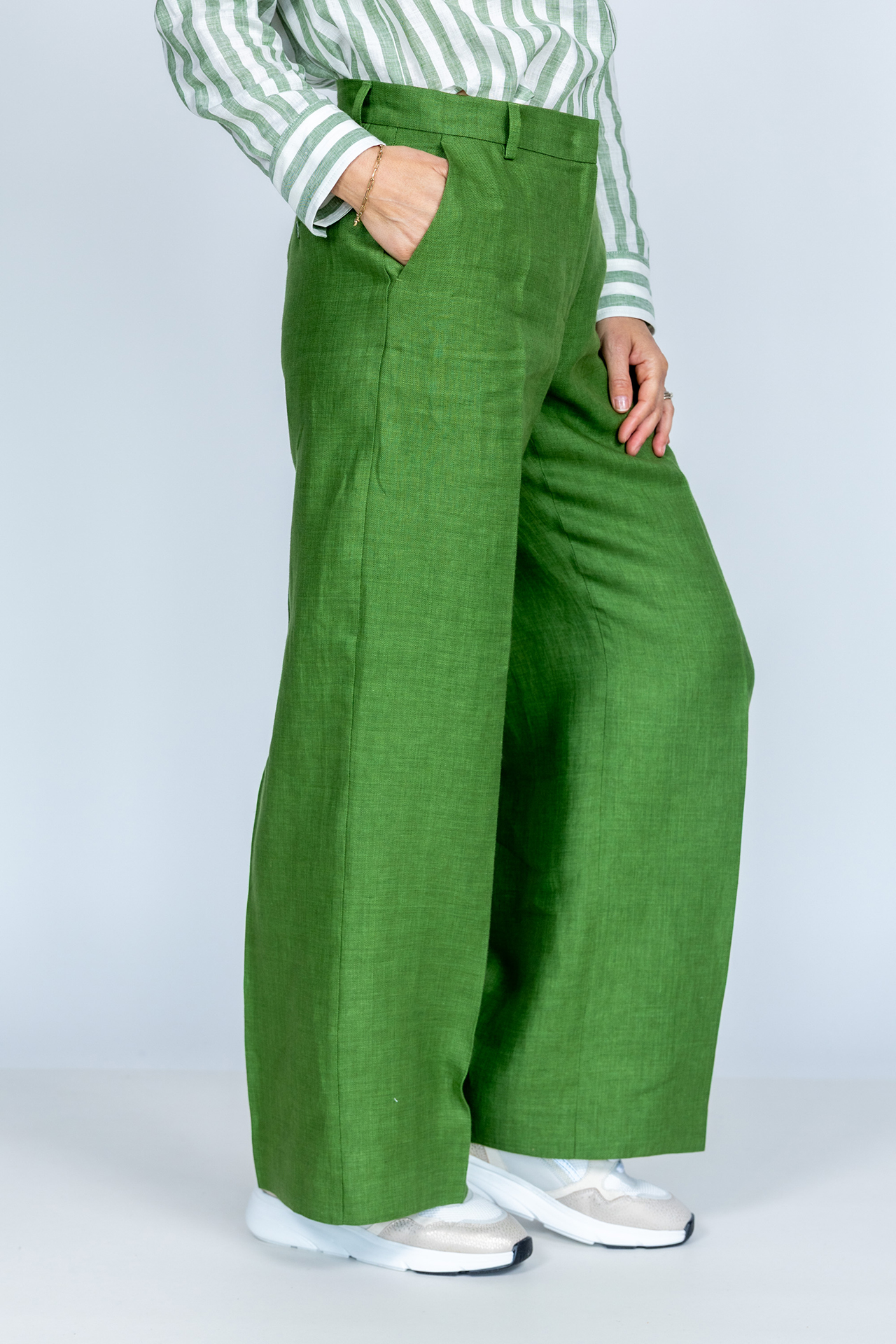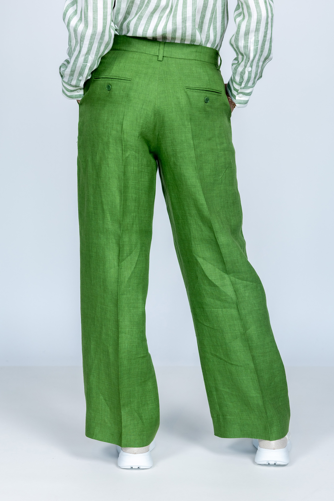 Linnen broek met een haak- en ritssluiting en lusjes in de band voor een ceintuur. Hij heeft steekzakken aan de voorkant en paspelzakken aan de achterkant