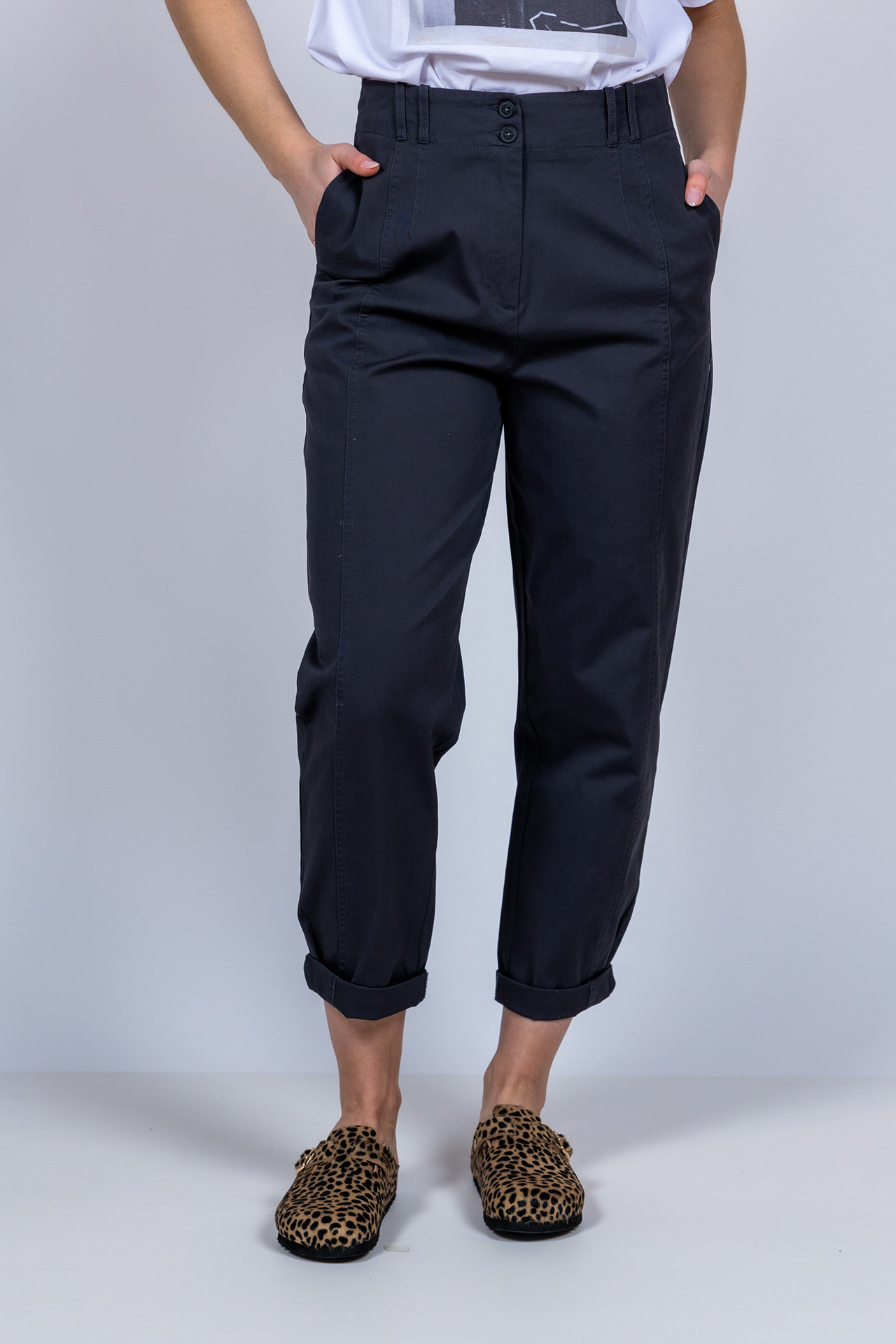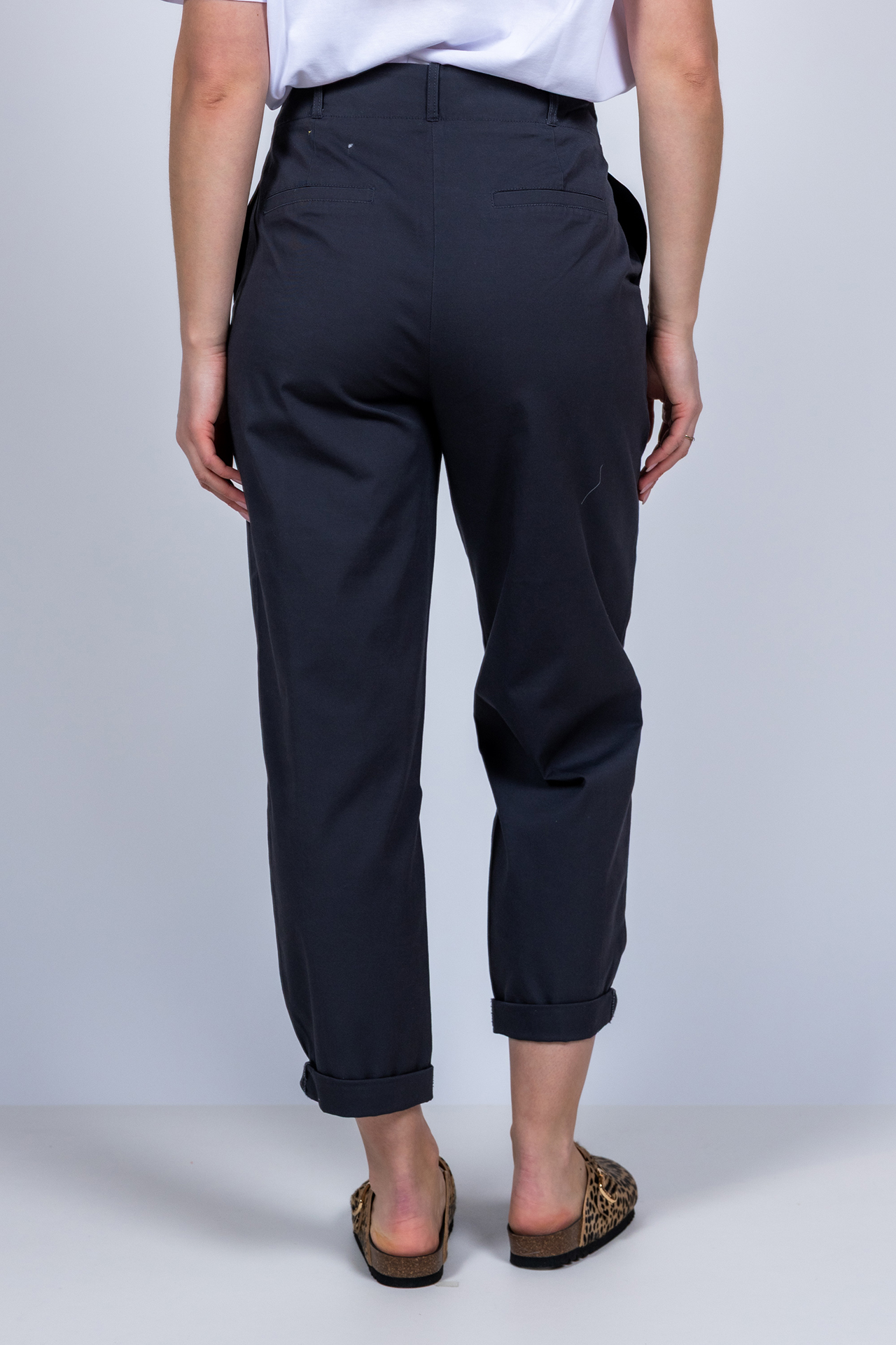 Broek met een knoop- en ritssluiting en lusjes in de band voor een ceintuur. Hij heeft steekzakken aan de voorkant, fake zakken aan de achterkant en stretch in de stof waardoor hij comfortabel draagt