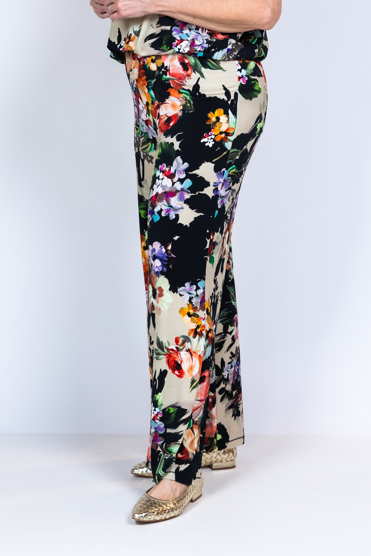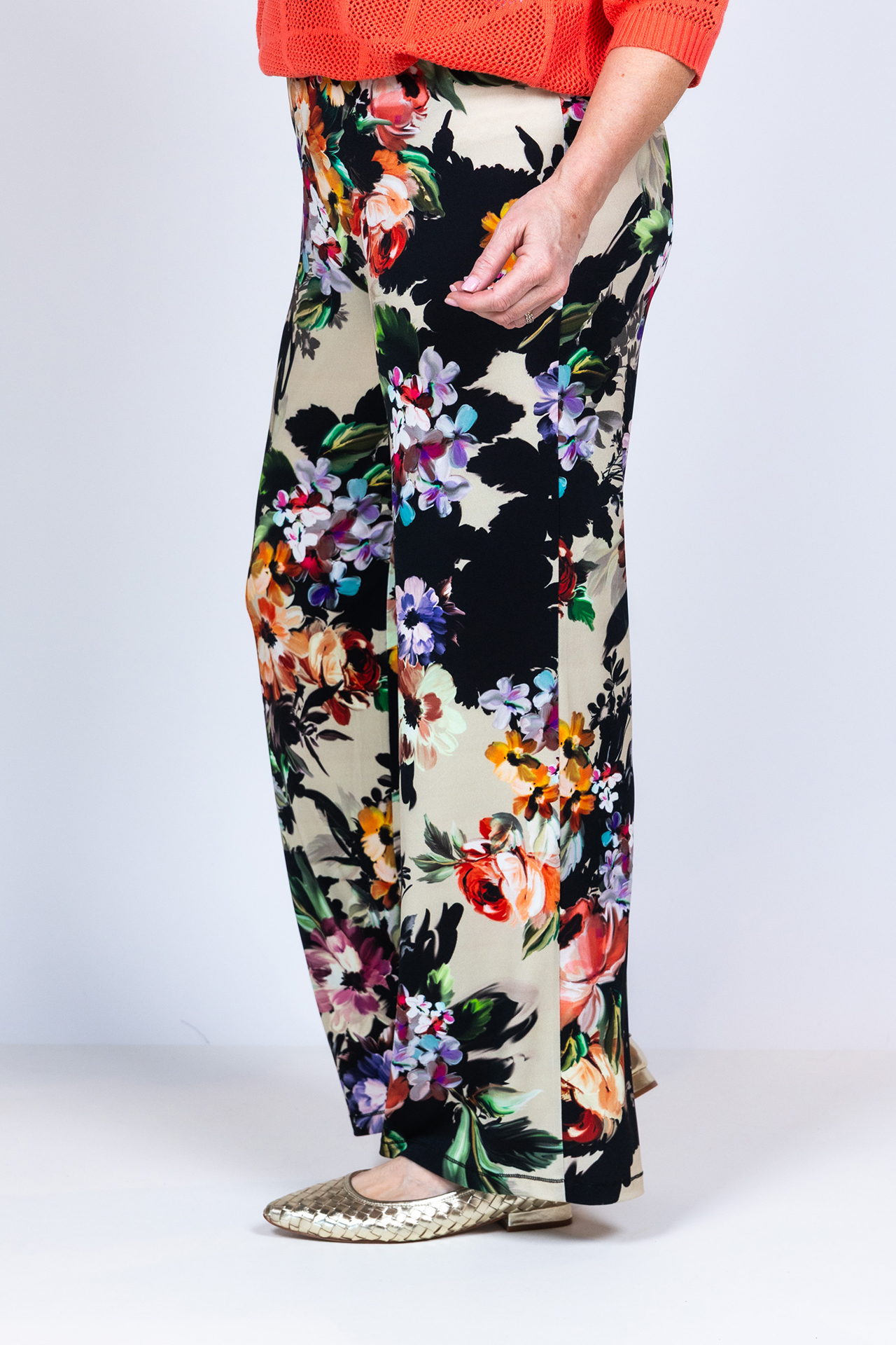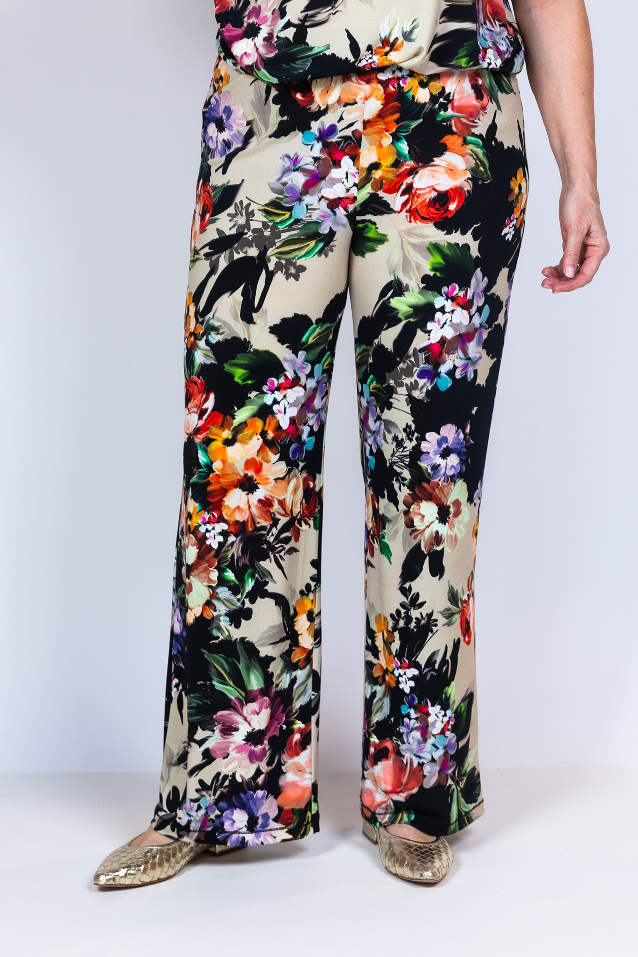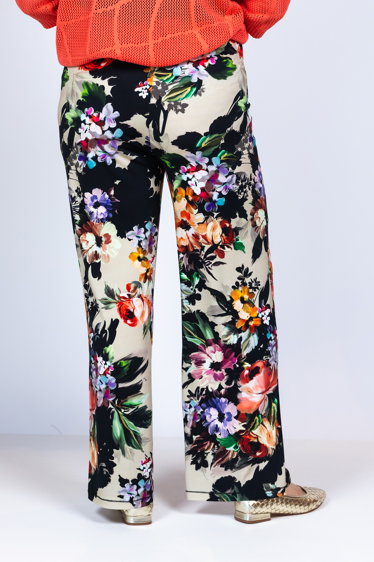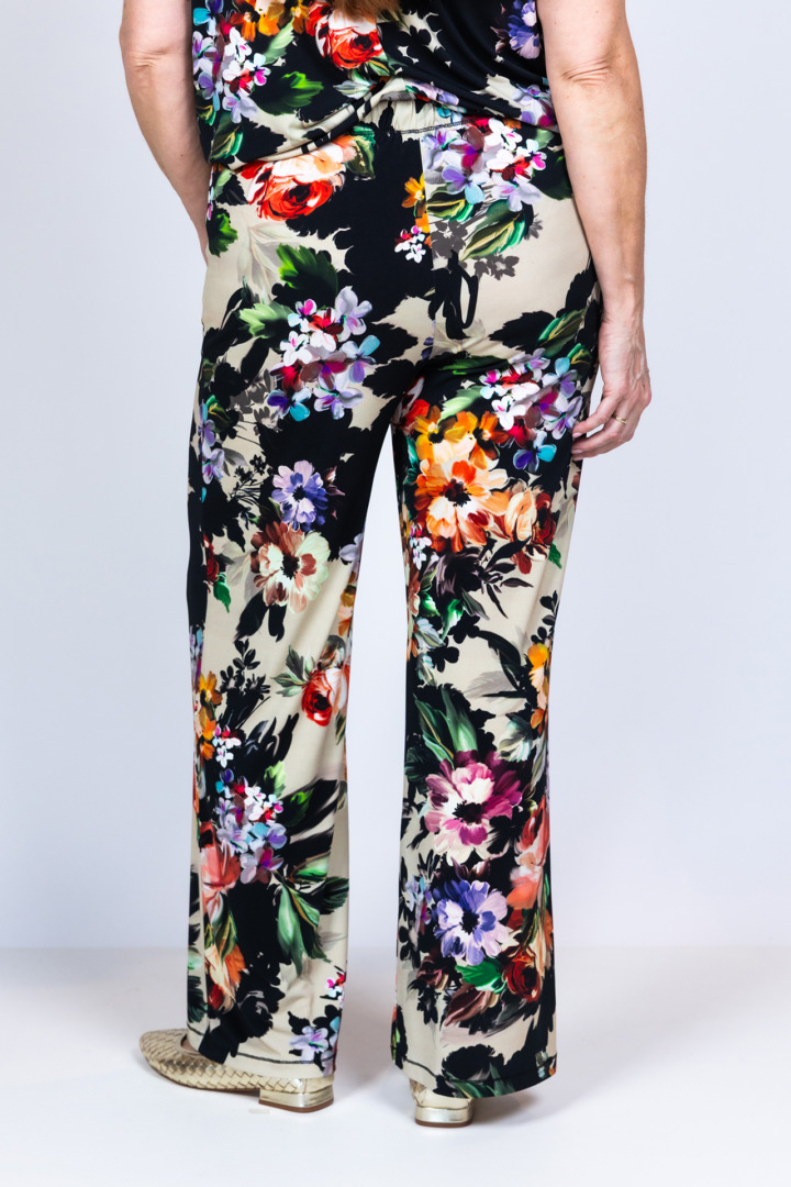 Soepel vallende pantalon met een elastische band in de taille, een all-over print met bloemen en stretch in de stof waardoor hij comfortabel draagt