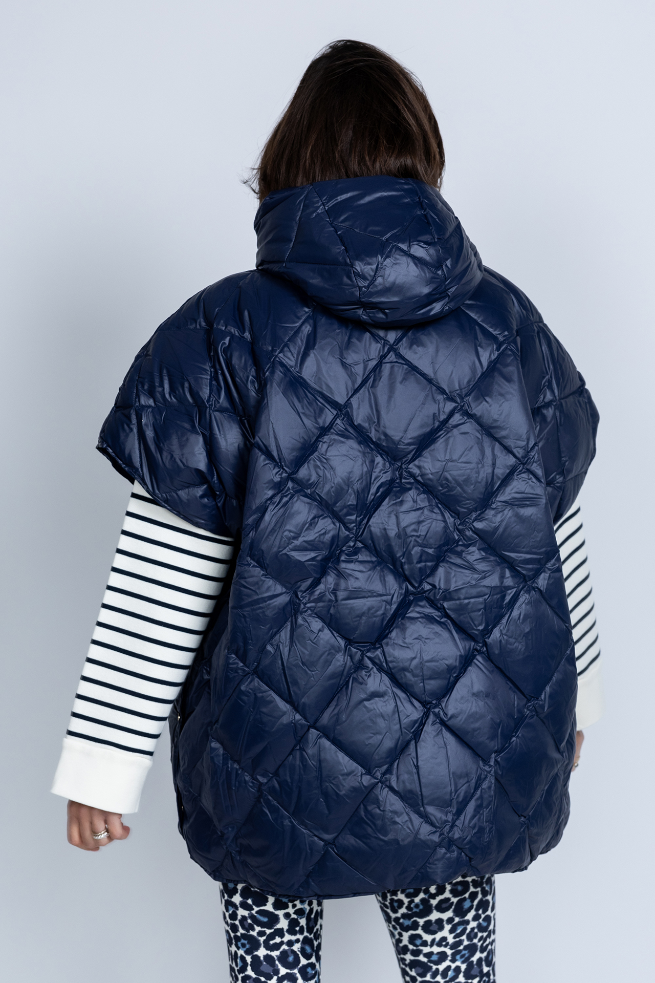 Oversized gewatteerde bodywarmer met korte mouwen, een capuchon, drukknopen aan de zijkant en hij heeft een ritssluiting