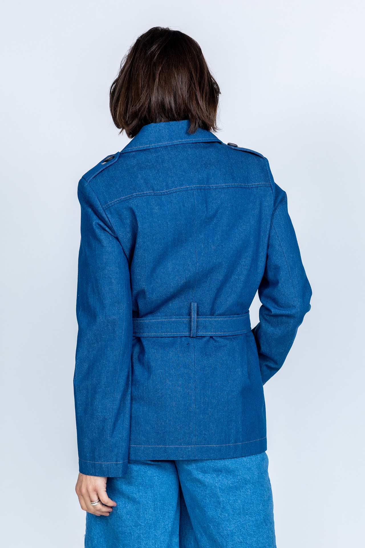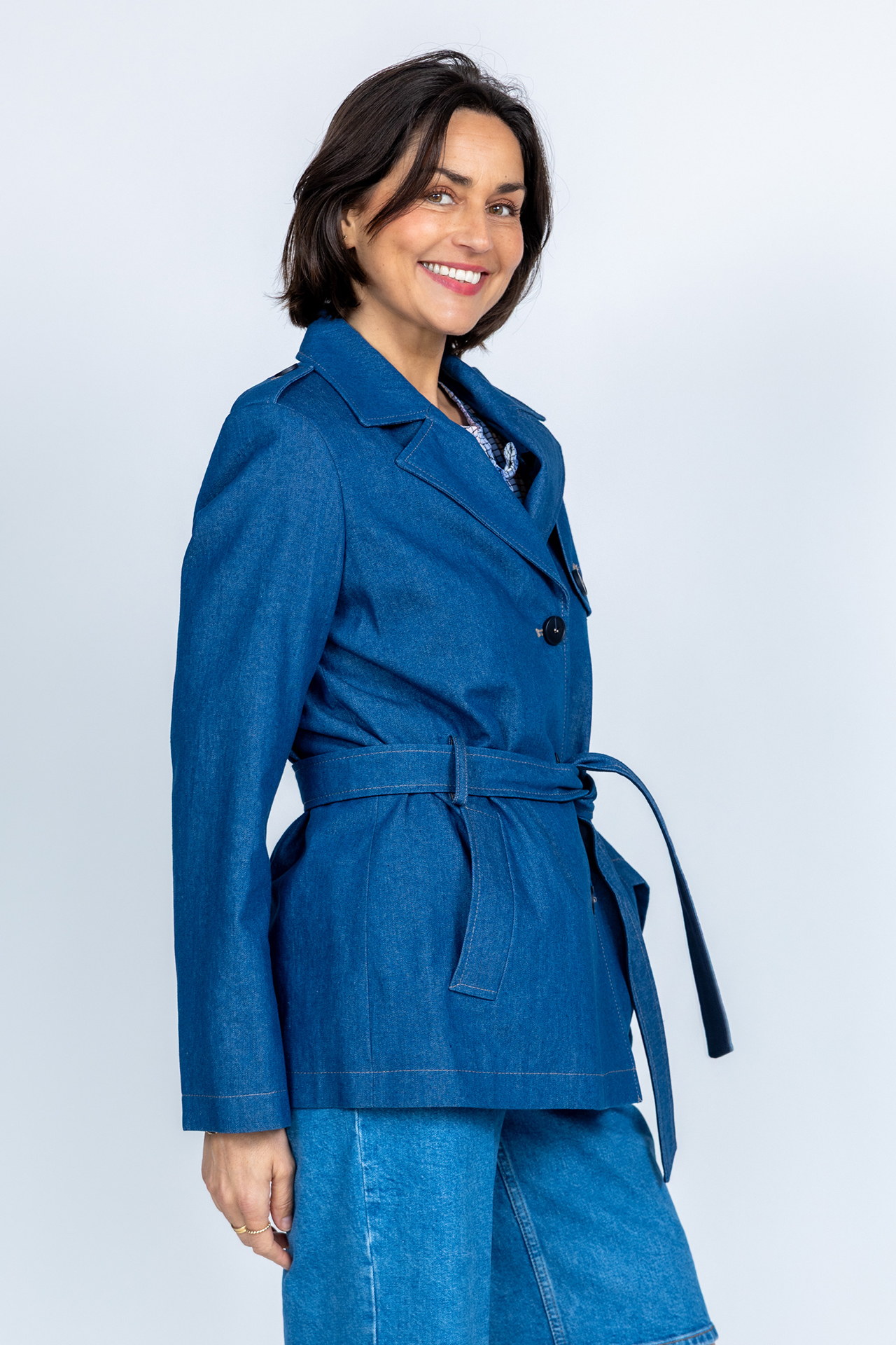 Jeans mantel met een reverskraag, steekzakken en een strikceintuur in de taille