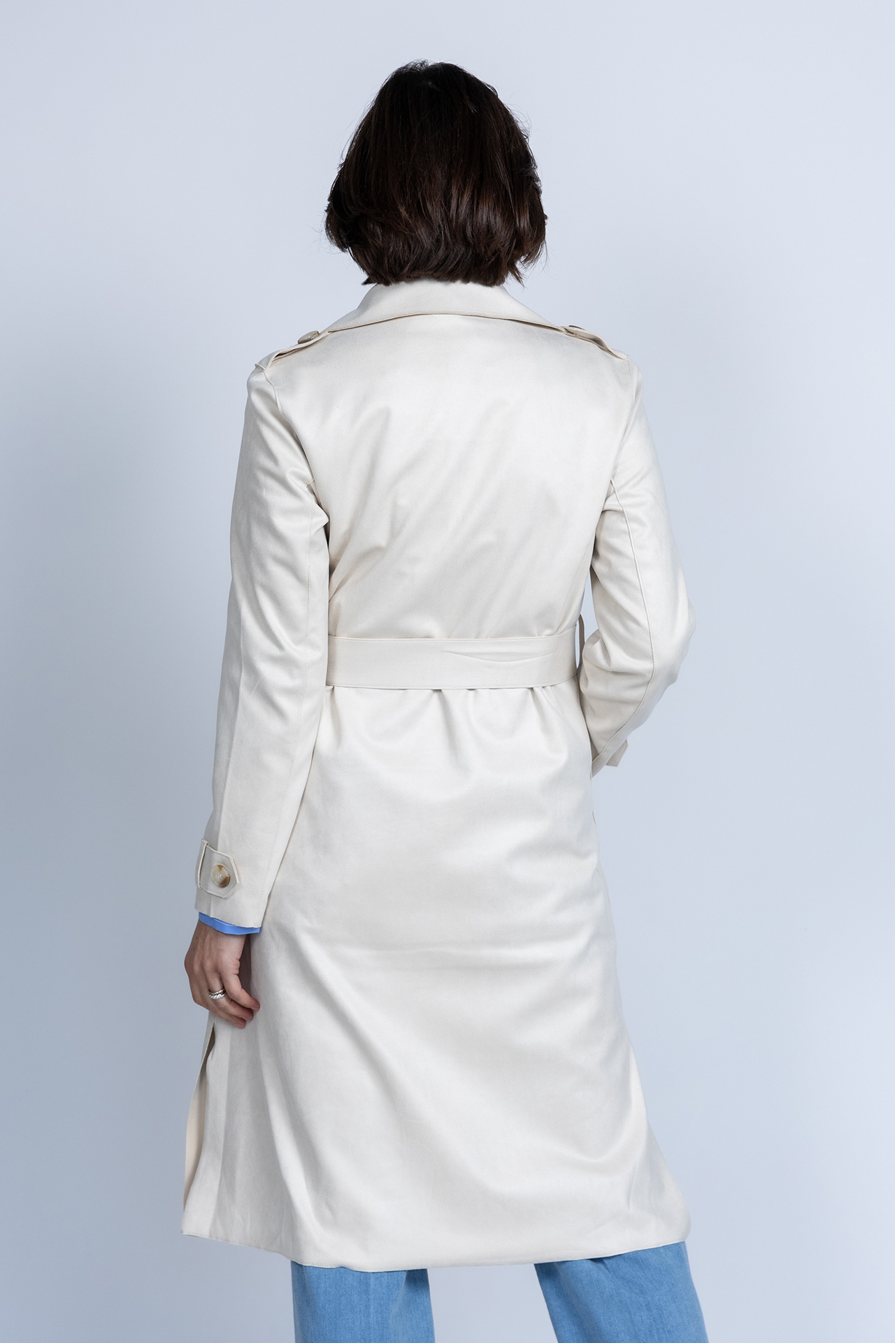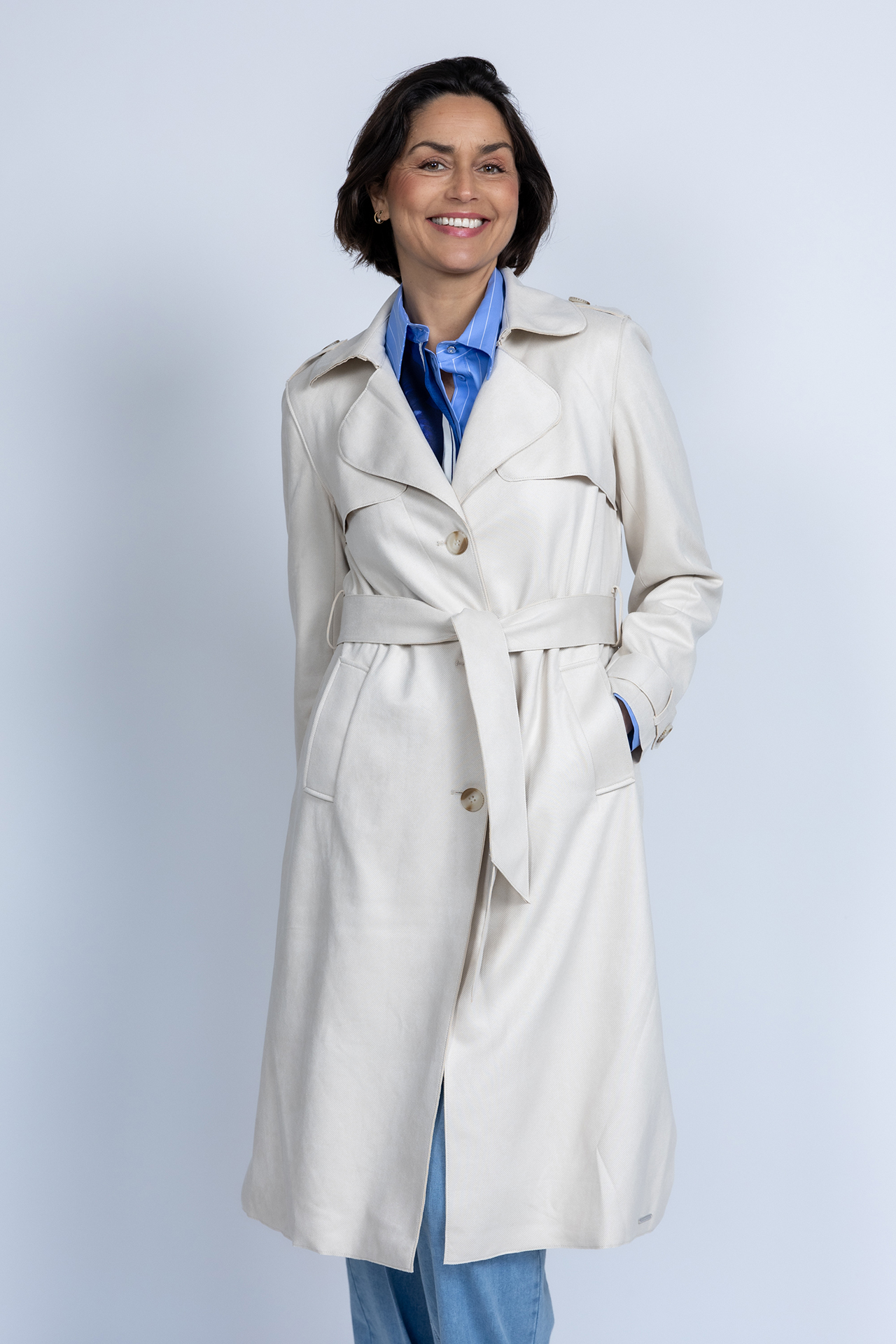 Mantel met een reverskraag, steekzakken en knopen aan de voorkant. Hij heeft een strikceintuur in de taille, splitten aan de zijkant en stretch in de stof waardoor hij comfortabel draagt
