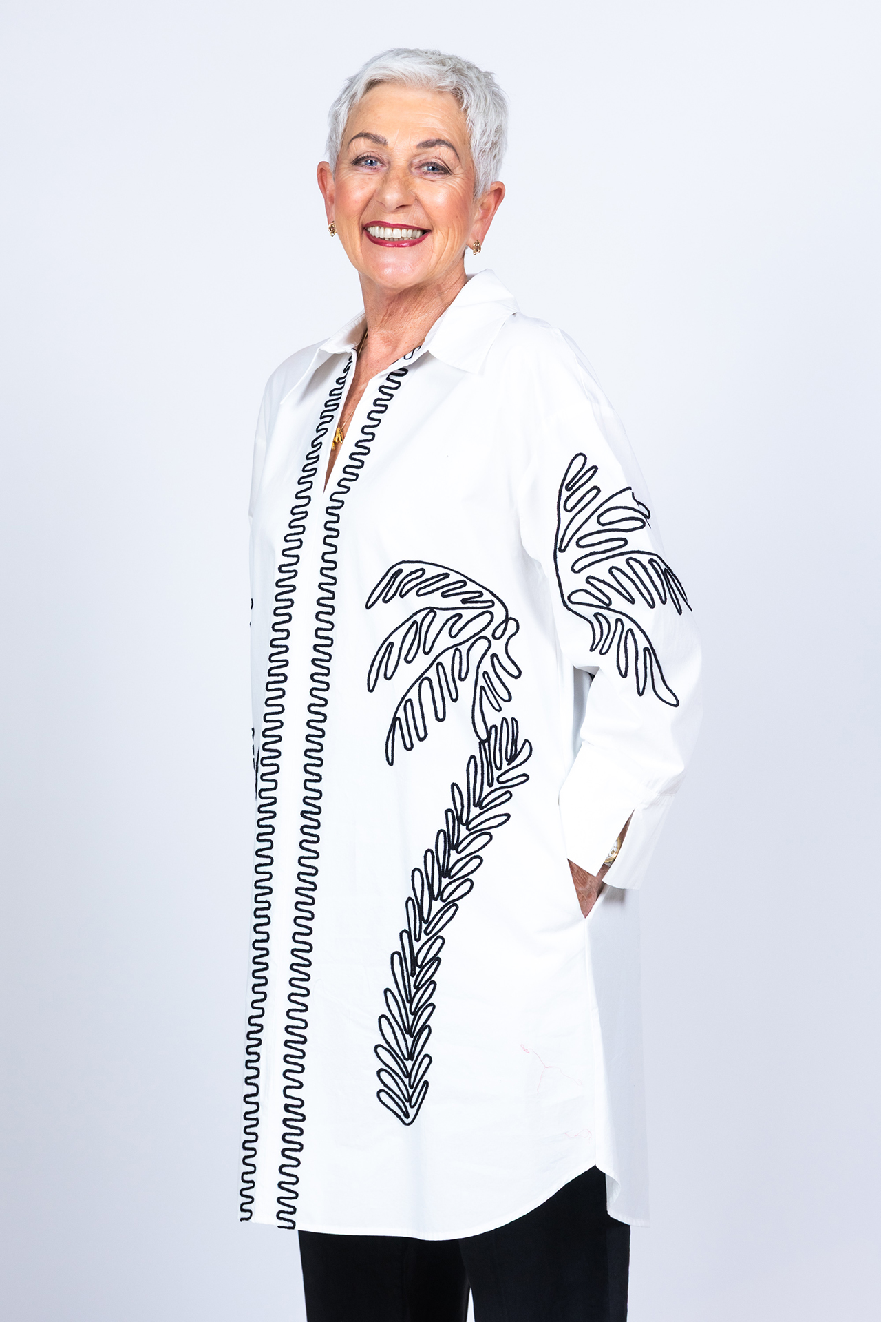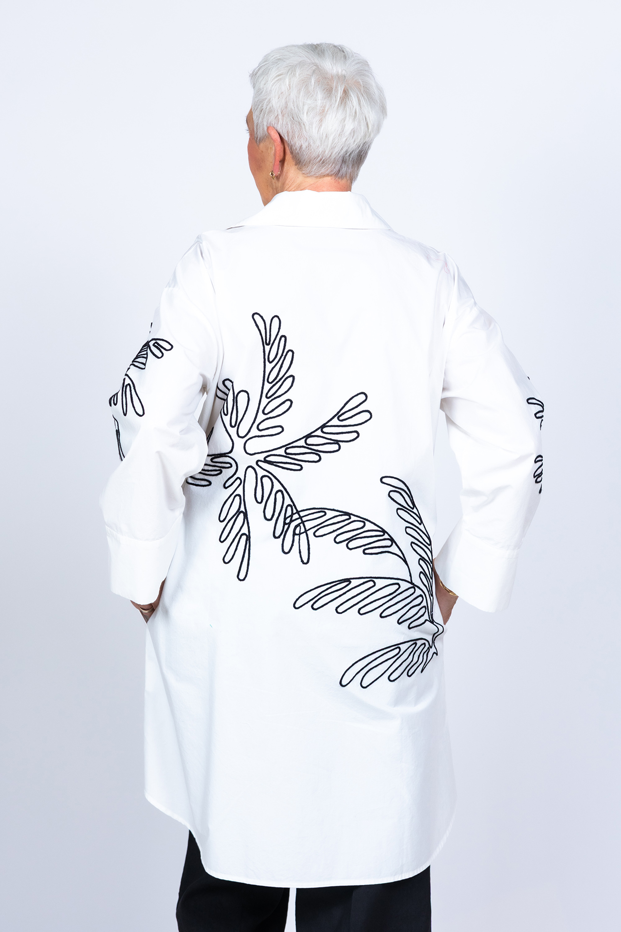 Katoenen jurk met zwarte borduursels, lange mouwen en steekzakken aan de zijkant