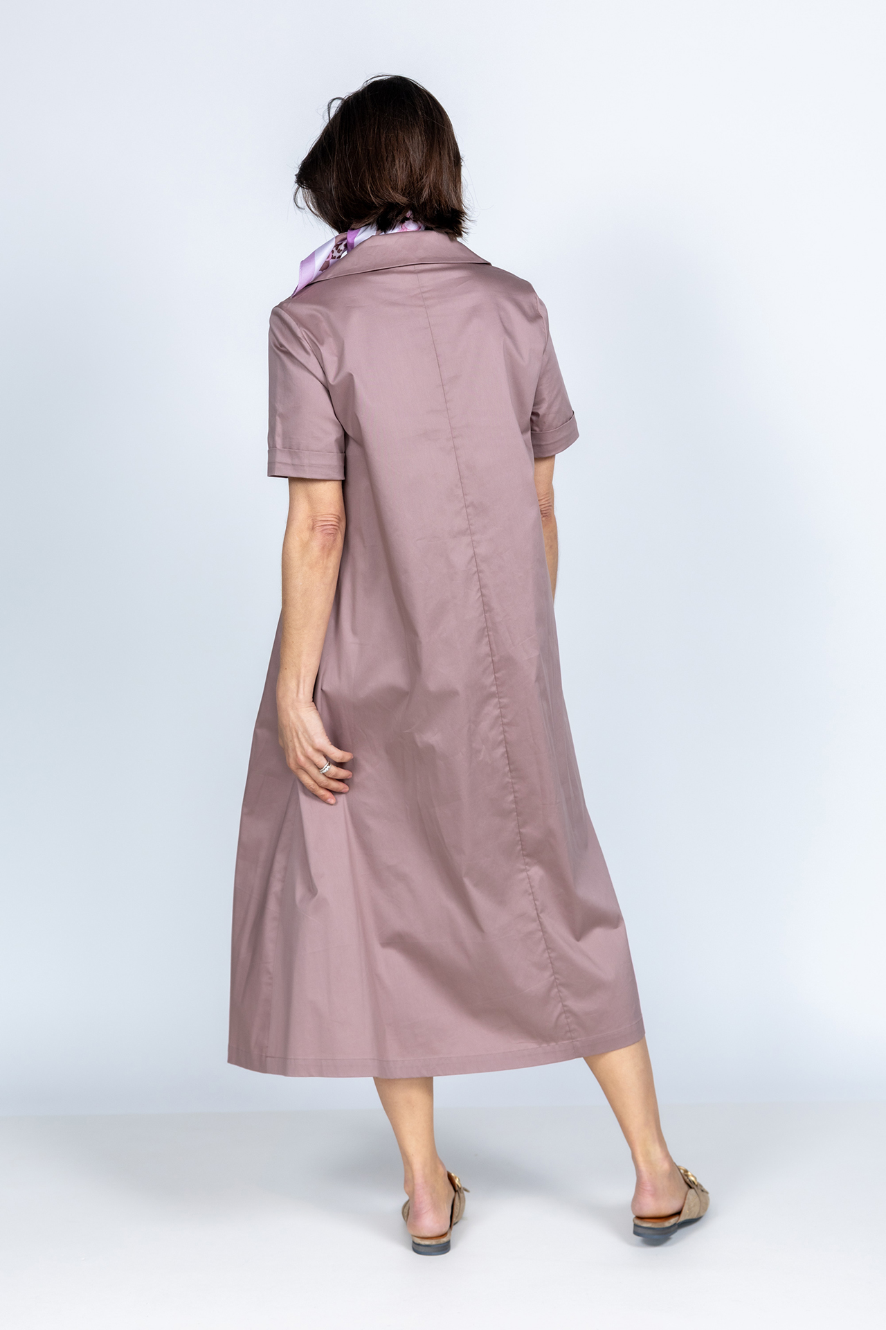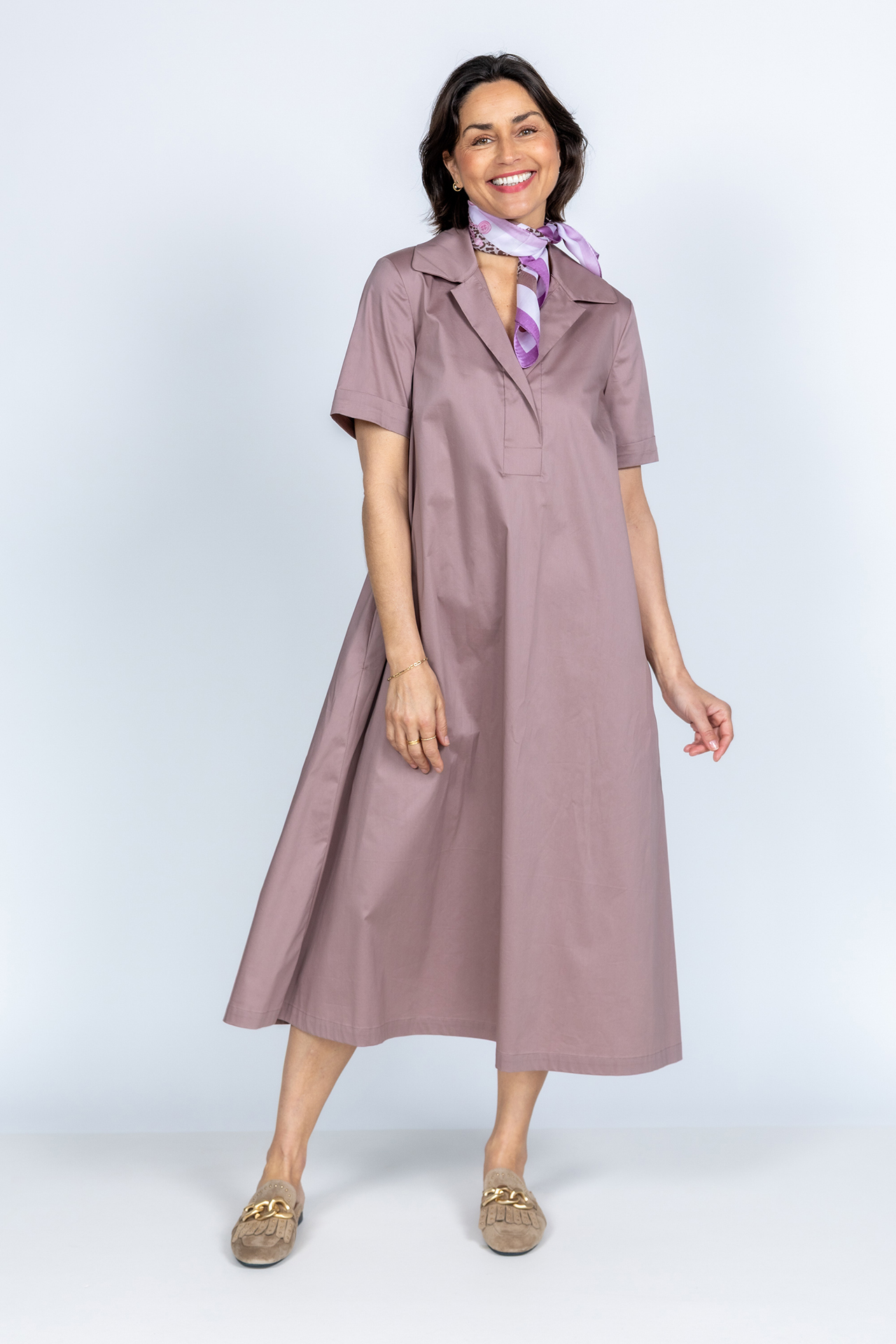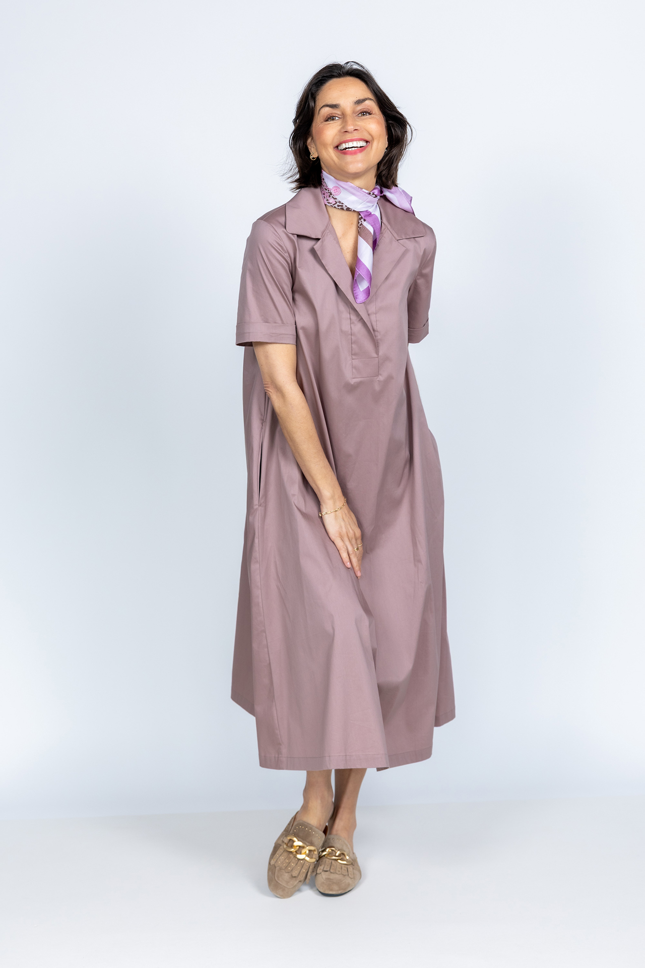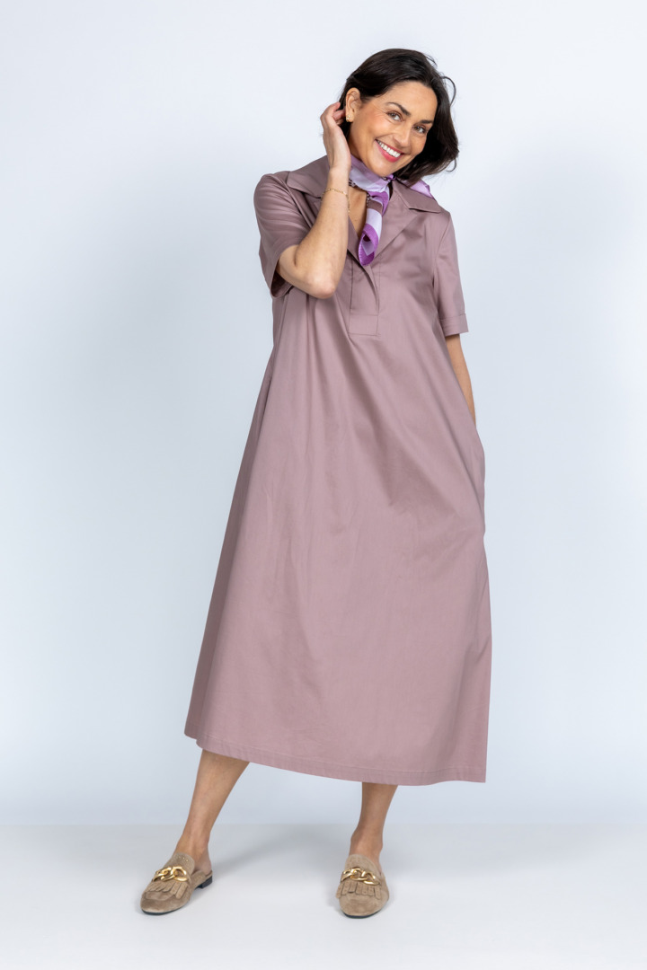 A-lijn jurk met een kraagje, korte mouwen, steekzakken en stretch in de stof waardoor hij comfortabel draagt