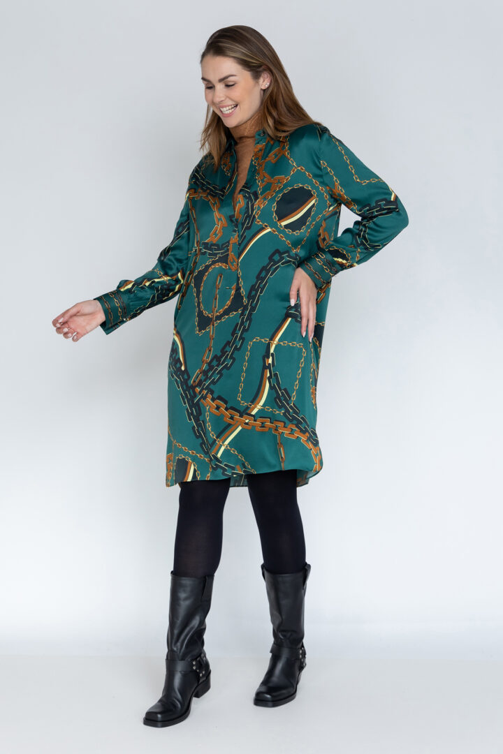 Zijde jurk met een kraagje, all-over print met kettingen, zakken aan de zijkant en er zit stretch in de stof waardoor hij heerlijk zit
