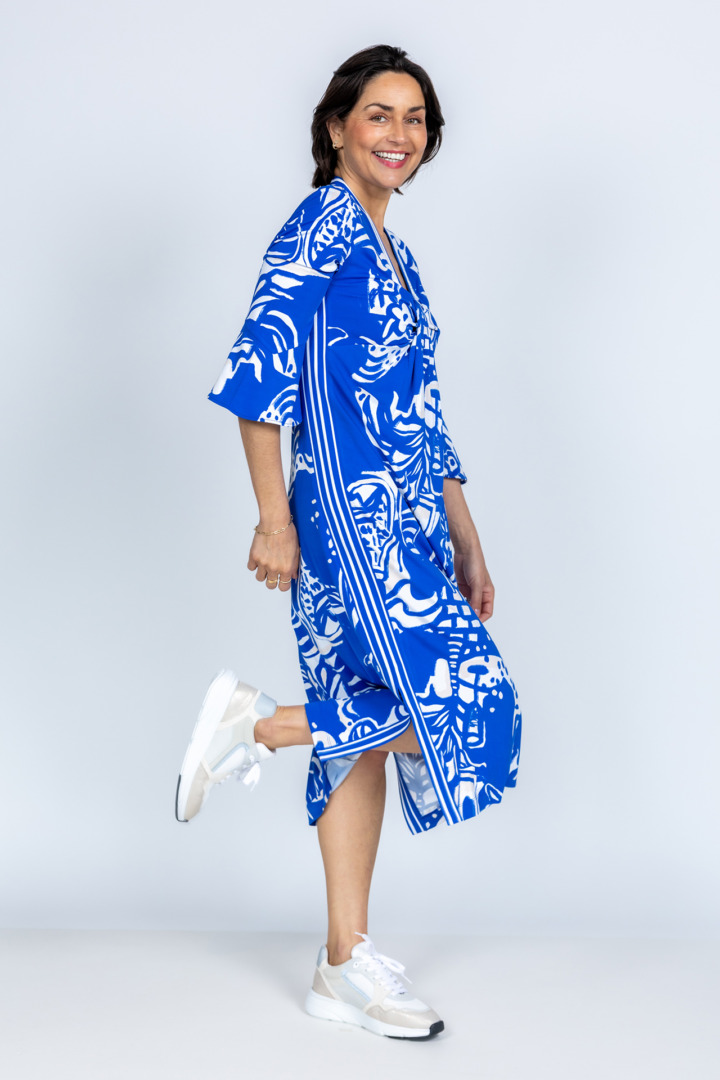 Soepel vallende jurk met een V-hals, driekwart mouwen met uitlopende manchetten en een draaiknoop aan de voorkant. Hij heeft een unieke print in kobaltblauw en een split aan de zijkant