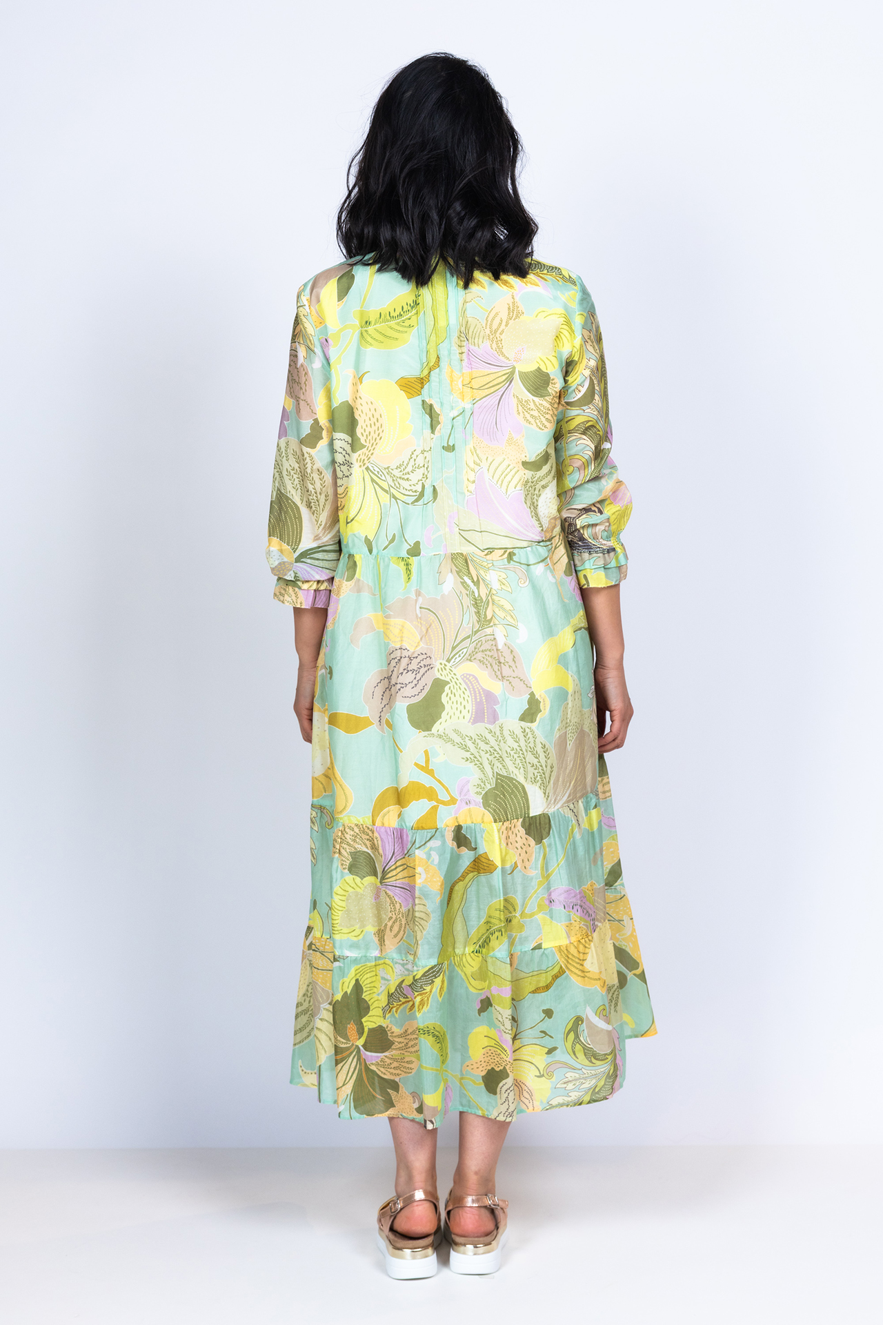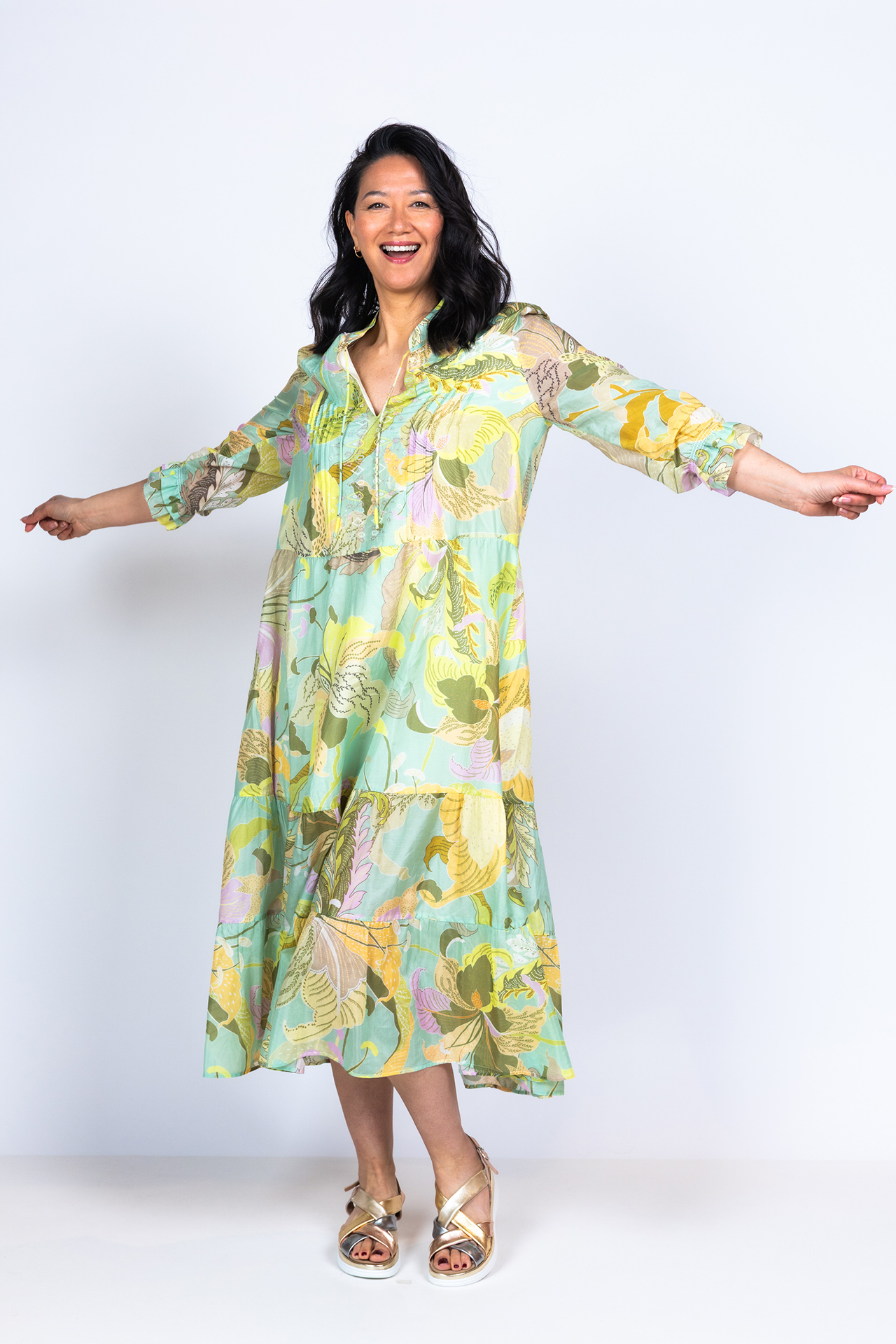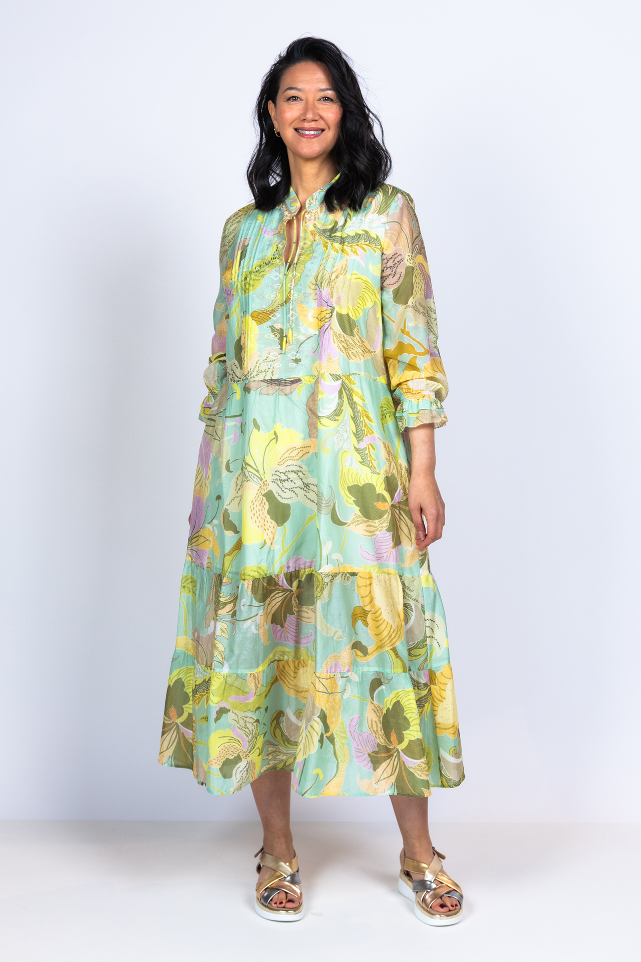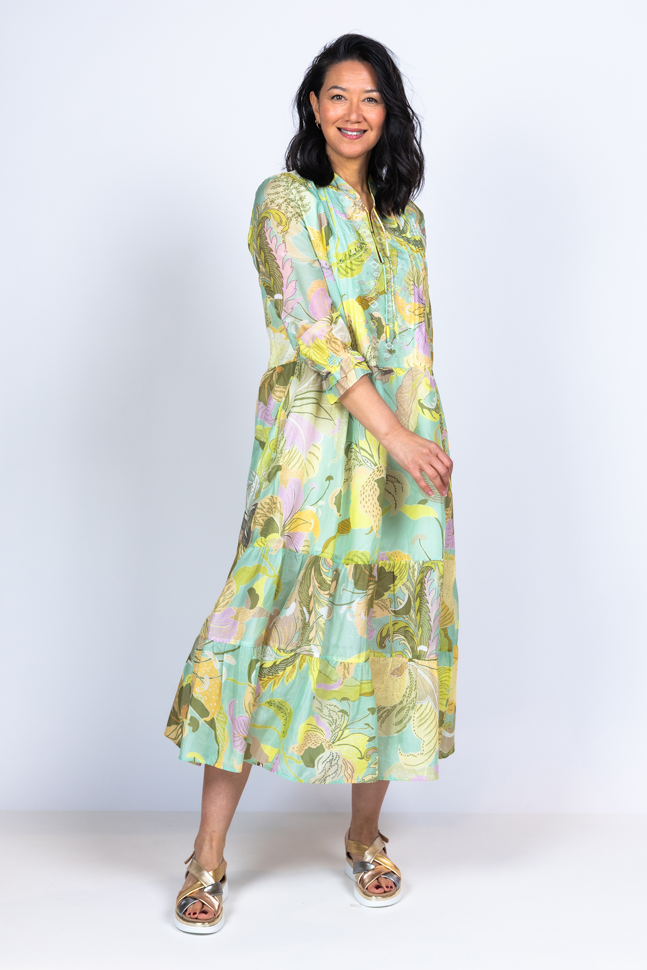 Katoen- en zijdemix strokenjurk met driekwart mouwen met elastiek aan de manchetten. Hij heeft een fris all-over dessin in pasteltinten en koordjes aan de hals