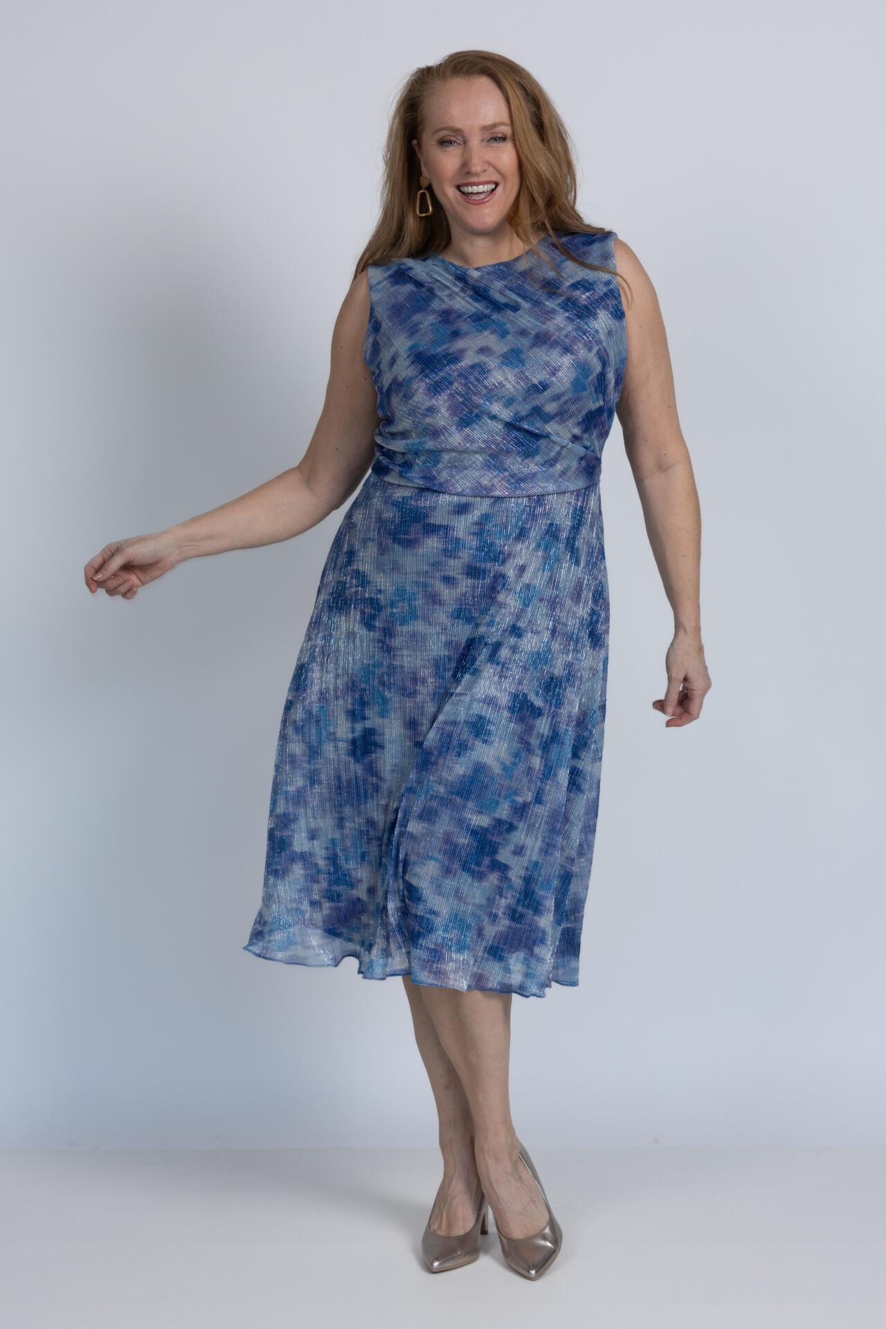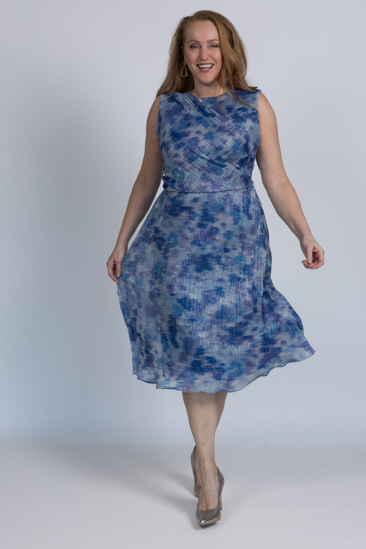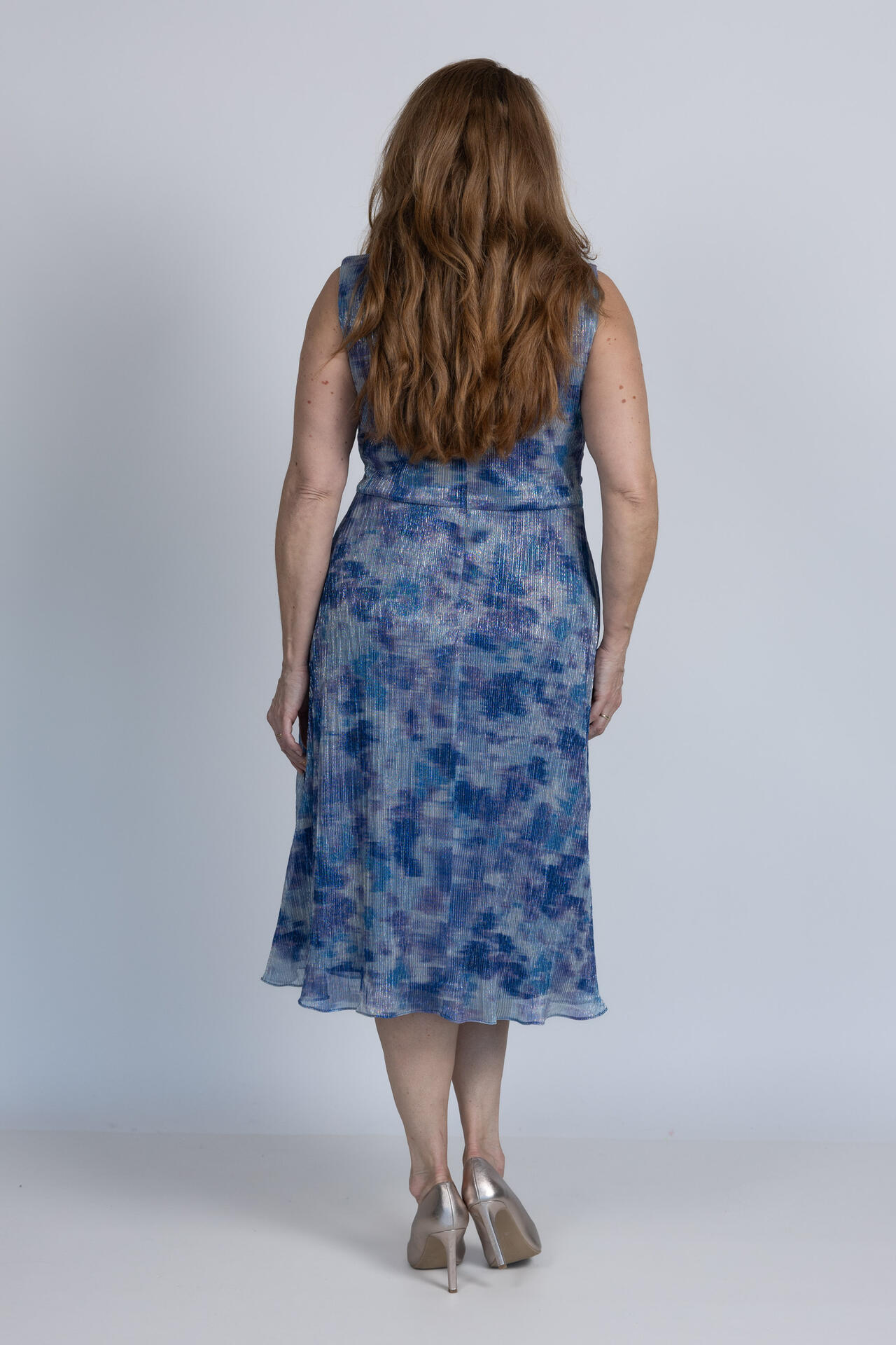 Mouwloos jurkje met een zwierige rok, ronde hals en rits aan de achterkant. Hij heeft een dessin in verschillende kleuren blauw en glitters in de stof