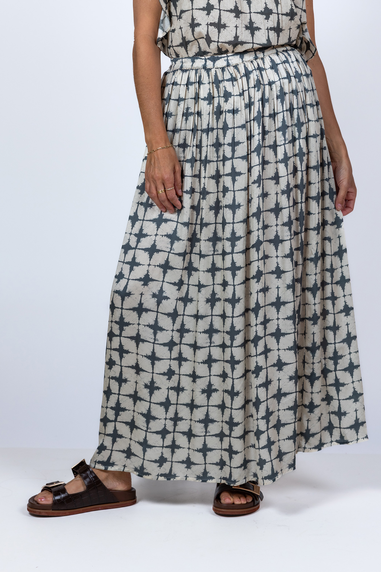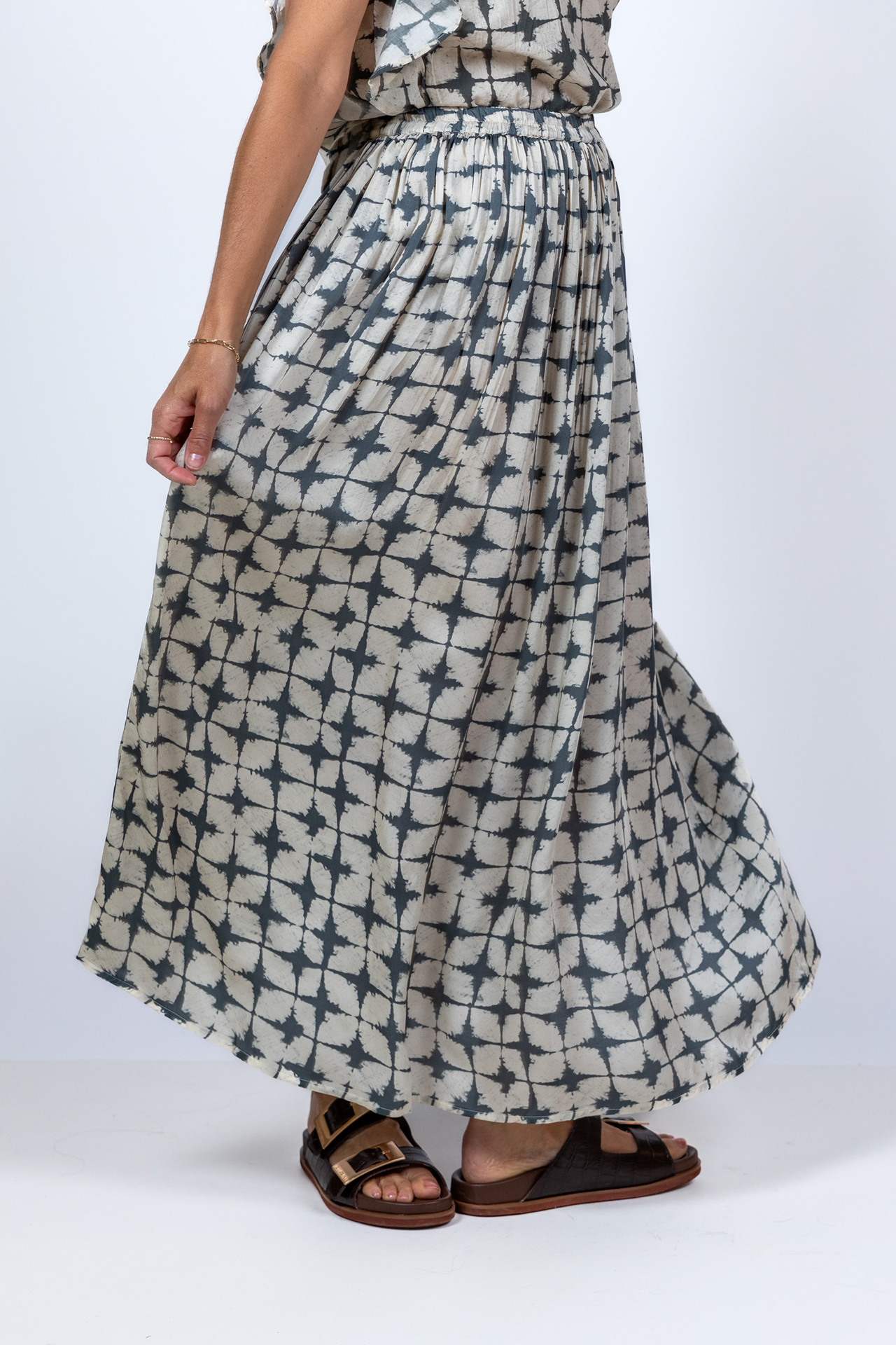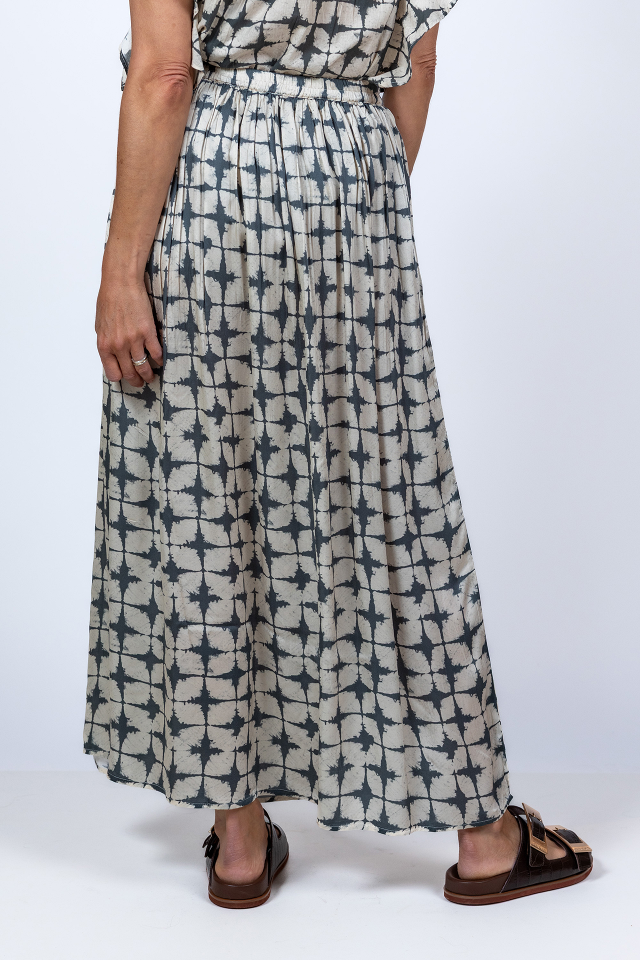 Dunne viscose rok met een elastische band en plooitjes in de taille en hij heeft een all-over dessin