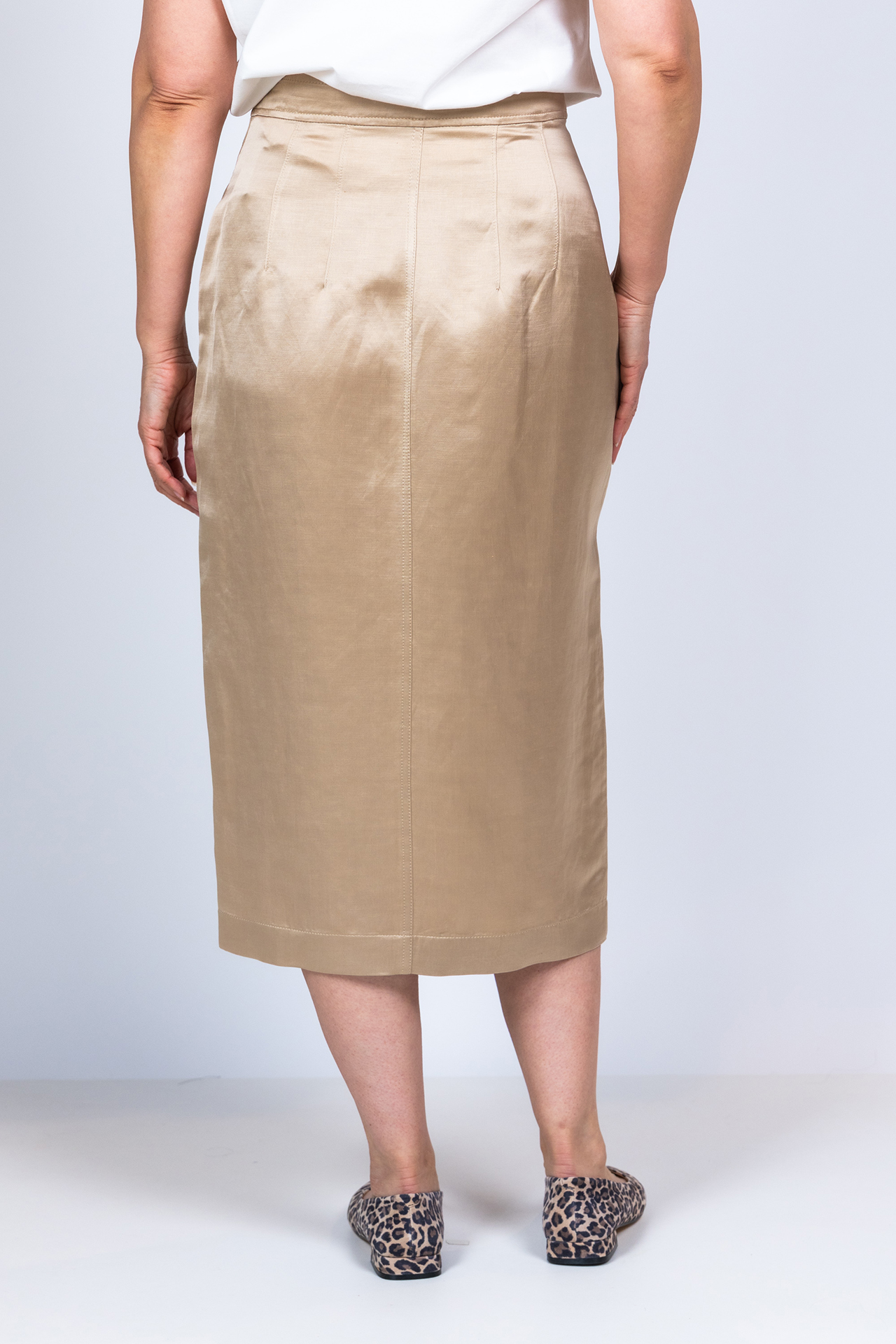 Elegante rok met een rits aan de voorkant. Hij heeft 2 klepzakken aan de voorkant en is gemaakt van een glanzende stof