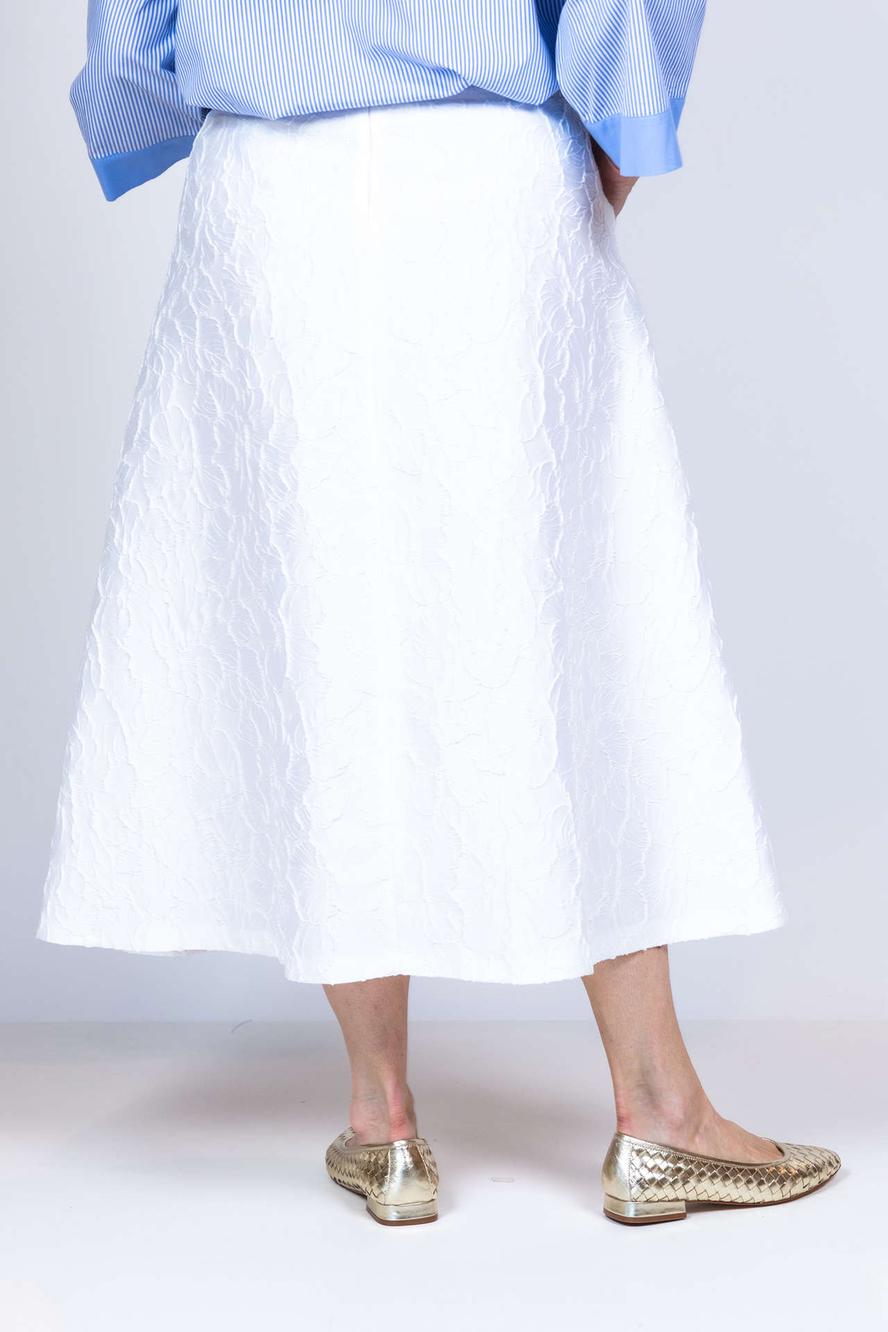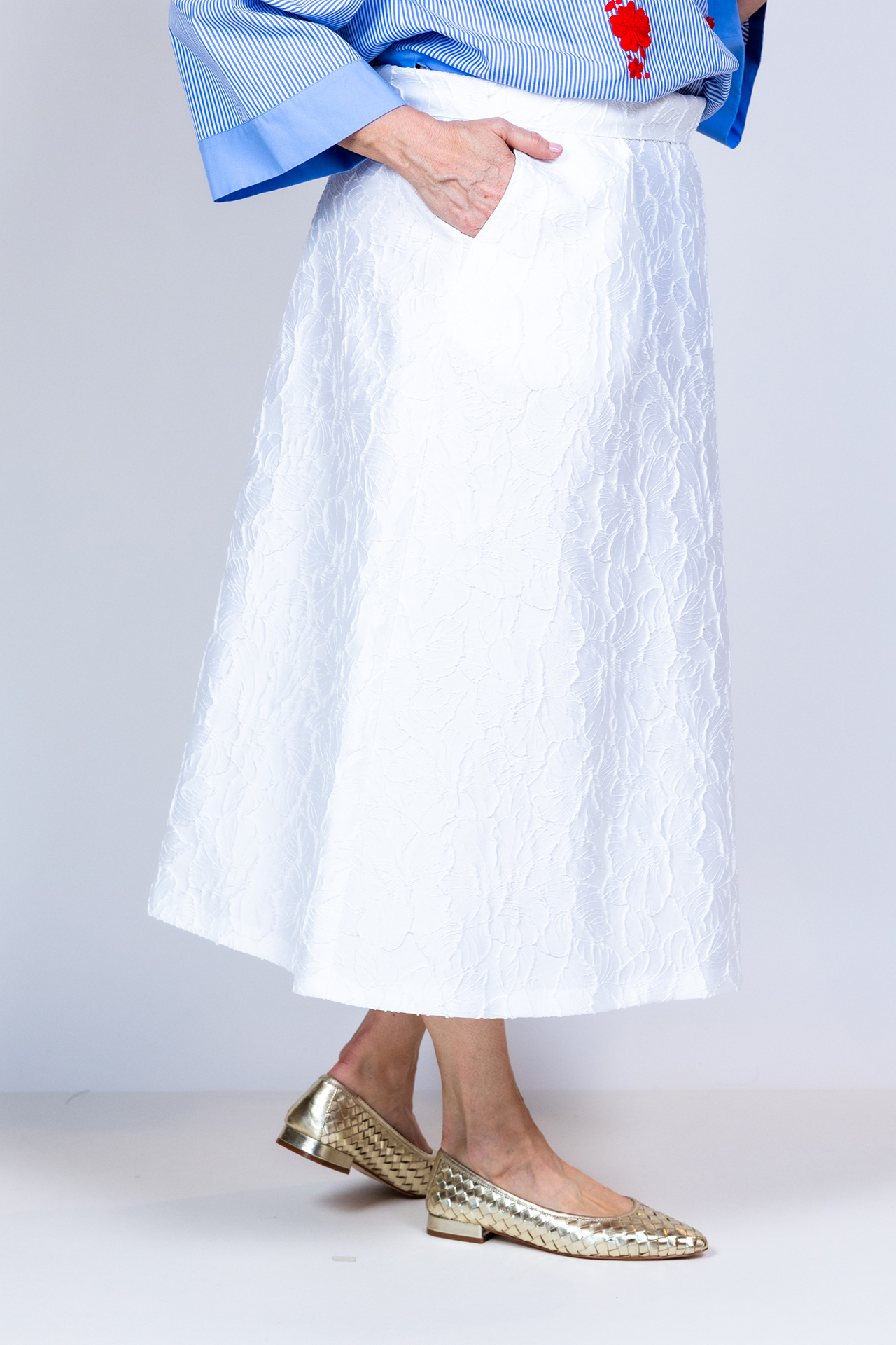 A-lijn rok met een rits aan de achterkant, structuur in de stof en steekzakken