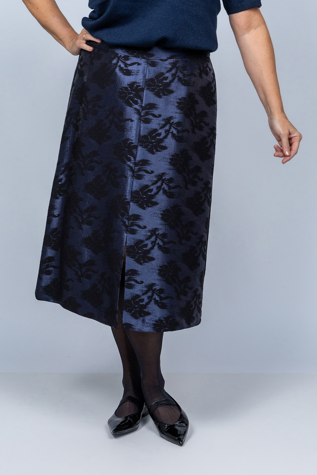 A-lijn glanzende rok met een split aan de voorkant en een zwart dessin