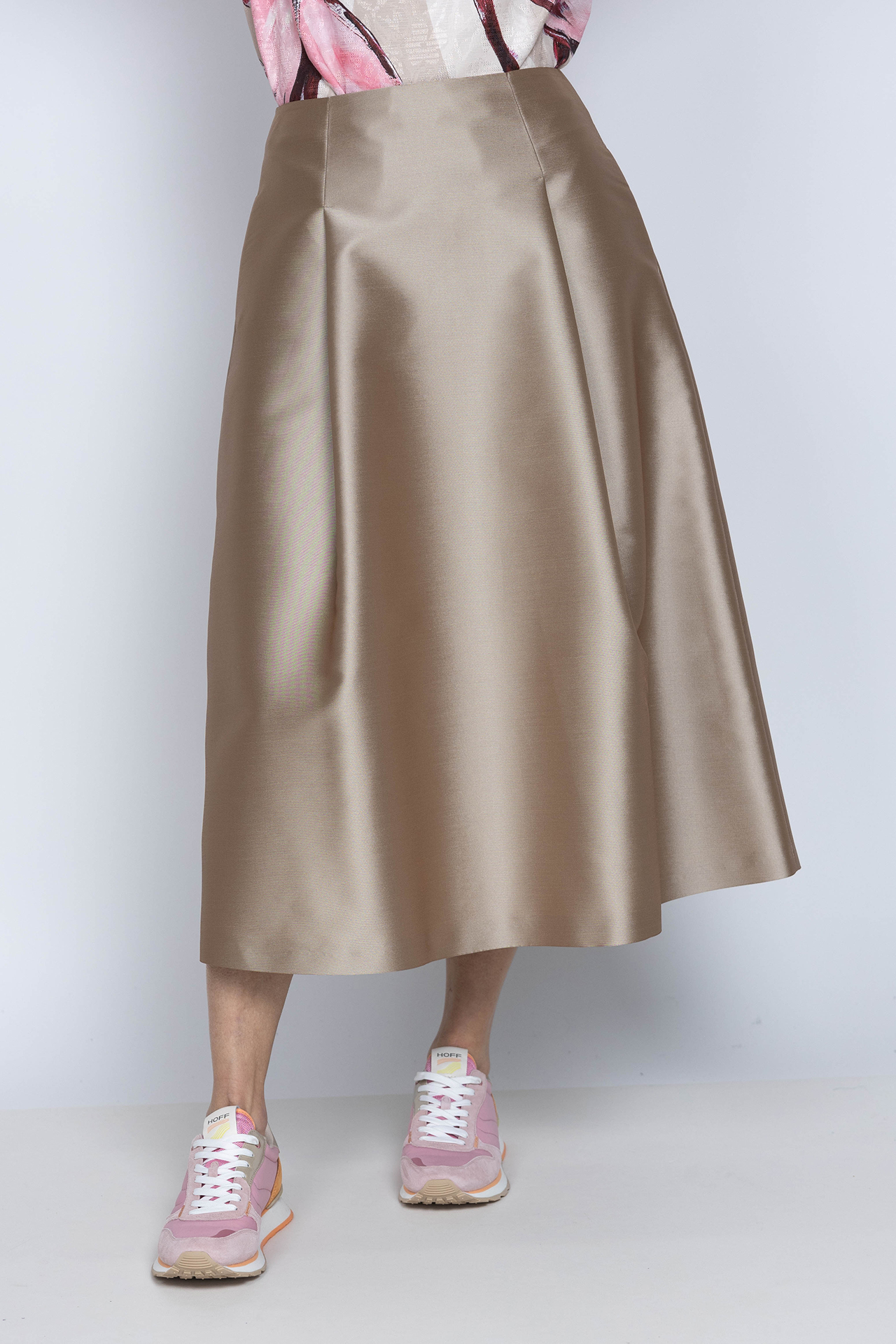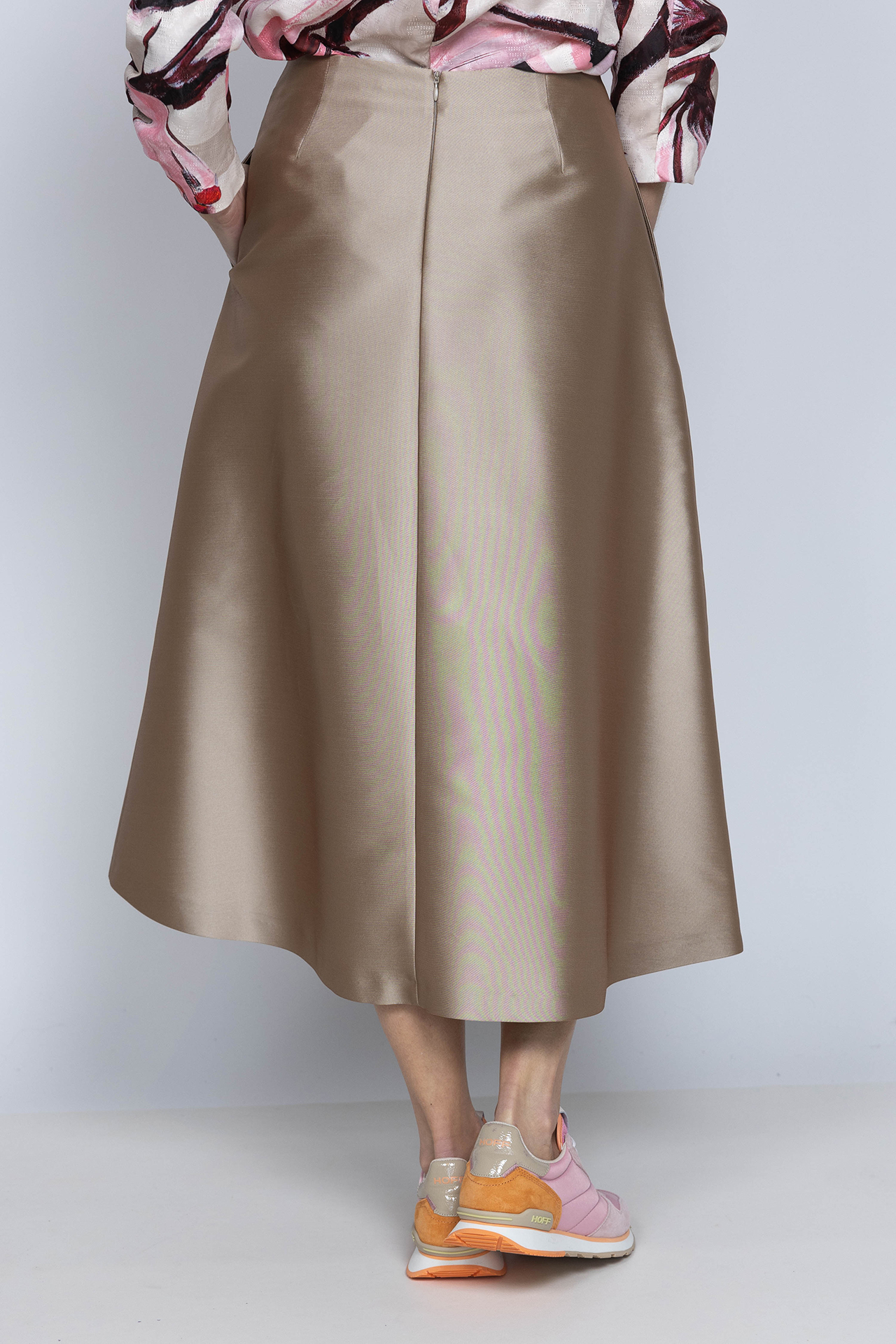 Lange glanzende A-lijn rok met een rits aan de achterkant en steekzakken en plooien aan de voorkant