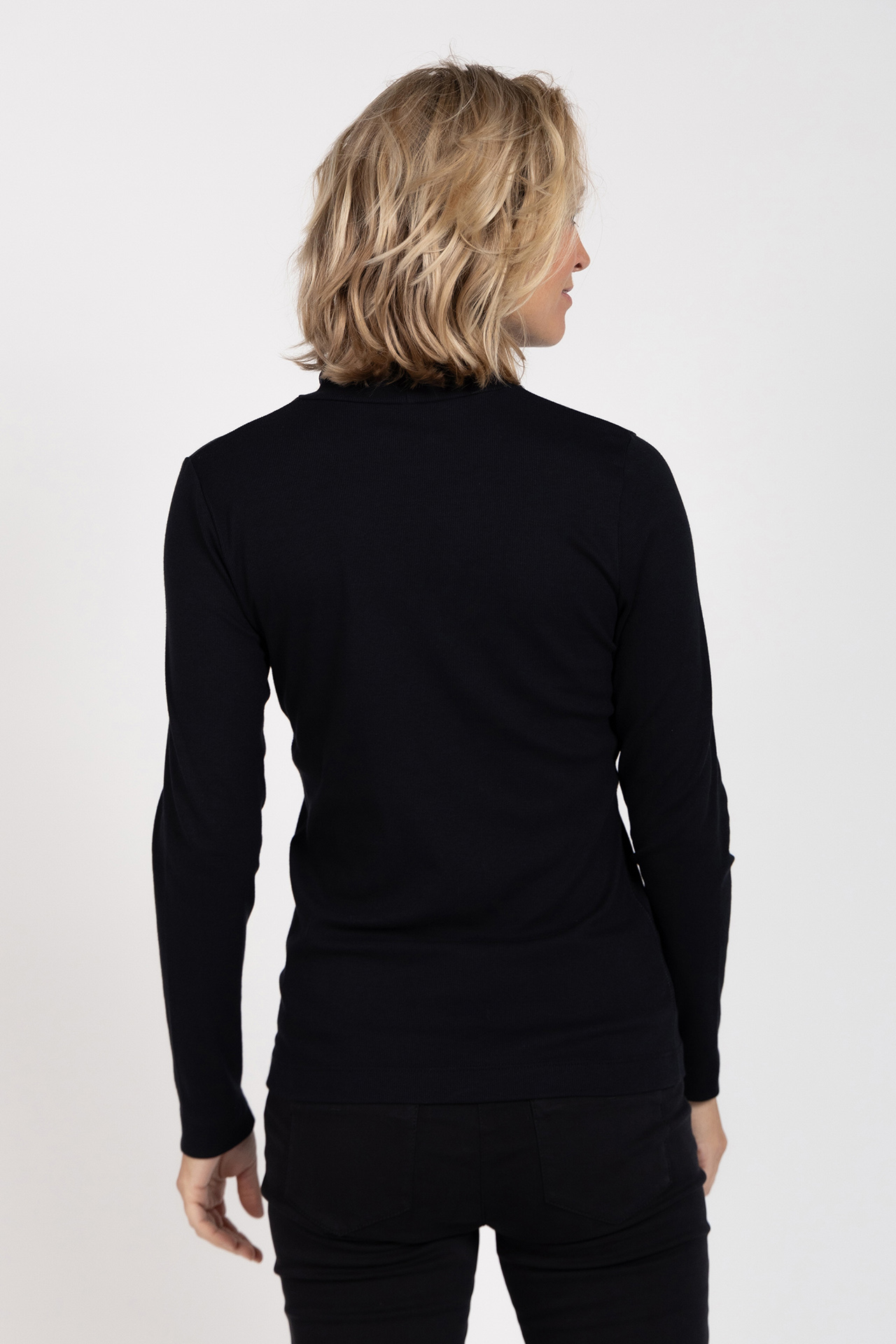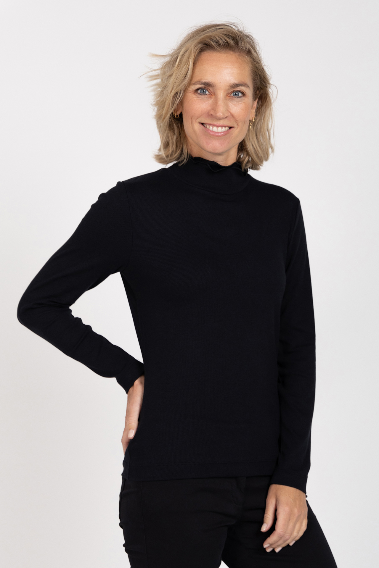 Col t-shirt met lange mouwen en een dubbele kraag met geschulpte randjes. Dit item is er in verschillende kleuren
