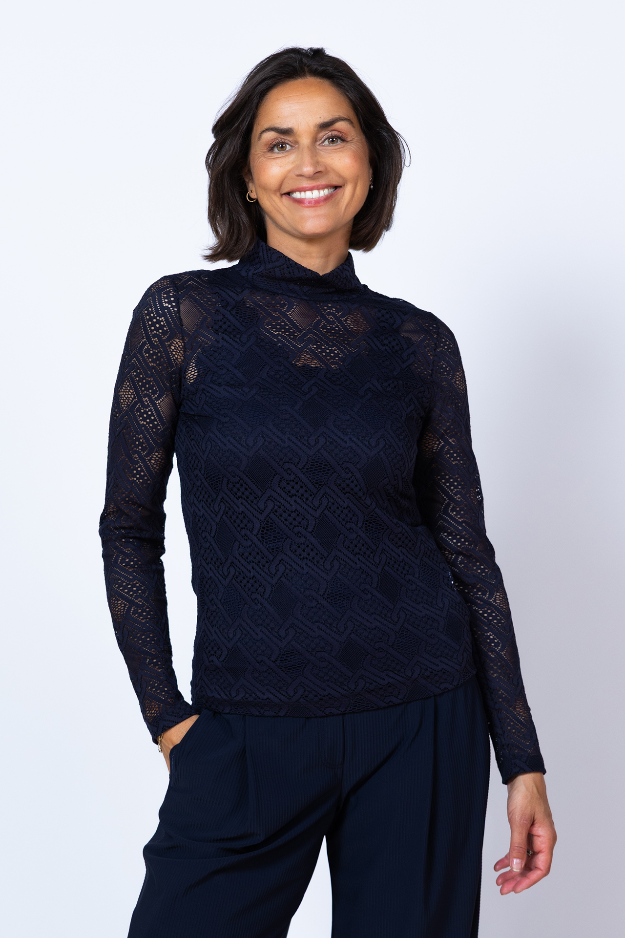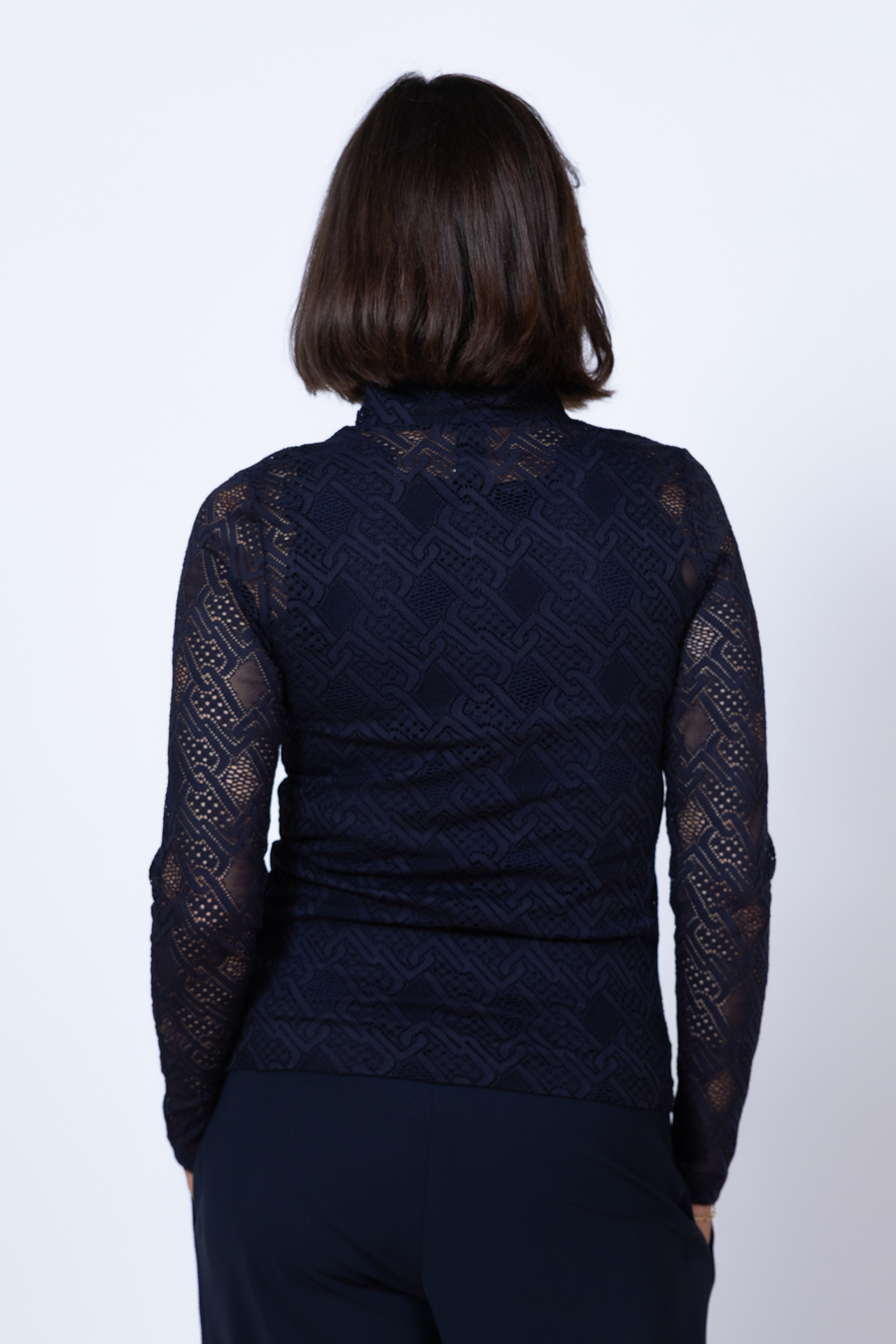 Opengewerkte col t-shirt met lange mouwen en stretch in de stof