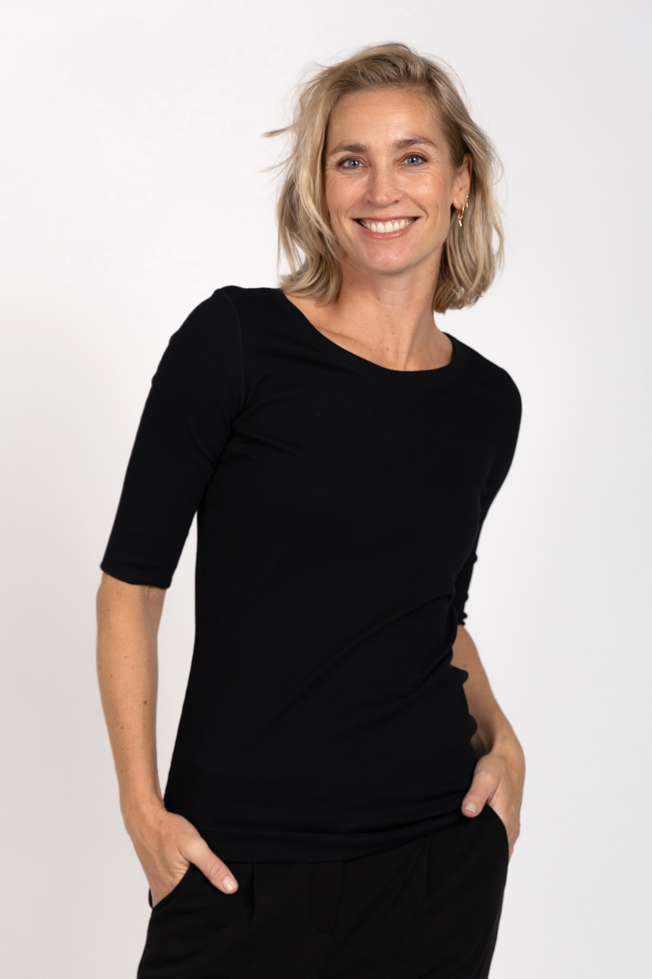 Katoenen t-shirt met een ronde hals en driekwart mouwen die je ook leuk een randje om kunt slaan
