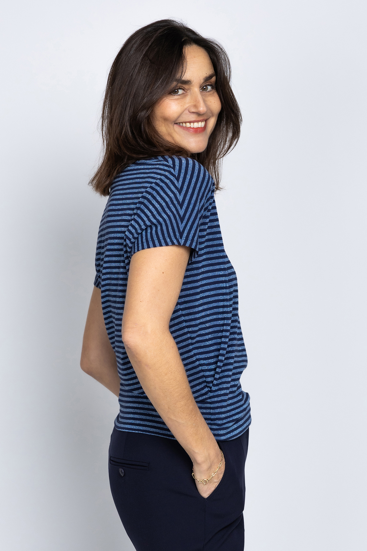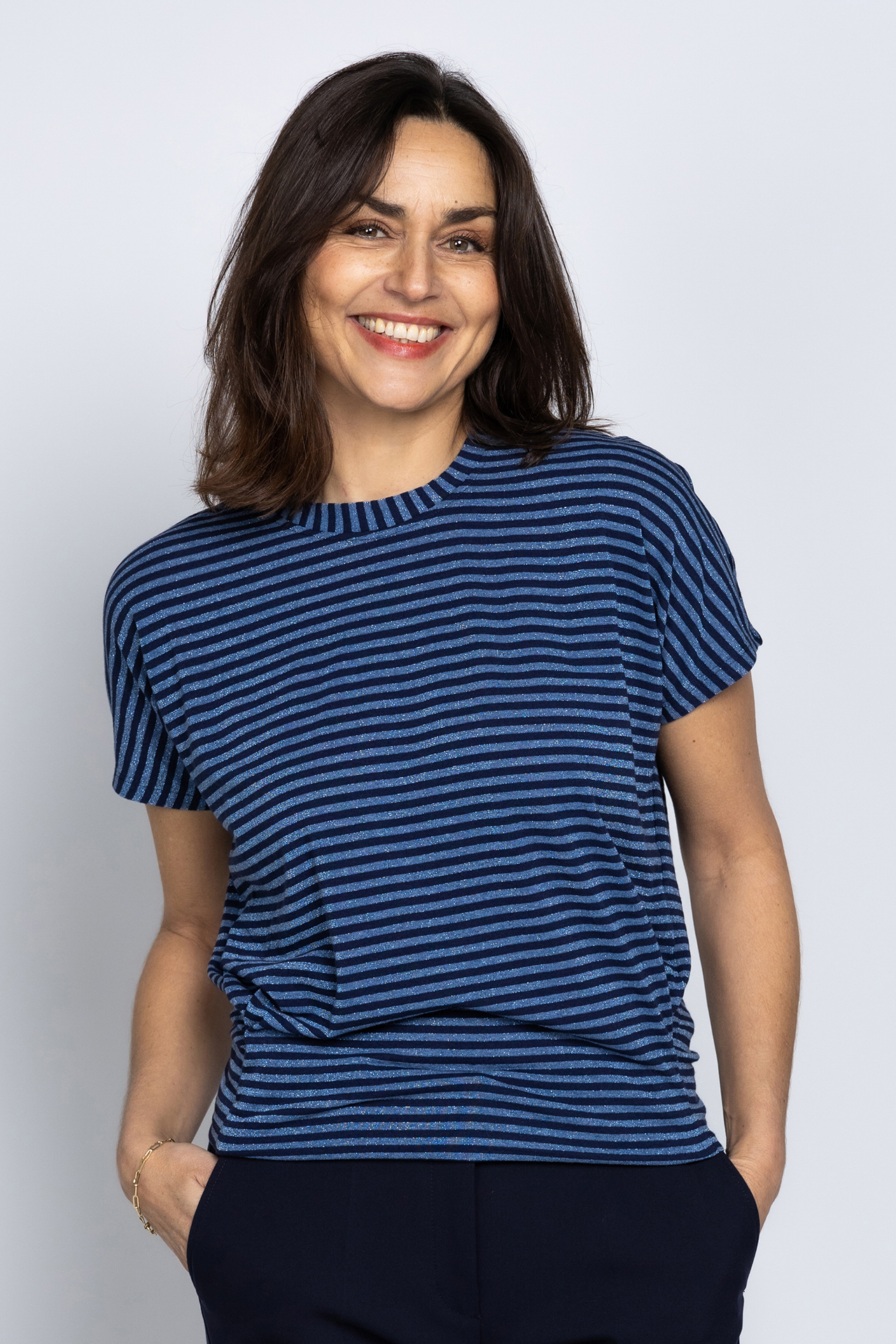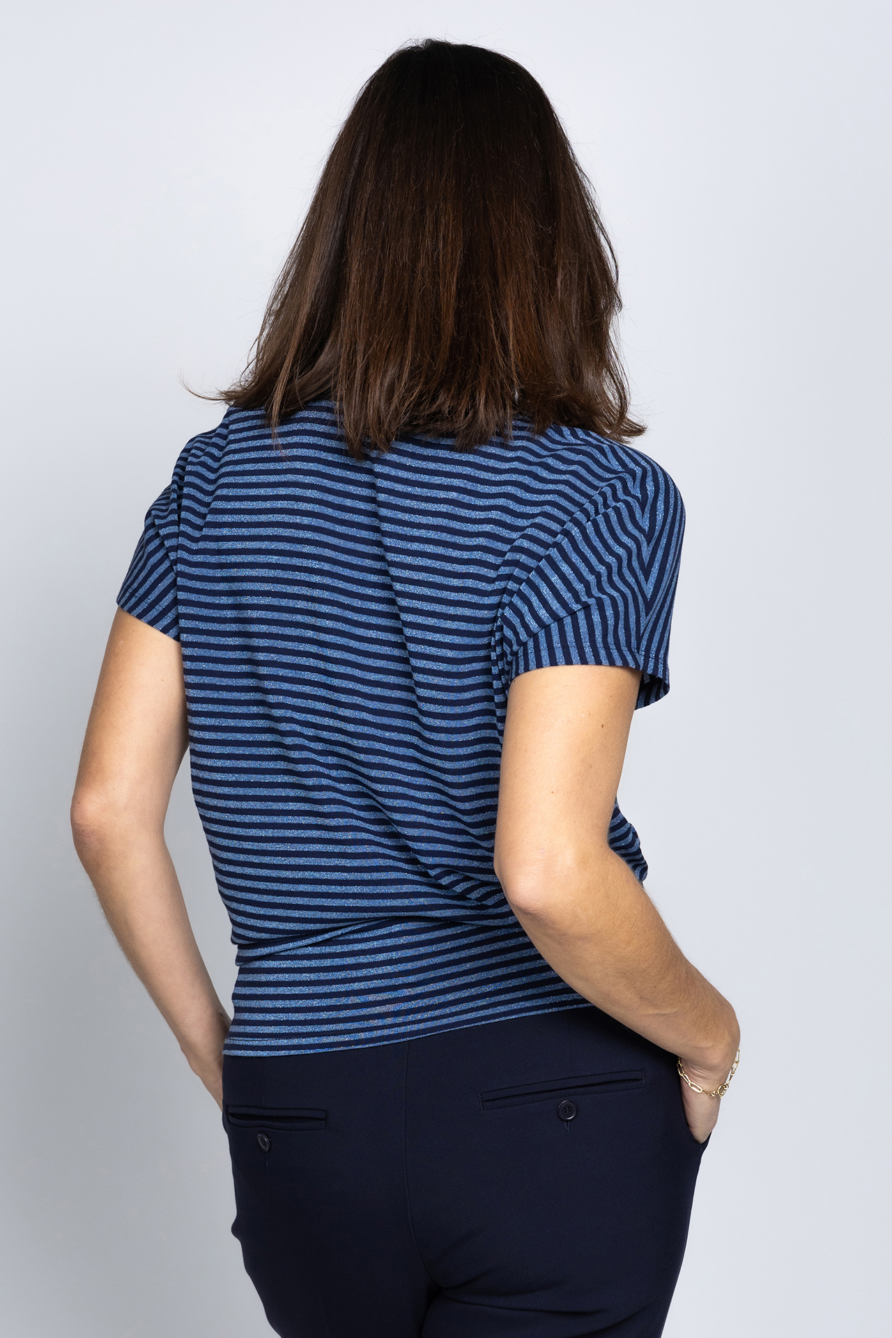 Gestreept t-shirt met een ronde hals en kapmouwtjes. Hij heeft plooitjes aan de voorkant aan de zijkant en glitters in de stof