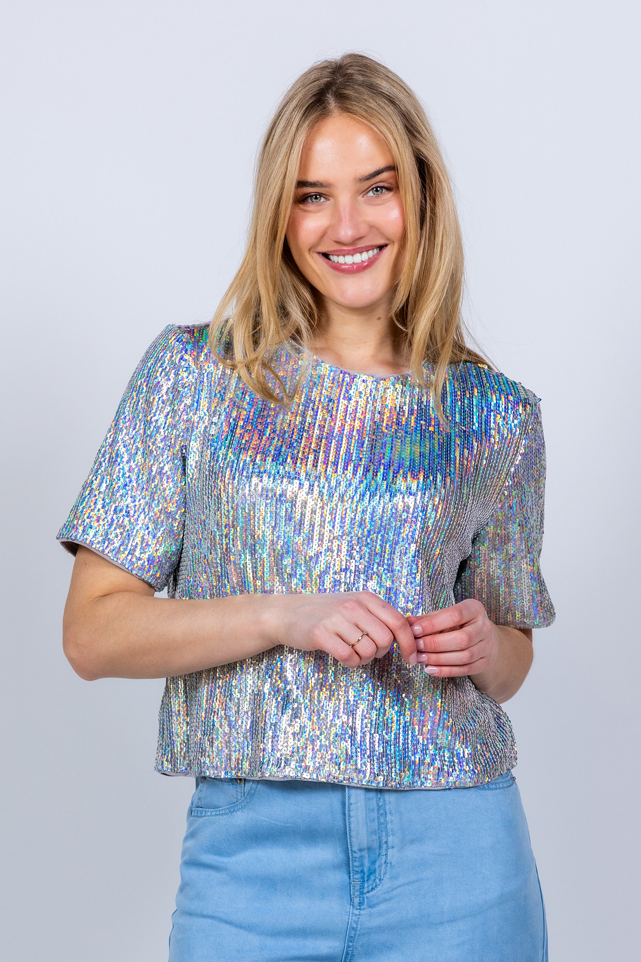 Pailletten t-shirt met een ronde hals en korte mouwen. Er zit een klein beetje stretch in waardoor hij comfortabel draagt