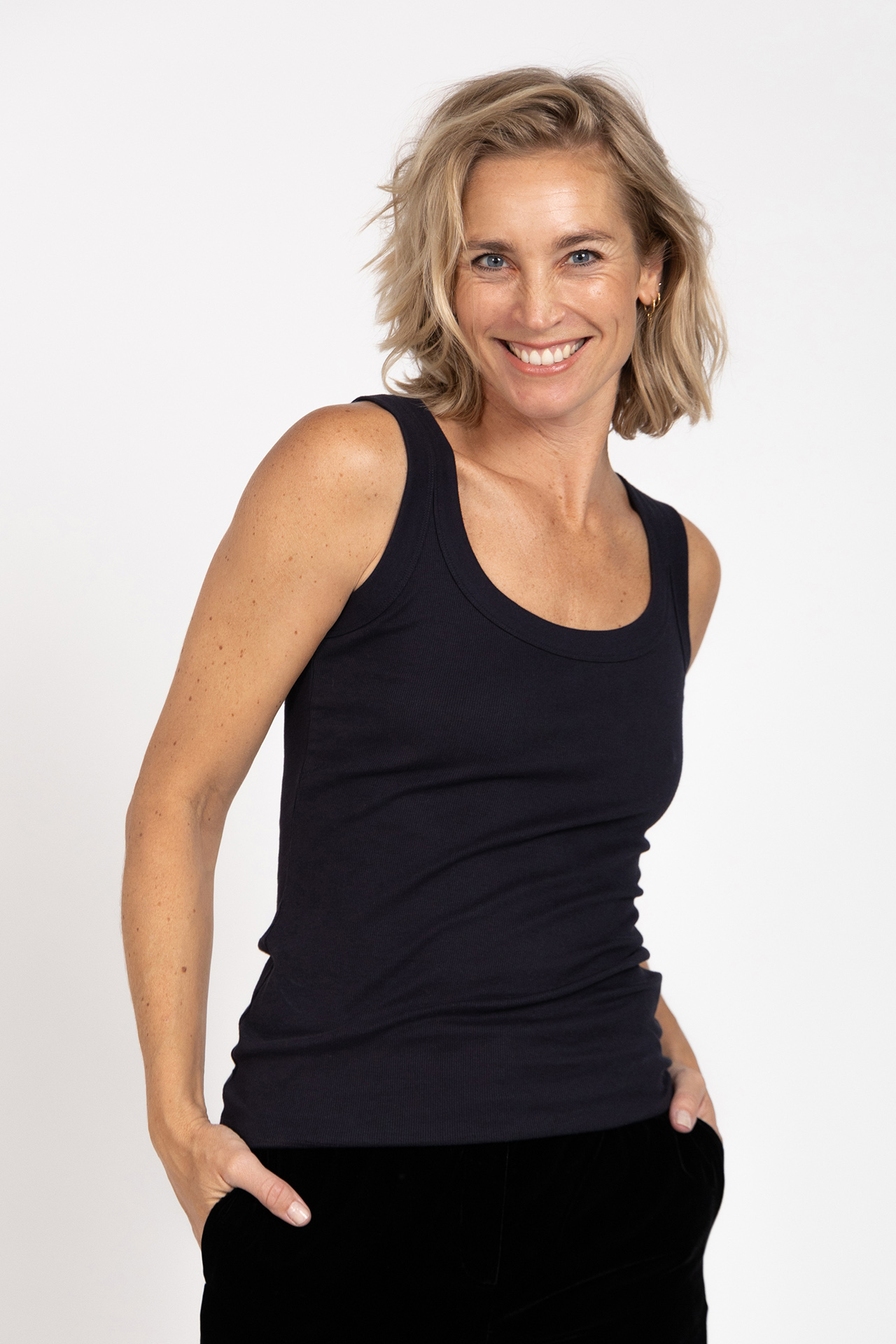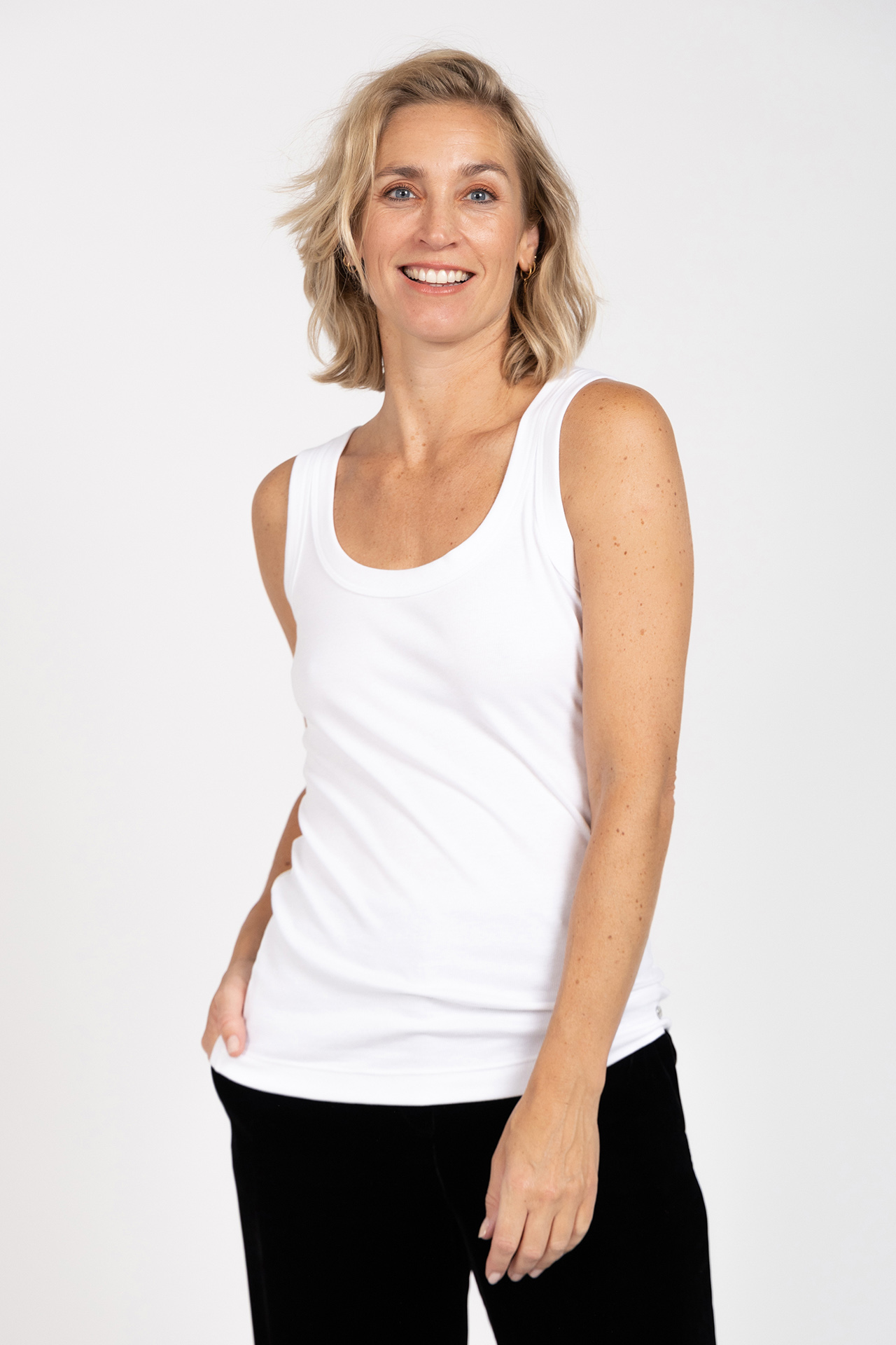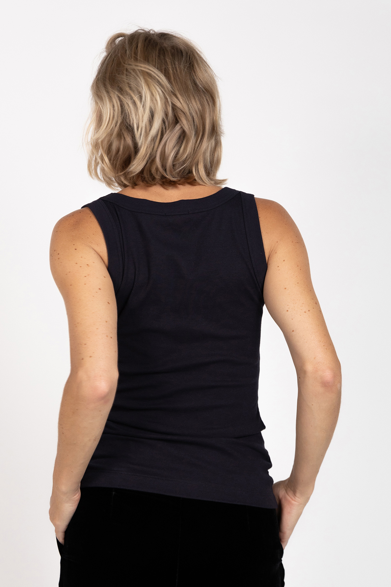 Katoenen tanktop van een fijn geribd materiaal. Deze top is er In zwart/marine en wit