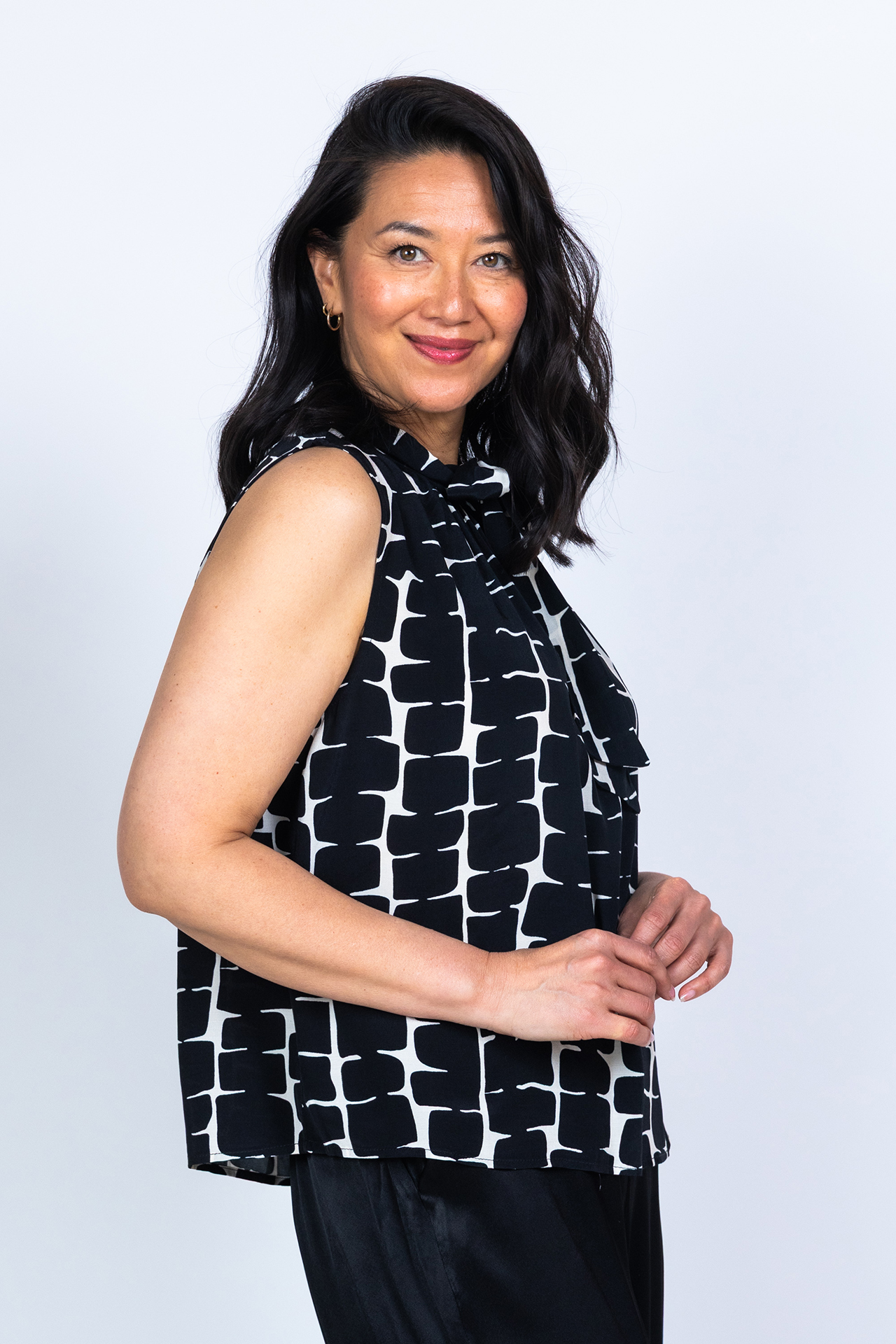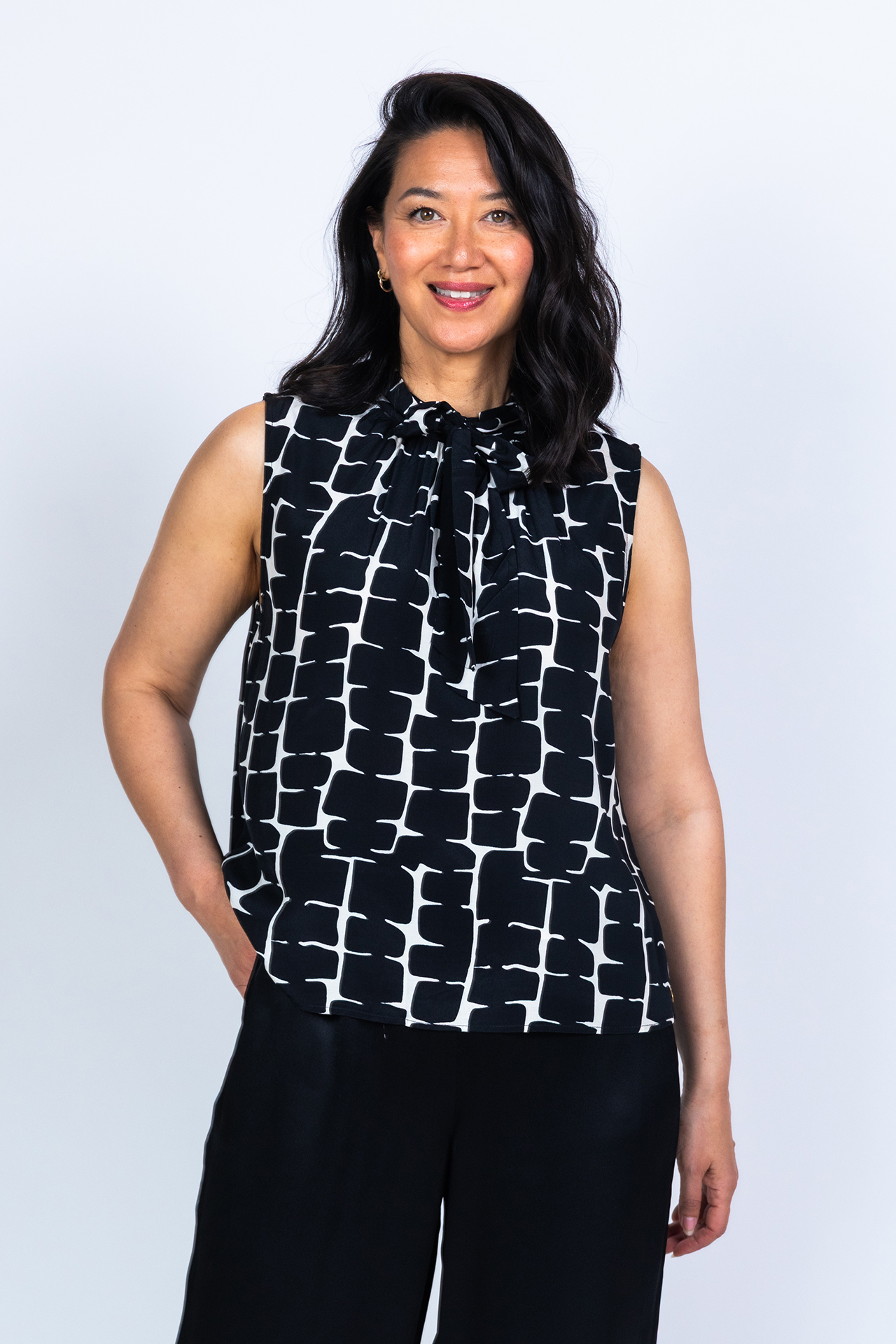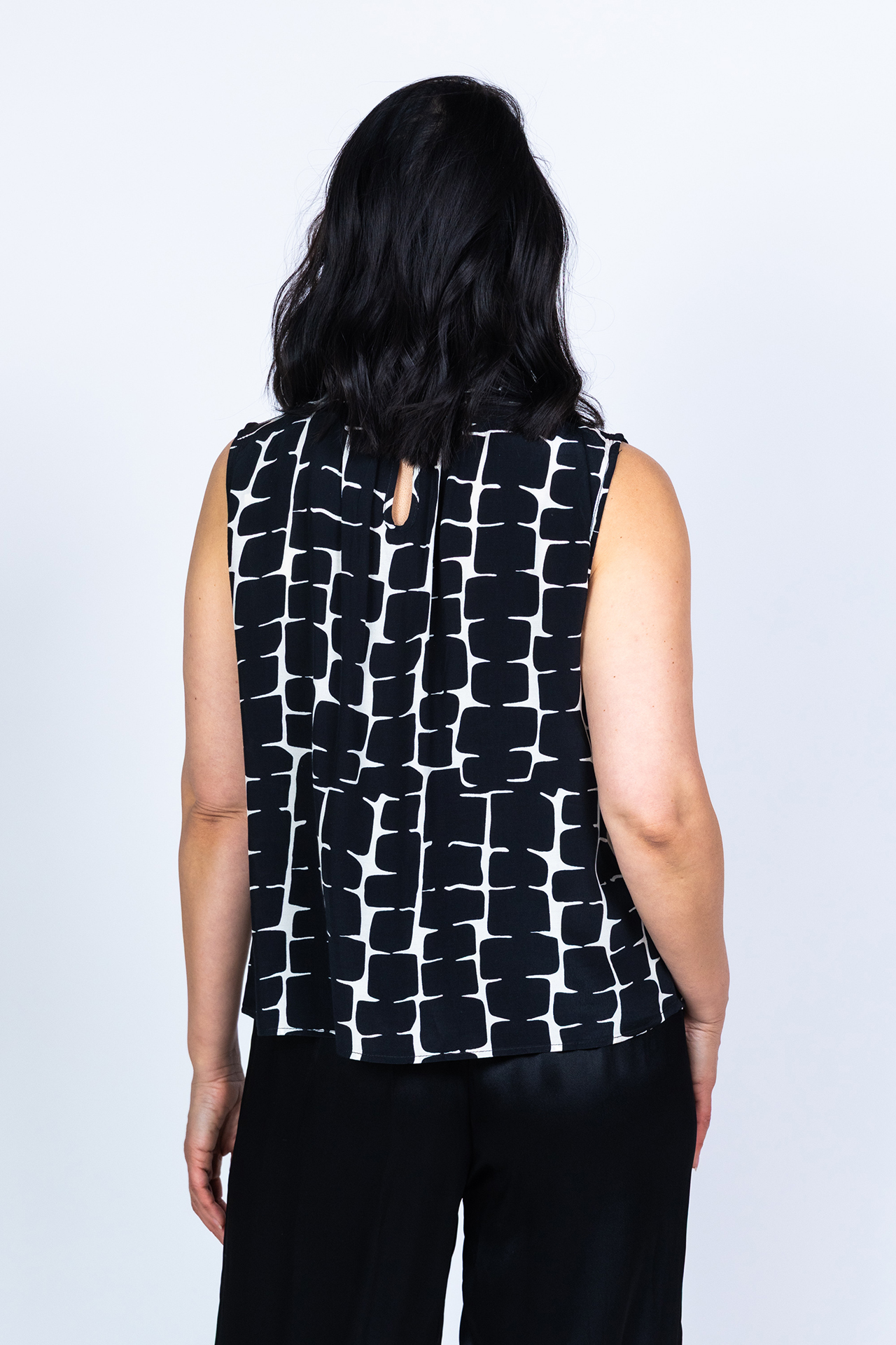 Mouwloze top met een strik aan de hals en een all-over zwart/wit print