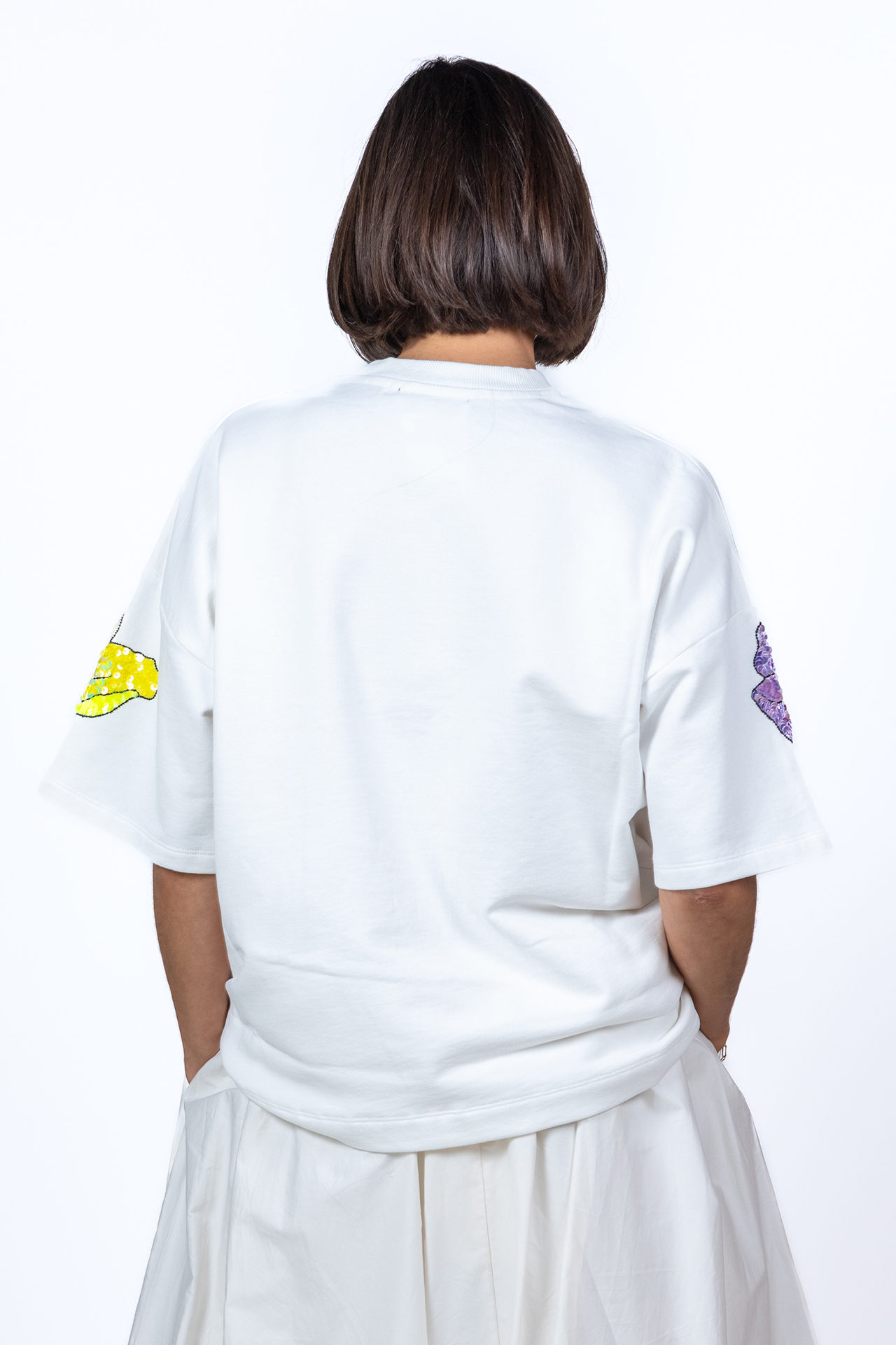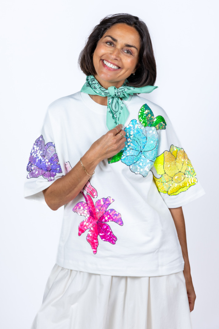Katoenen sweater met korte mouwen, een ronde hals en hij heeft gekleurde bloemen met pailletten