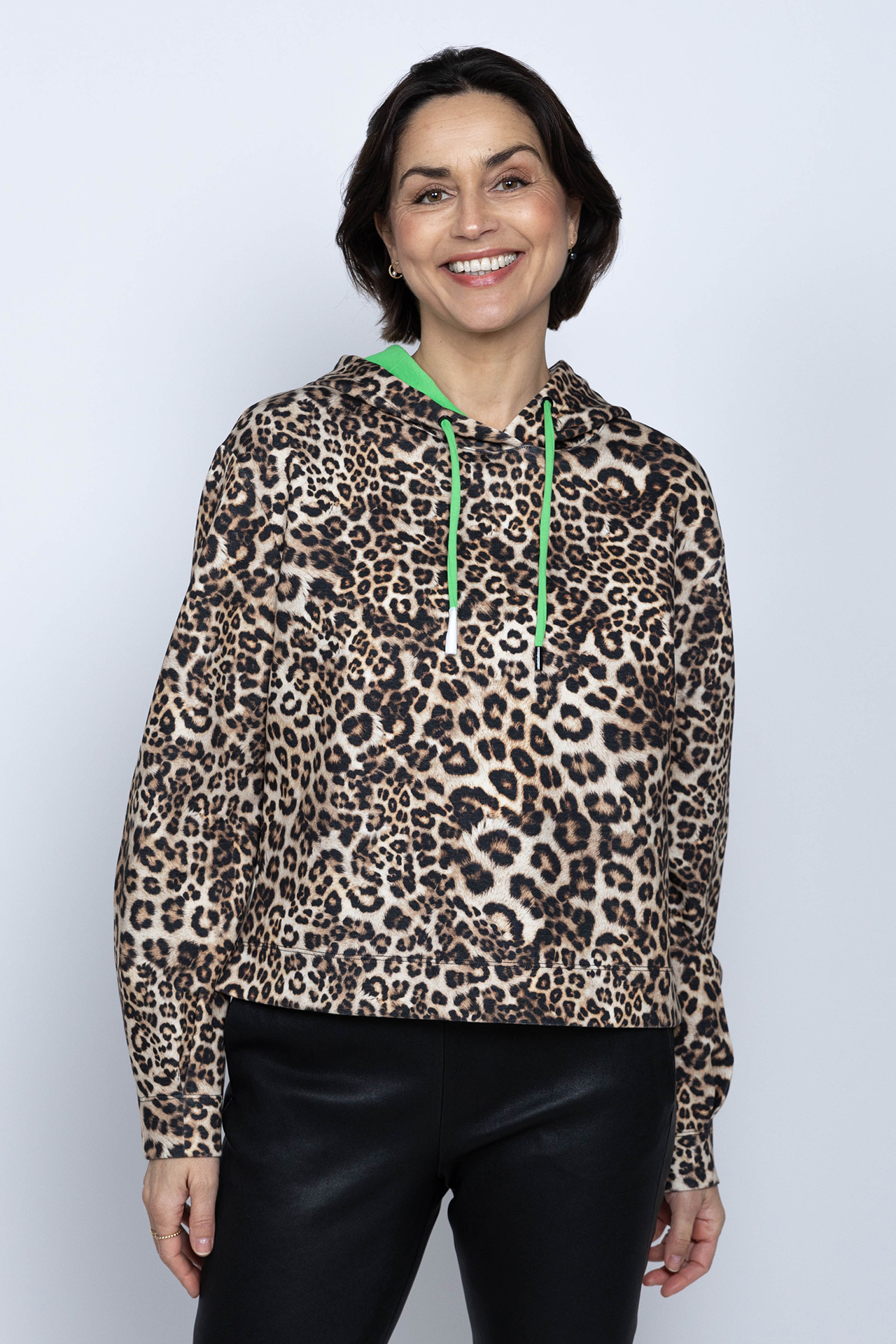 Dierenprint sweater met een capuchon met een groene binnenkant. Hij heeft groene koordjes en stretch in de stof waardoor hij comfortabel draagt