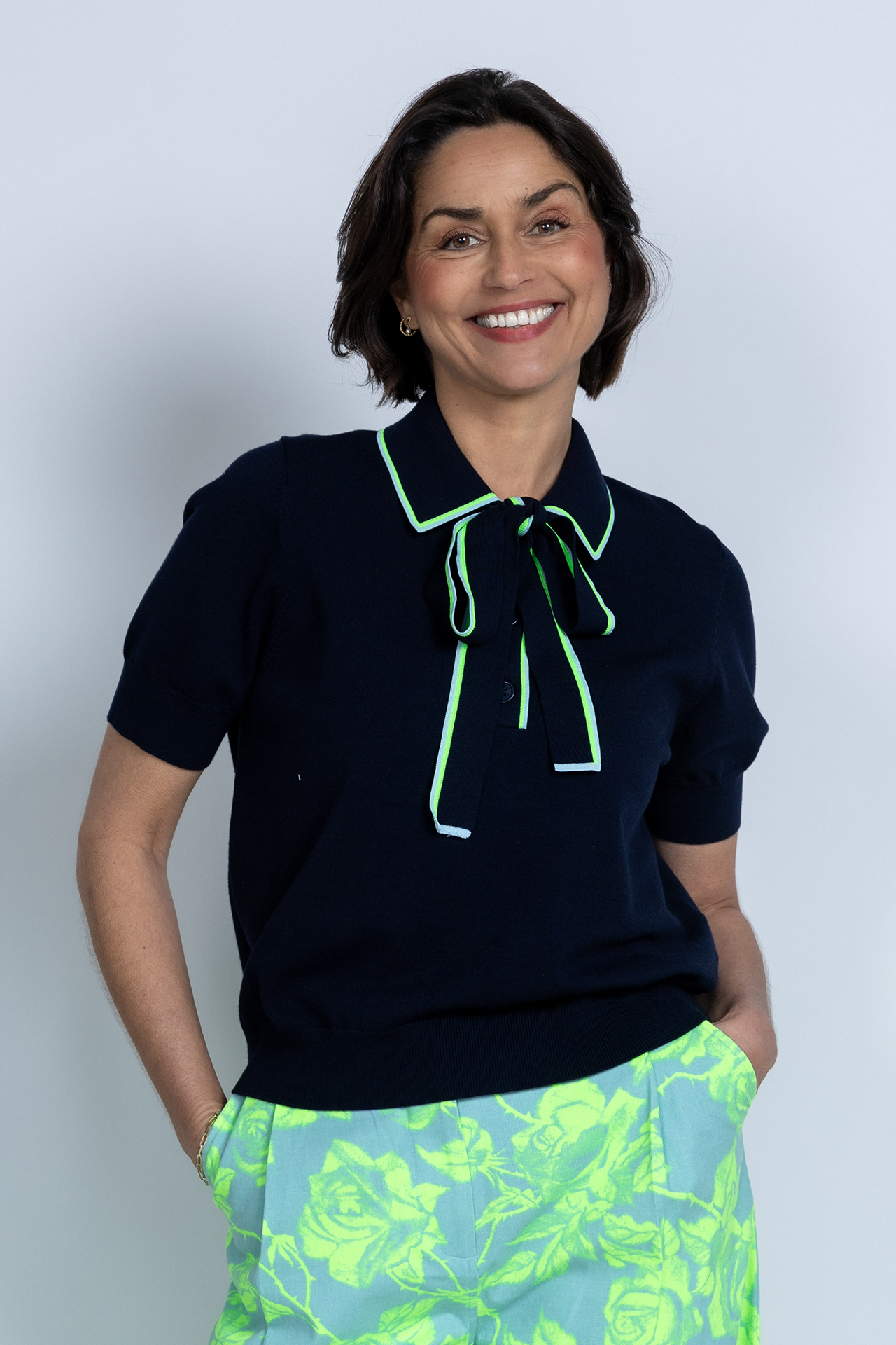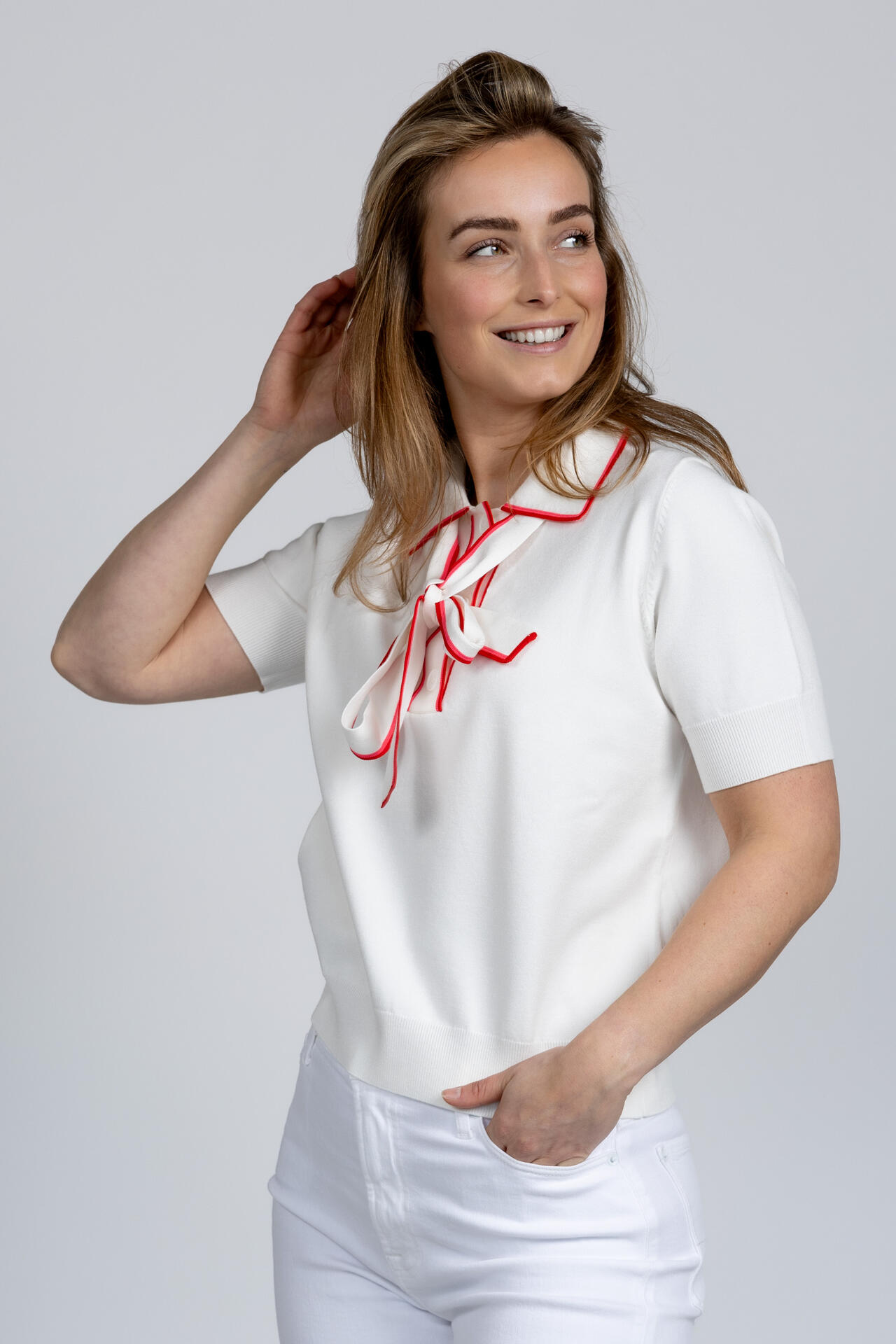 Polo met een strik aan de hals en leuke rode details aan de kraag en strik