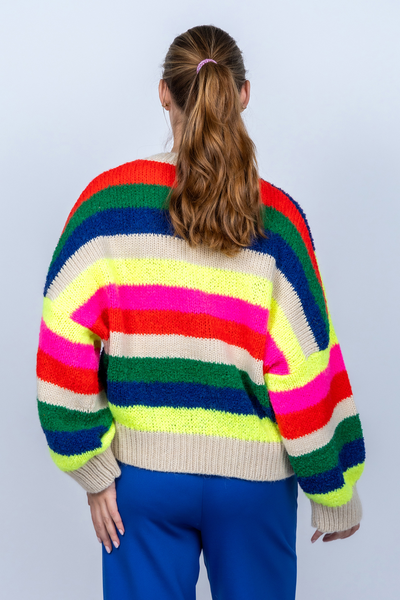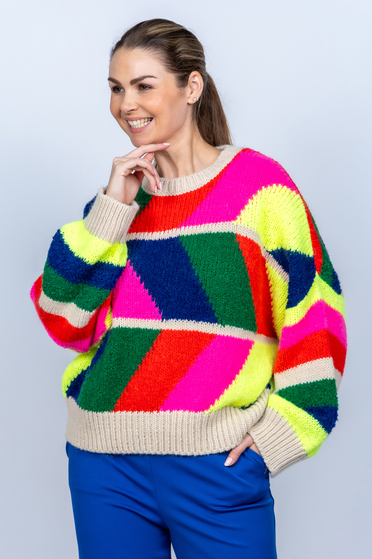 Gebreide trui met beige boorden en een felgekleurd dessin