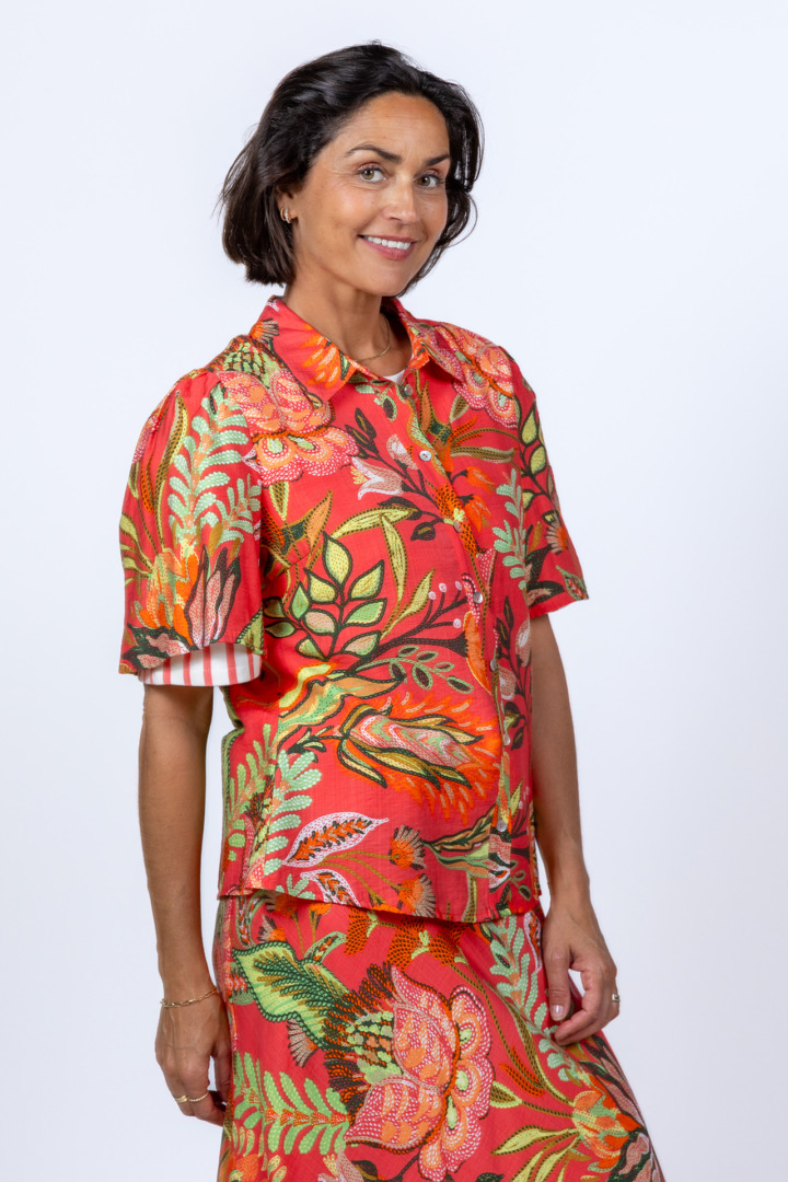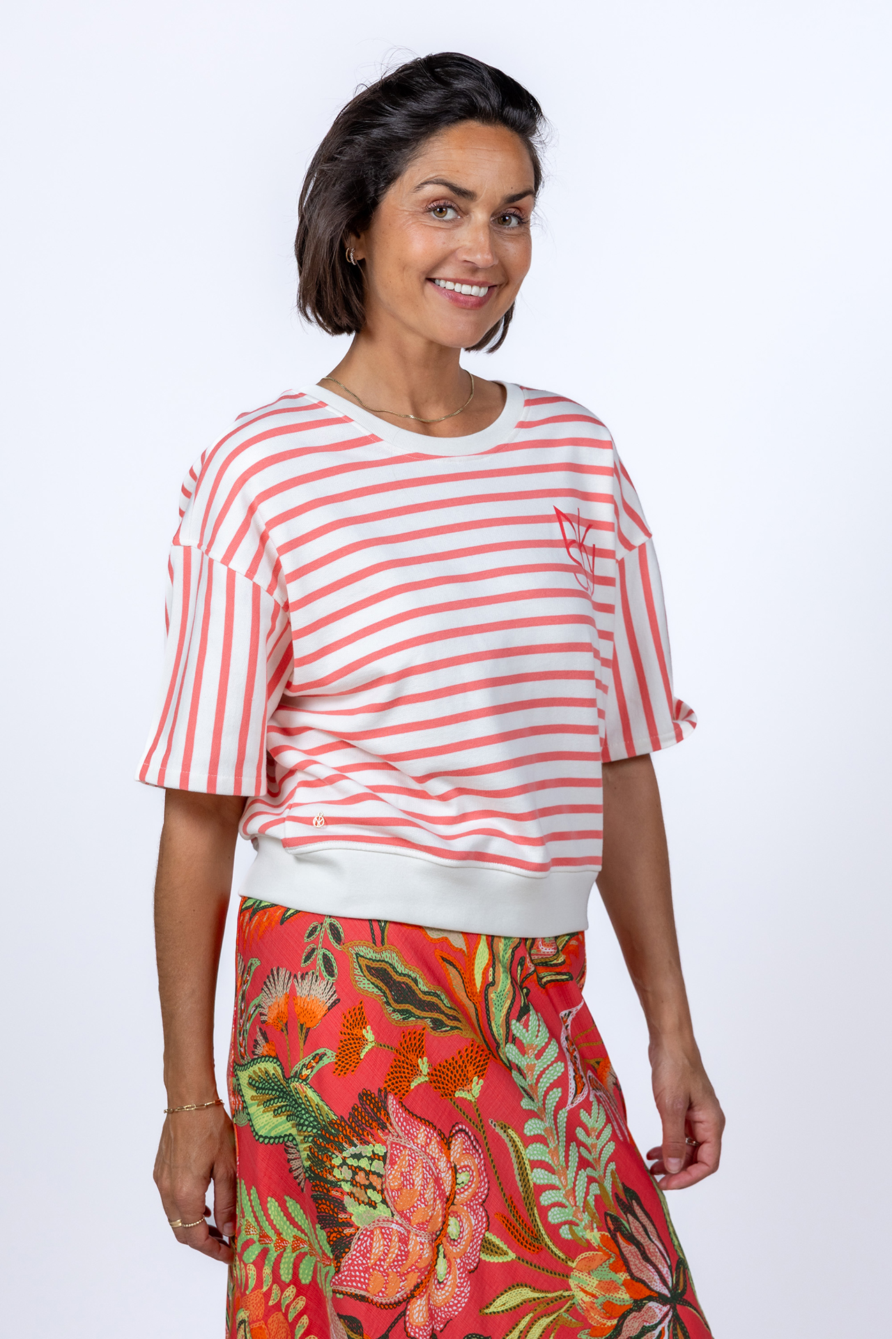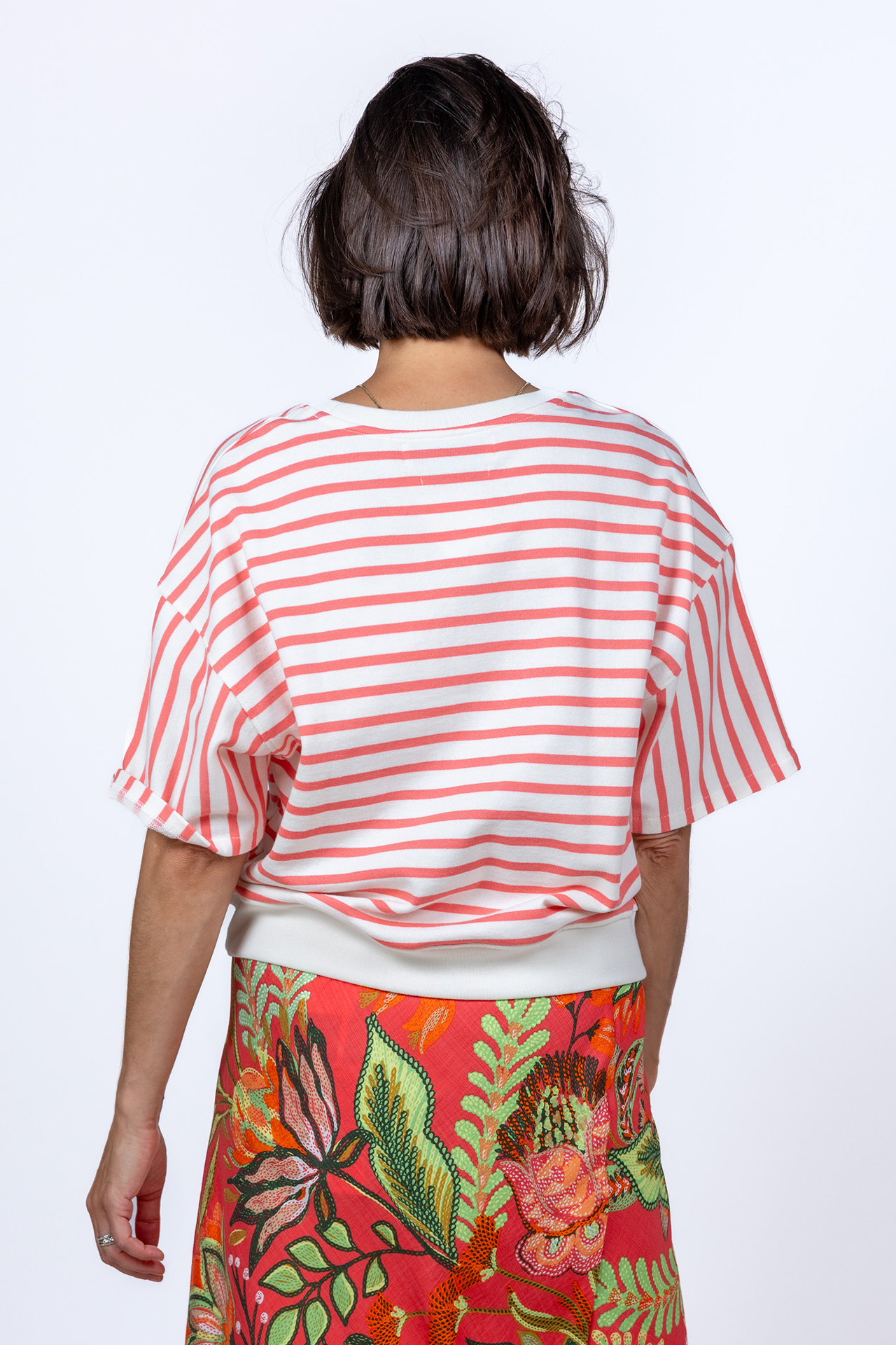 Katoenen trui met korte mouwen, een ronde hals, gestreept dessin en een witte geribde boord aan de onderkant