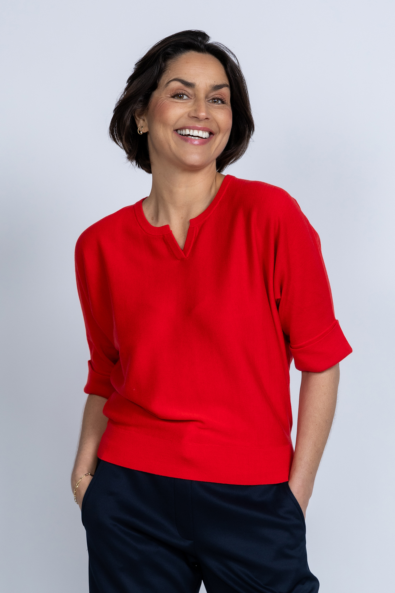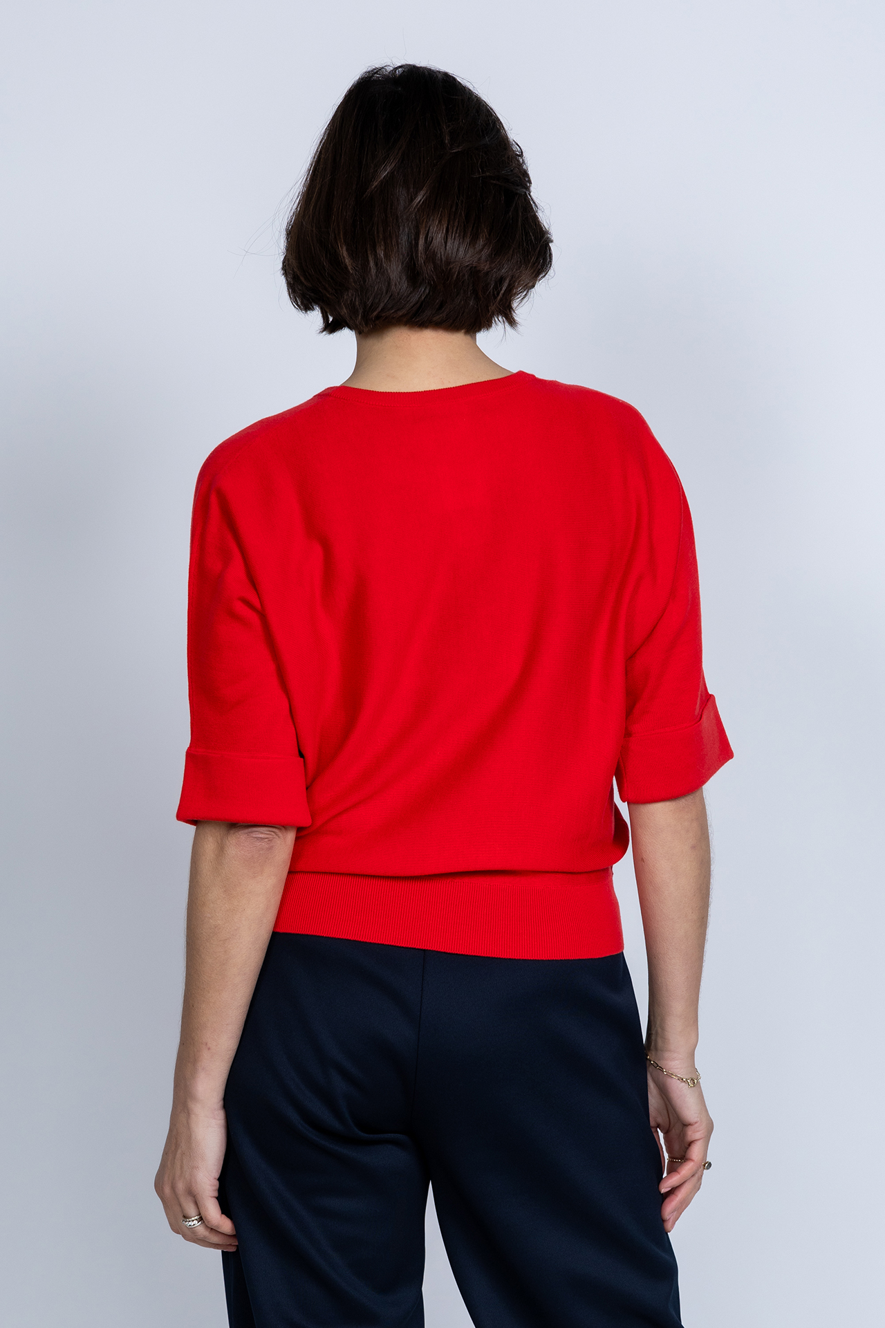 Loose fit truitje met een ronde hals met V-uitsparing en korte mouwen met een omslag