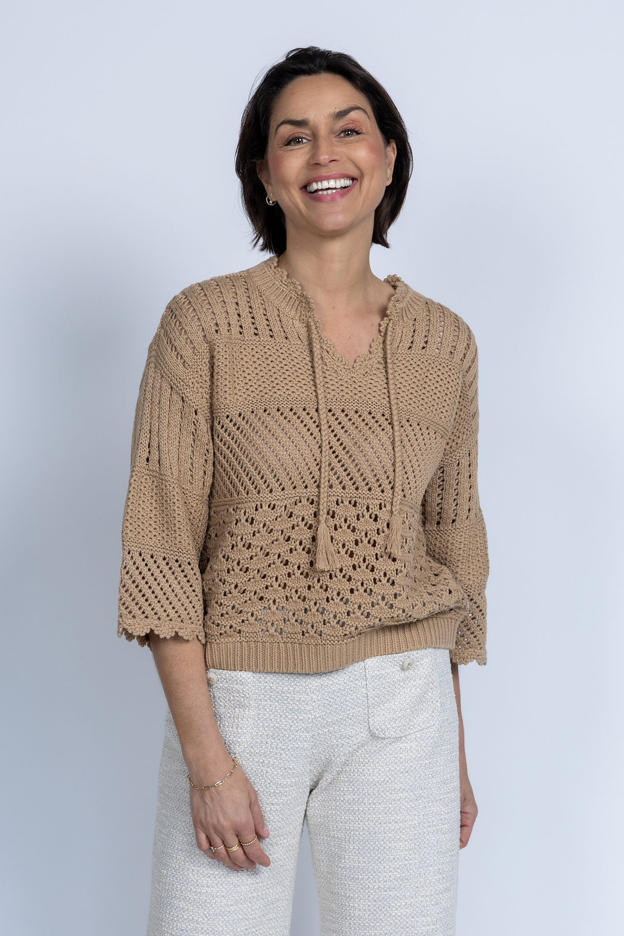 Open gebreide katoenen trui met een V-hals, driekwart mouwen en koordjes aan de hals