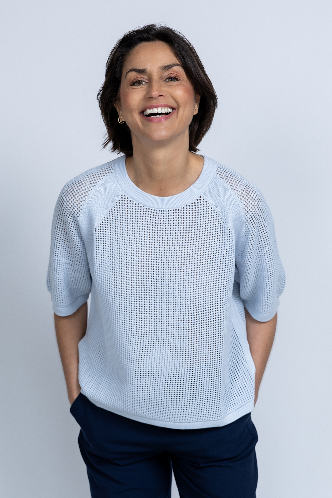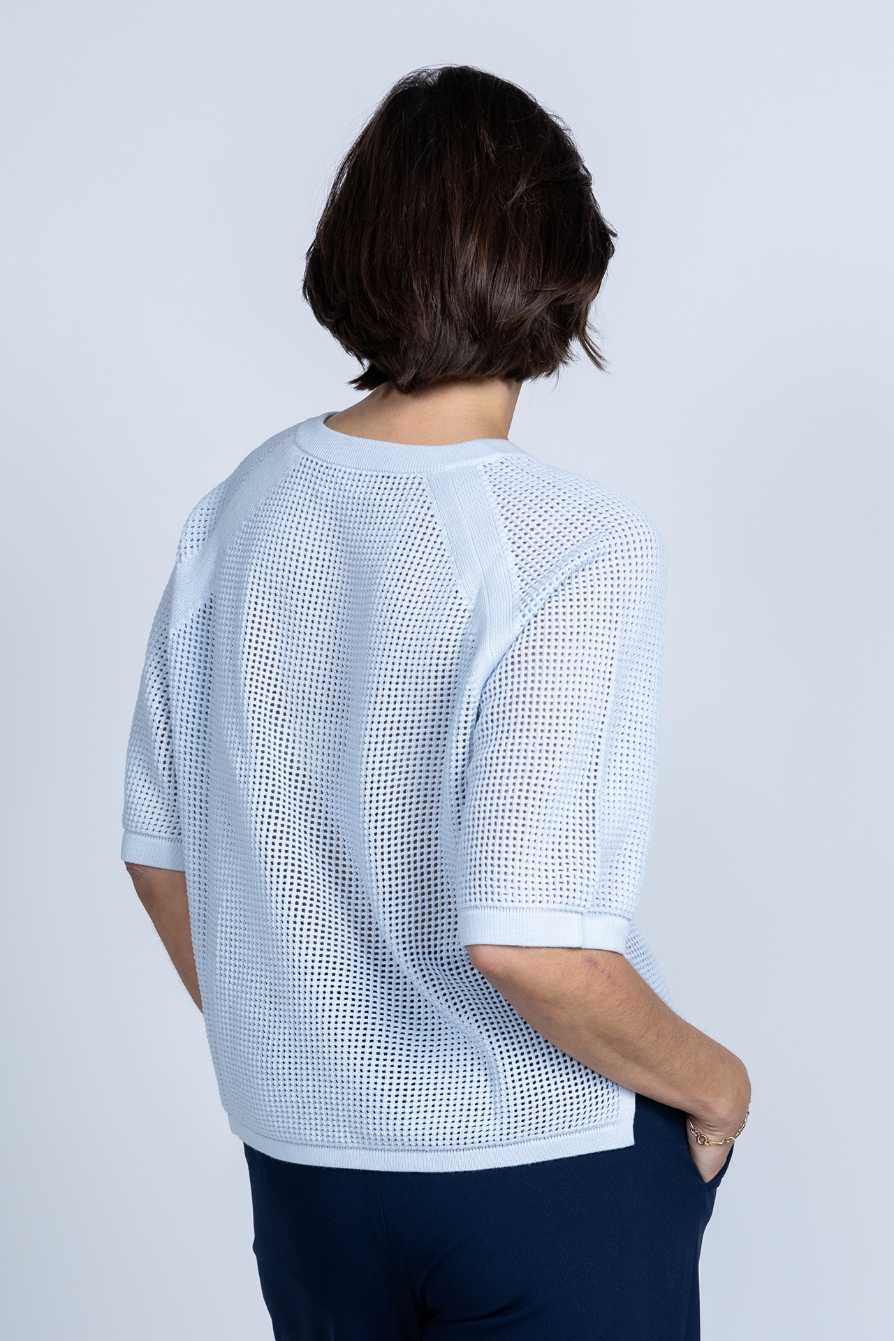 Open gebreid truitje met korte raglanmouwen en een ronde hals